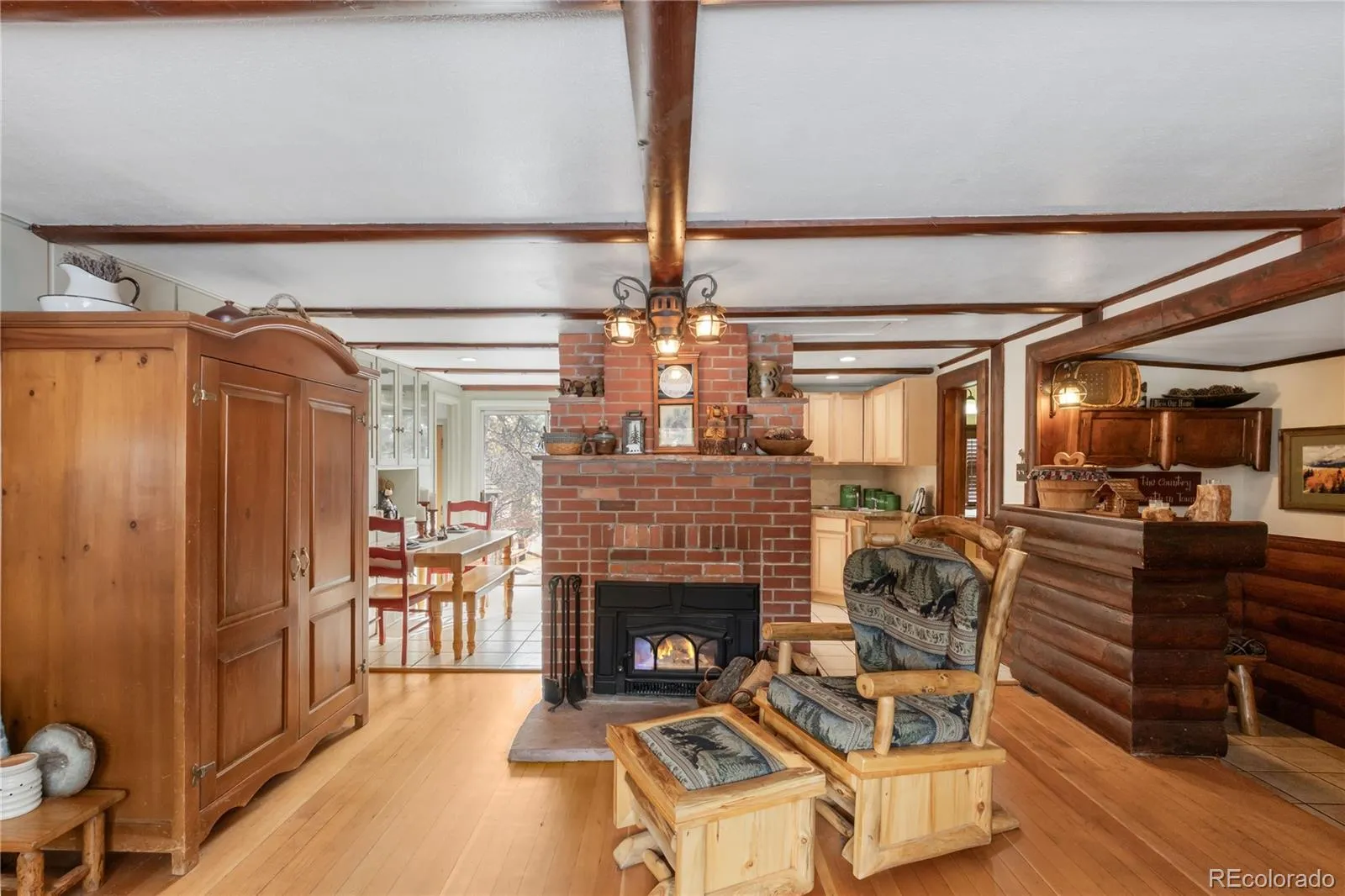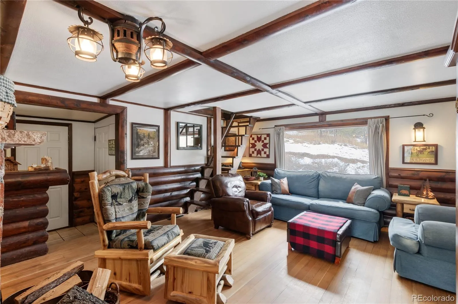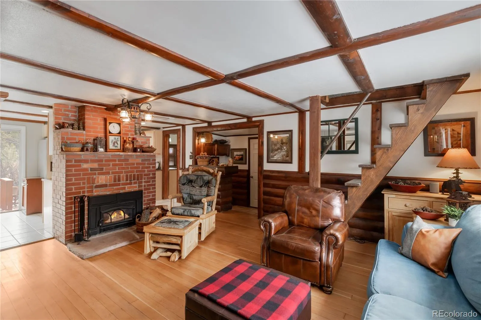 Set on a quiet dead-end street, this 3-bedroom, 1-bath meticulously cared-for home is rich in character and mountain charm. The sunlit living room features hardwood floors, rustic log beam ceilings, and a cozy wood-burning fireplace. The kitchen showcases original built-ins for storage and stainless steel appliances.