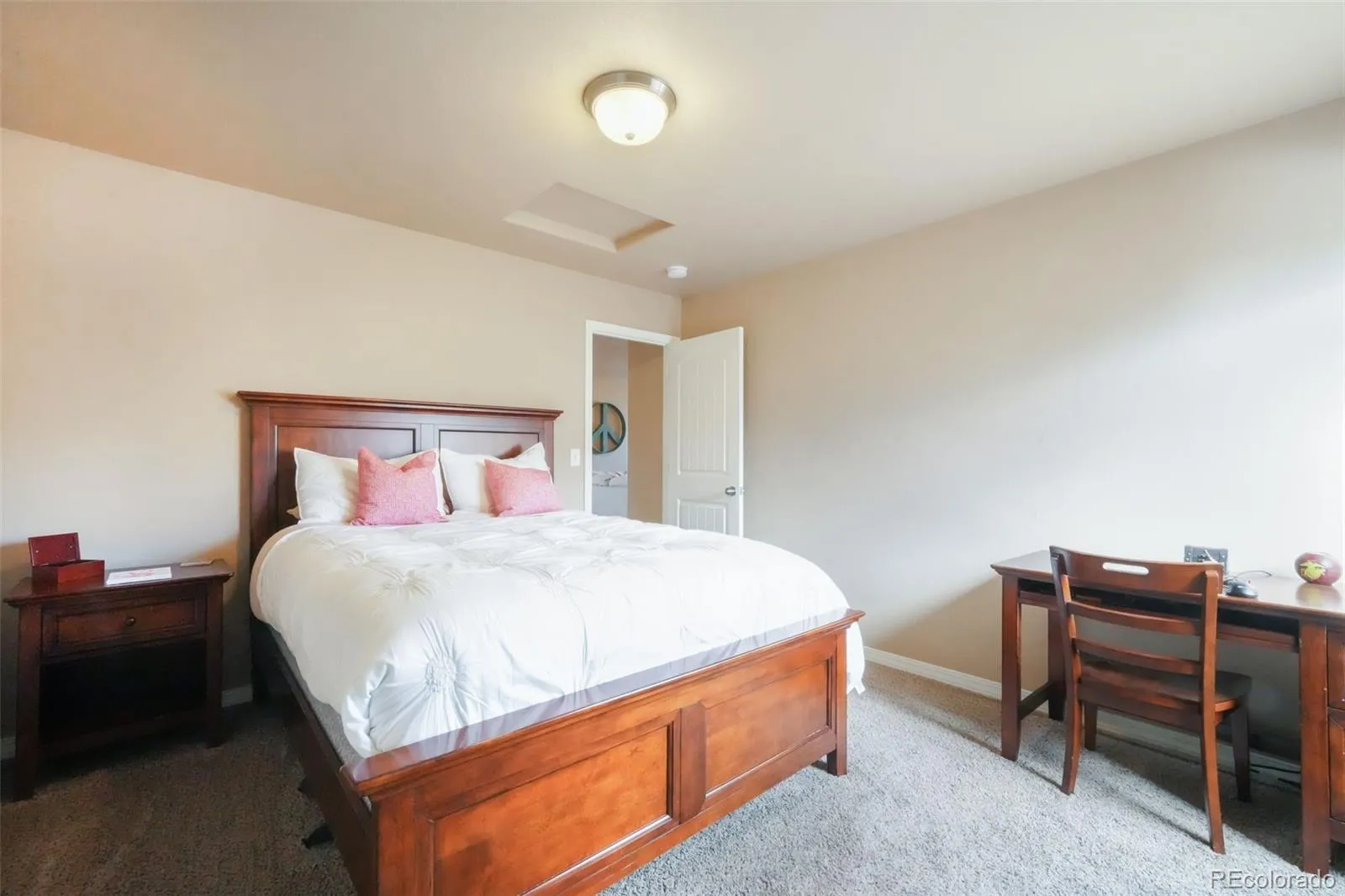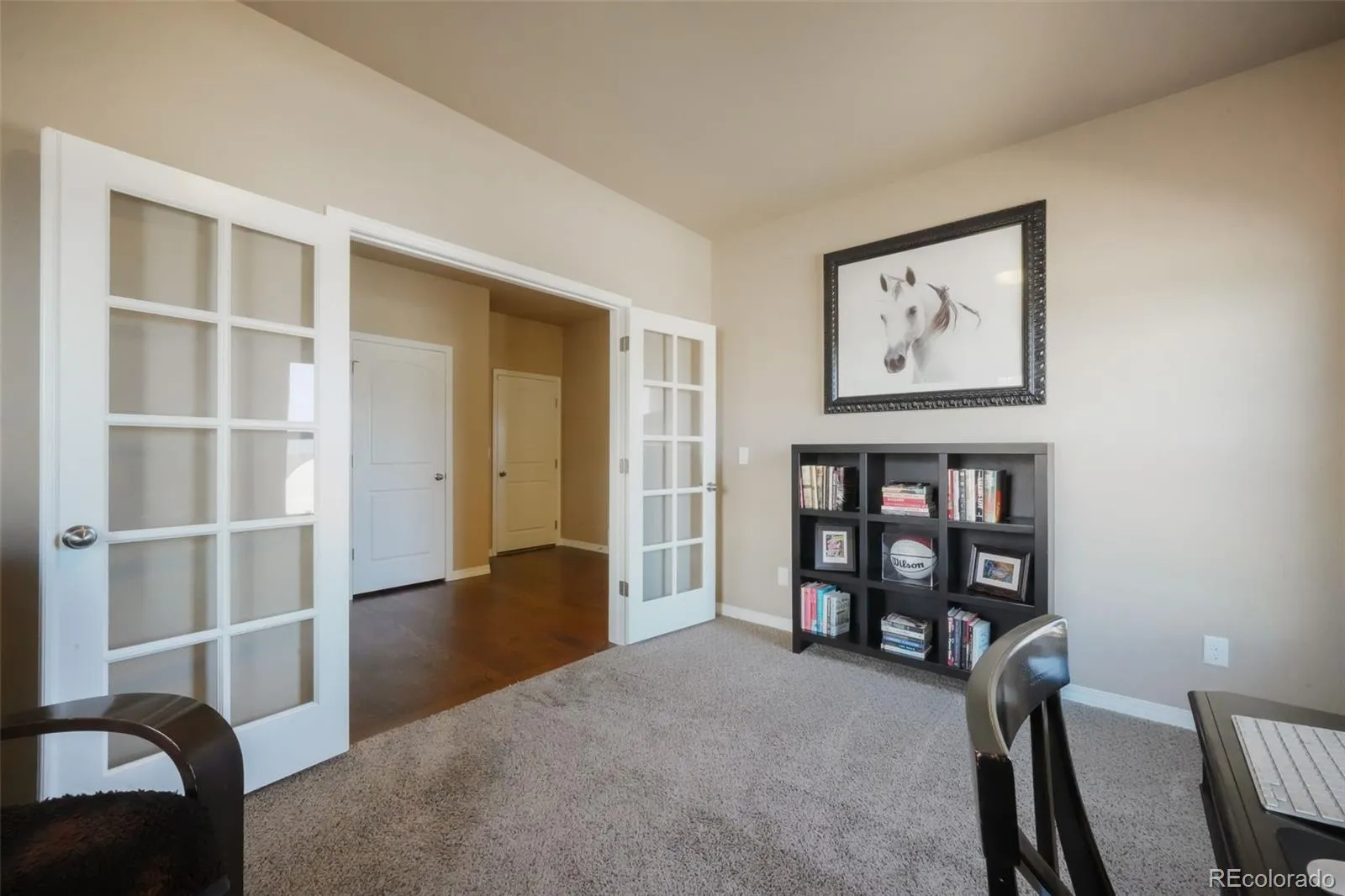 Inside, the open floor plan features hardwood floors, upgraded carpet, and designer tile finishes throughout. The gourmet kitchen showcases stainless steel appliances, double wall ovens, solid granite countertops, a large walk in pantry, and a gas ready cooktop, making it perfect for both cooking and entertaining. The formal dining area flows seamlessly to a covered outdoor patio through French doors, creating an ideal space to enjoy Colorado sunrises and sunsets year round.