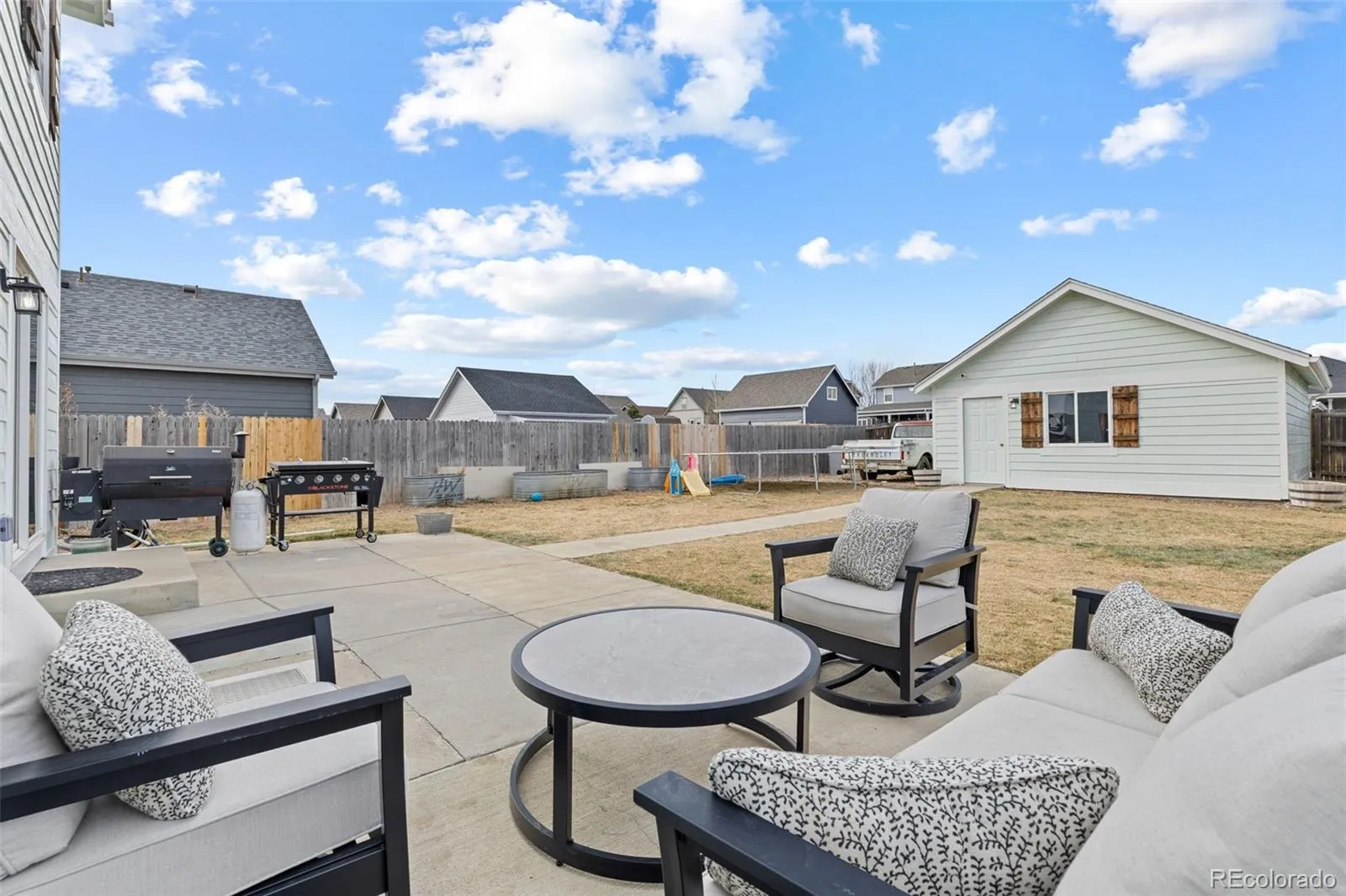 Outside, the well-maintained exterior shines with a new roof installed in 2023, a large shed, and a spacious detached two-car garage. Situated on a large lot, the outdoor space offers a sprinkler system, garden beds, and a concrete patio—perfect for entertaining and enjoying those unforgettable Colorado nights. The home also includes a hardwired security system, which will be included for added peace of mind.