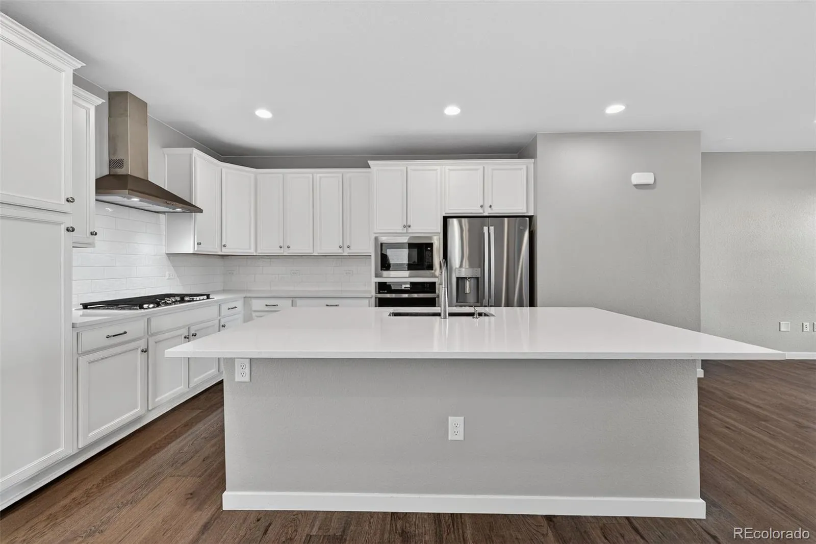 Inside, three levels of well-proportioned space showcase thoughtful design and quality finishes. The main level features an open-concept layout where a spacious family room flows into an oversized kitchen—ideal for gatherings and daily living. The kitchen boasts quartz counters, upgraded appliances, a full tile backsplash, and a large island with ample prep space. A conveniently located powder room serves this main living area, and expansive windows bring in abundant natural light.