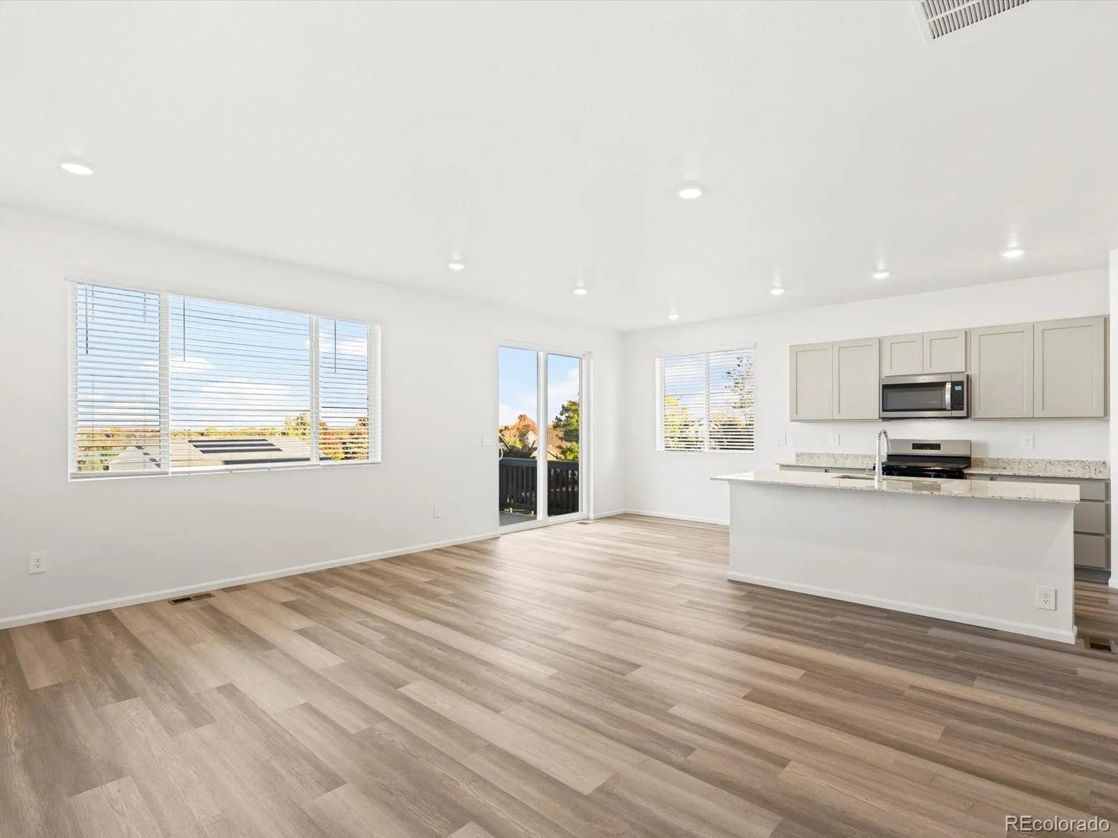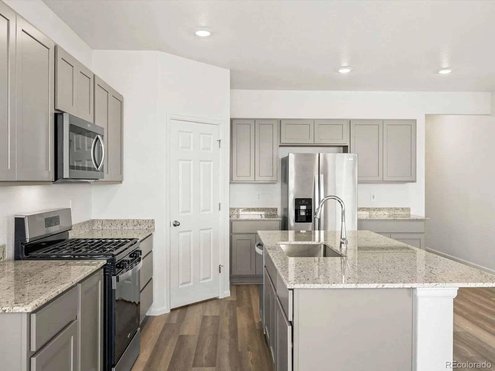 Open concept kitchen with granite countertops and pebble cabinets!