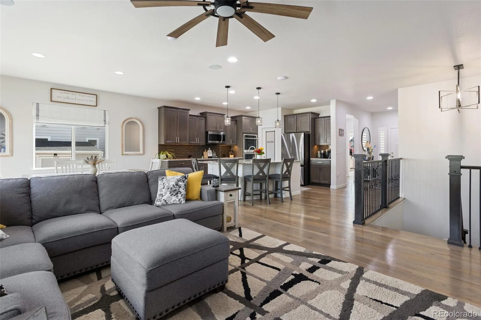 Welcome home to an award-winning ranch floor plan that combines the simplicity of main level living w/modern elegance to elevate your living space both inside & out. Located in a desirable location, you will feel the stress of the day melt away as you walk in the door & the feeling of home surrounds you. Boasting an oversized island w/enough seating for 4, separate dining area, large walk-in pantry, & double ovens, the kitchen will be the place to gather. In the living room you will find the linear gas fireplace with floor to ceiling stone, making it a focal point of the room. With an oversized back door & large windows, natural light fills the space. The primary bedroom just off the living room includes an upgraded 5-piece bathroom with frameless shower, bath tub, double vanity, walk in closet & barn door. On the opposite side of the main level is a second bedroom/office with a full bathroom allowing privacy for guests or work from home. Finishing off the main level is the separate laundry area w/ utility sink & cabinets and mud room. The lower level is finished w/2 additional bedrooms, a third full bathroom, large family room, second gas fireplace & 9ft ceilings. With an unfinished storage area that is pre-plumbed for a bathroom, there is the option to add a junior suite for additional living space & value. Looking to take advantage of those notorious sunny Colorado days, head outside to the extended back patio w/2 sitting areas, pergola, grass area, play area with trampoline and playset, & 12×10 Tuff Shed. Additional highlights/features of this home include: hickory wood flooring; Wi-Fi connected sprinkler system w/weather tracking; electricity run to the shed, pergola, & water fountain; motorized shades in living room; Ubiquiti video doorbell; blue glass in living room linear fireplace; custom 9′ fabric backdoor slider shade. If you want the look & feel of building a new home but not the headache & extra costs, schedule a showing today for your private tour.