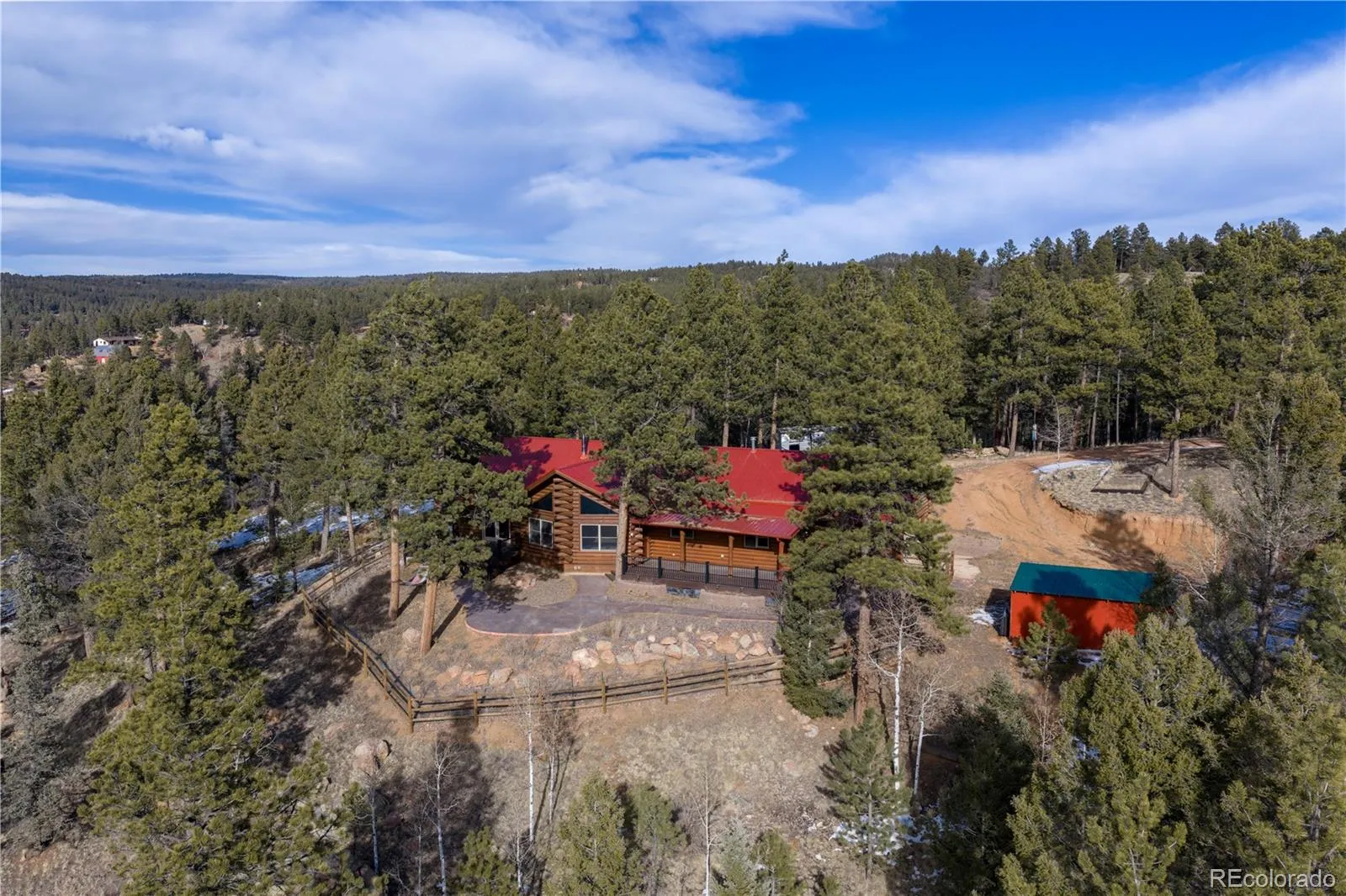 Experience the perfect blend of privacy, comfort, and wide-open space on this fantastic 40-acre property with breathtaking views in every direction. This beautifully updated one-level cabin offers true main-level living with 3 bedrooms, including a stunning primary suite featuring a spacious walk-in closet and a luxurious en suite bath with claw-foot soaking tub and walk-in shower. The open living area is filled with natural light, highlighted by vaulted ceilings and a cozy wood-burning stove, ideal for mountain evenings. The modern kitchen has been thoughtfully updated with granite countertops, a pantry, and brand-new stainless steel appliances, and flows seamlessly into a large laundry room conveniently located just off the kitchen. New hardwood flooring runs throughout the home, complemented by new carpet and fresh finishes. Outside, enjoy two brand-new Trex decks perfect for taking in the incredible views and peaceful surroundings. The property is fully weathered and winterized, with insulation beneath the cabin for year-round comfort. Multiple outbuildings add exceptional functionality, including two barns (one equipped with a 500-gallon cistern), a loafing shed, and a greenhouse, ideal for livestock, hobbies, or sustainable living. Just 25 minutes to Woodland Park and about a two-hour drive to Denver or DIA. A rare opportunity to own a turnkey rural retreat with modern updates, expansive acreage, and endless possibilities.