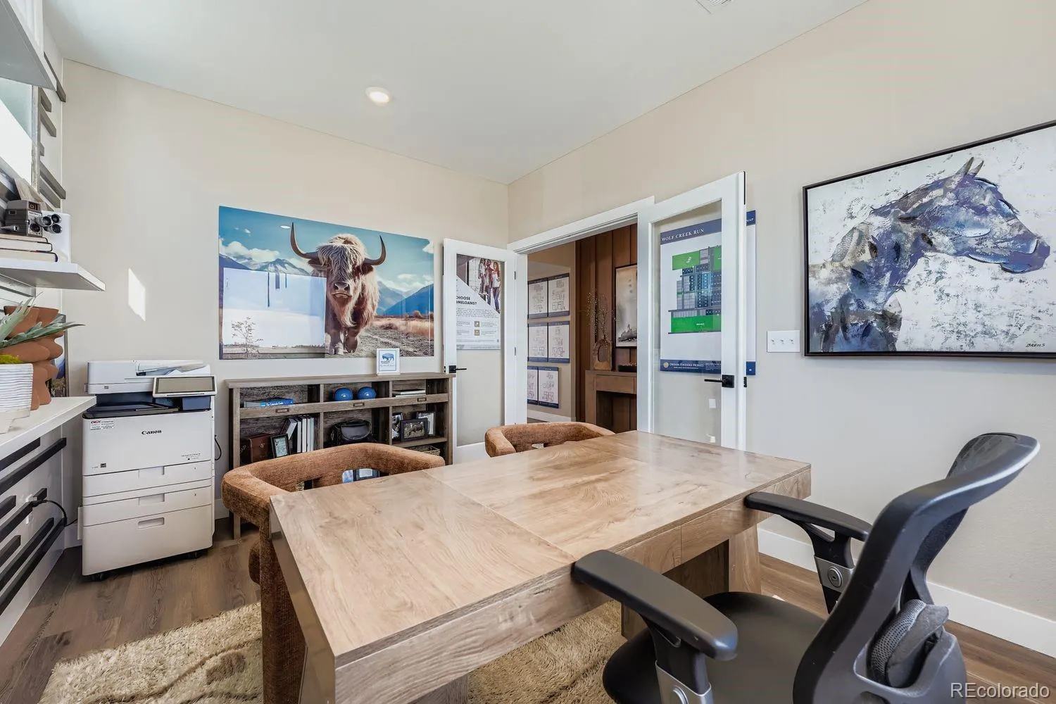 Welcome to this beautifully finished single-family Model residence at 55043 E 27th Ave in Strasburg, CO, located in the desirable Wolf Creek Run West community by Dream Finders Homes. This new construction model home features a gourmet kitchen with quartz countertops, upgraded cabinetry, premium fixtures, and stylish flooring throughout—perfect for entertaining and everyday living. Abundant natural light pours in through expansive windows, creating a bright, open, and inviting atmosphere. Enjoy Colorado living on the covered patio, ideal for relaxing while taking in the peaceful country feel, all while being just 30 minutes from downtown Denver.