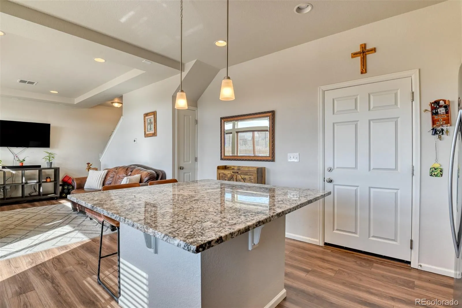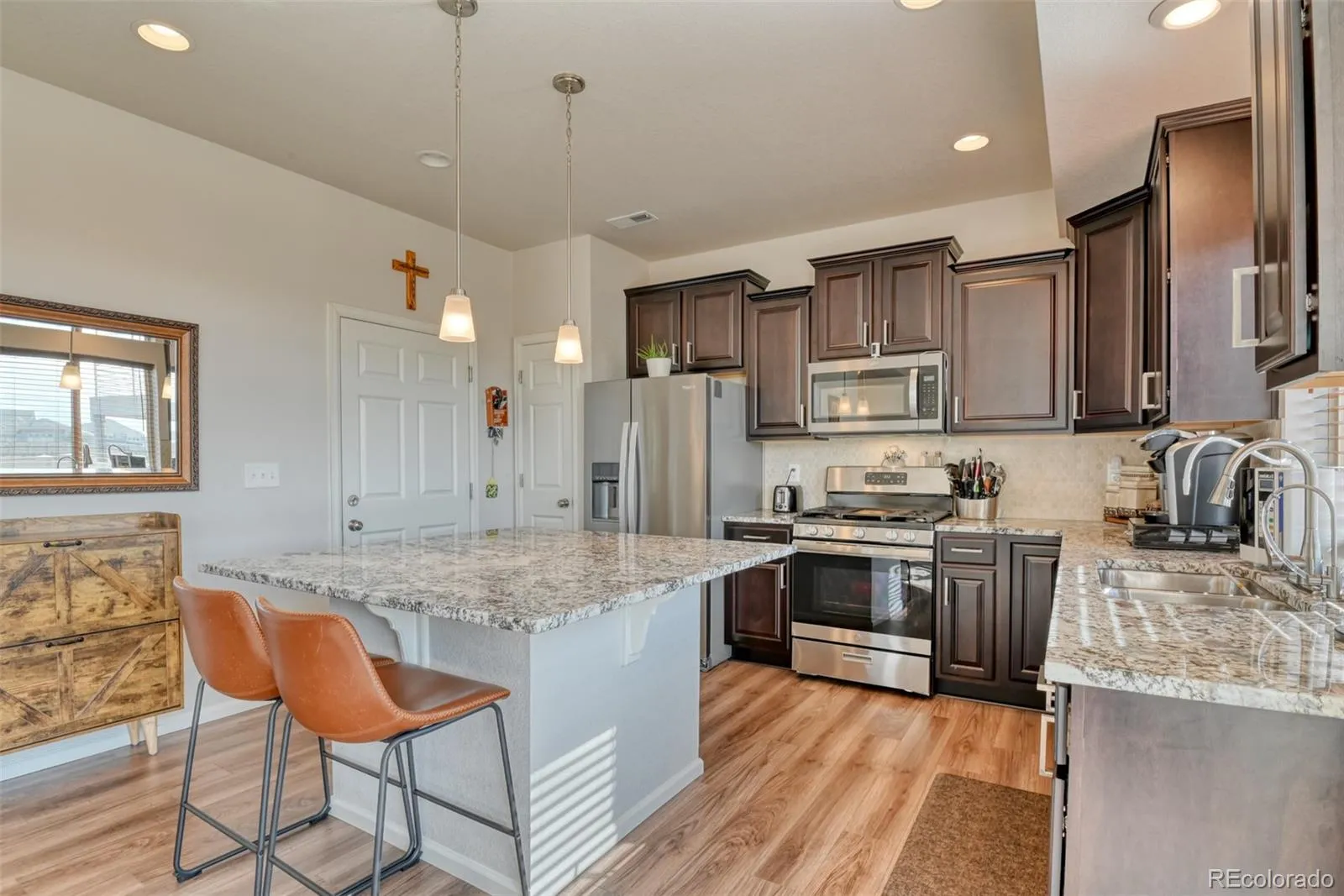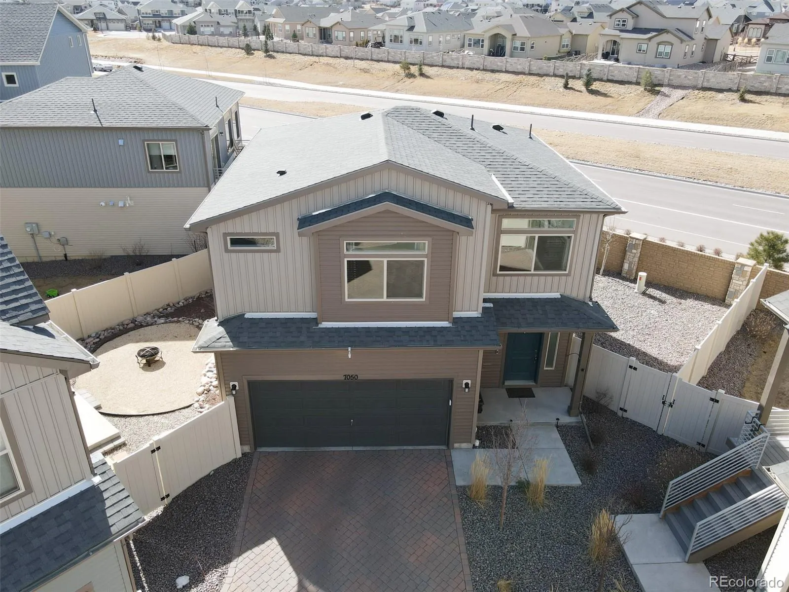 Built in 2022 and beautifully maintained, this modern 3-bedroom, 3-bath home is perfectly situated at the end of the cul-de-sac with no direct neighbors behind and Pikes Peak views. The home features durable LVP flooring throughout the entire main level and an open-concept layout designed for comfortable everyday living and effortless entertaining with lots of natural lighting. The kitchen shines with granite countertops, a gas range oven, ample cabinetry, and seamless flow through the main living area. Upstairs you will love the spacious landing with leads you to the primary bedroom with walk-in closet. Primary bath with double vanity and large walk-in shower. Enjoy the convenience of a two-car garage and low-maintenance living, with the HOA covering trash, snow removal, and front yard lawn care. Located in the desirable Banning Lewis Ranch community, residents have access to a recreation center, community events, and numerous activities. Ideally positioned in the Powers Corridor near military bases, shopping, dining, and schools, this home blends modern design, thoughtful amenities, and an exceptional location.