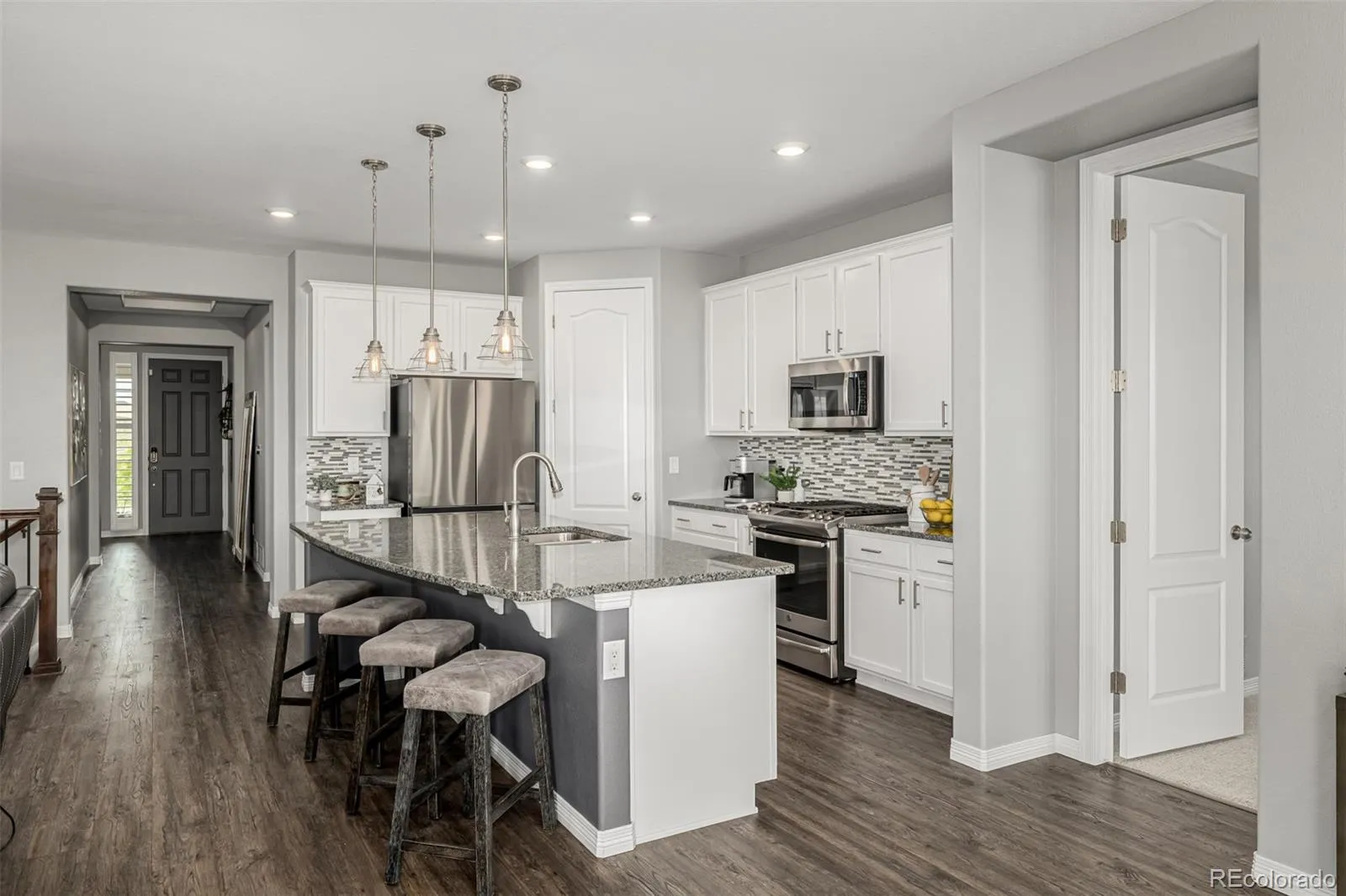 Inside, the layout works beautifully for real life. The main level offers nearly everything you need day to day, including a spacious primary suite with a five-piece bath, oversized walk-in closet, and a thoughtfully designed private water closet. Two additional bedrooms and a full bath sit on the opposite wing, ideal for guests, home offices, or a quiet retreat. The open kitchen anchors the home with generous island seating, granite counters, pantry storage, and easy flow into the great room and dining area. High ceilings and abundant natural light keep everything feeling bright and connected.