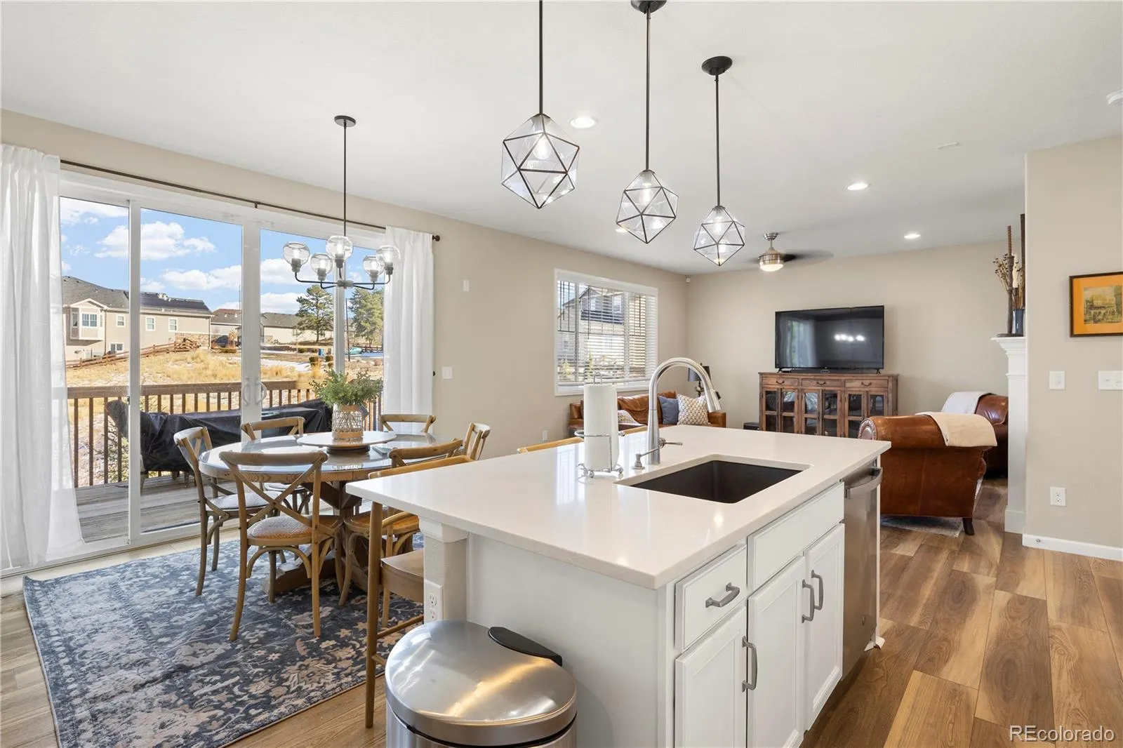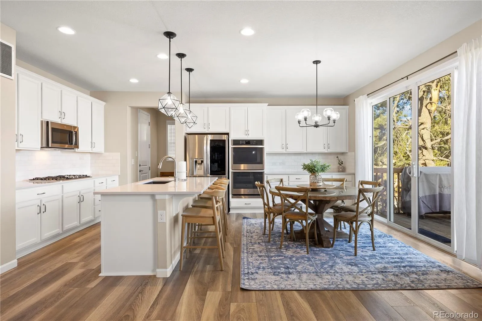 Gorgeous 5 bedroom, 5 bathroom home on a private, treed lot in highly desirable Forest Trace and located in the desirable Cherry Creek School District! This beautifully maintained home features an open floor plan with a gourmet kitchen showcasing a large granite island, double ovens, stainless steel appliances, walk-in pantry, and seamless flow into the cozy family room with a gas fireplace. The main floor also offers a private study. Included is luxury vinyl floors, newer roof and coveted 3-car garage. Upstairs you’ll find a spacious loft, upper-level laundry room, four bedrooms, three bathrooms, and a luxurious primary suite complete with a custom closet system. The finished walkout basement includes a recreation area, additional bedroom, and full bathroom—perfect for guests or multi-generational living. Enjoy Colorado evenings in the large fenced backyard surrounded by mature trees, ideal for entertaining, and appreciate the convenient location close to shopping, dining, and everyday amenities.