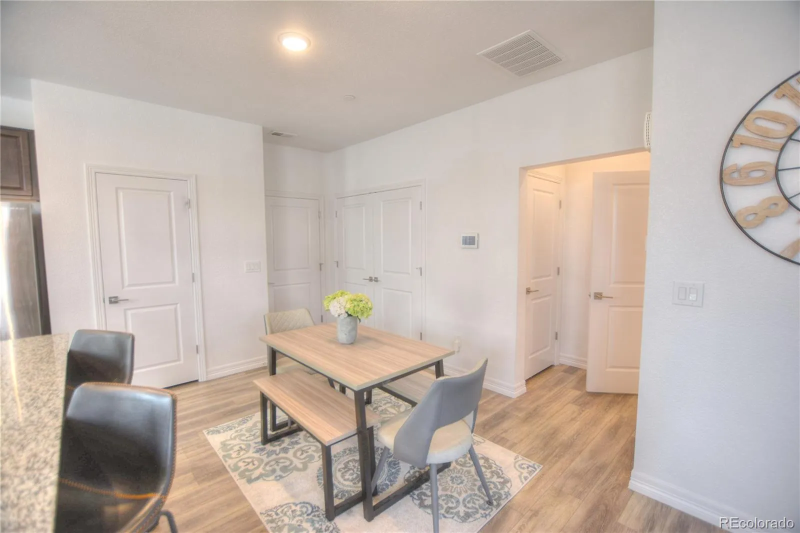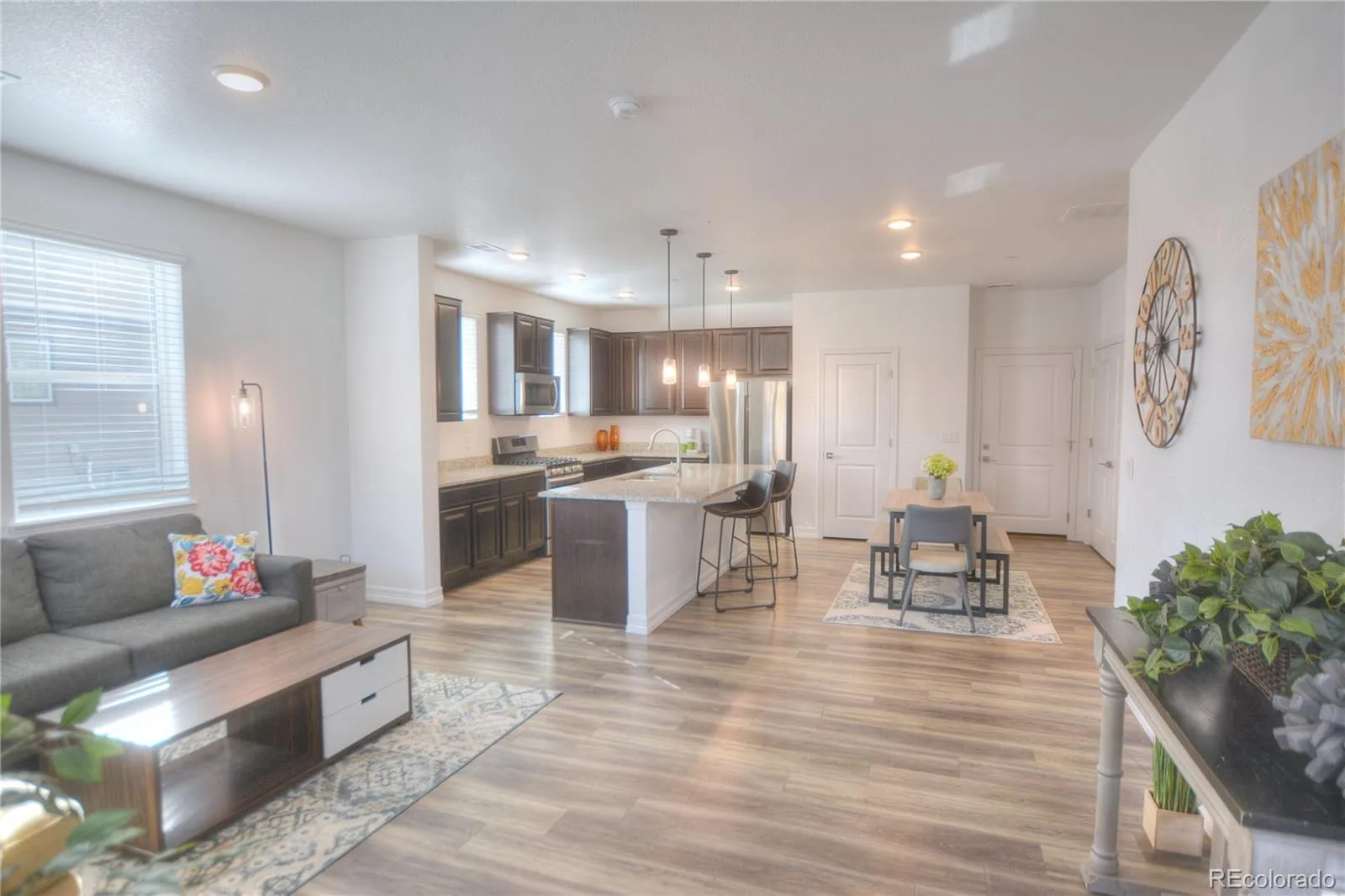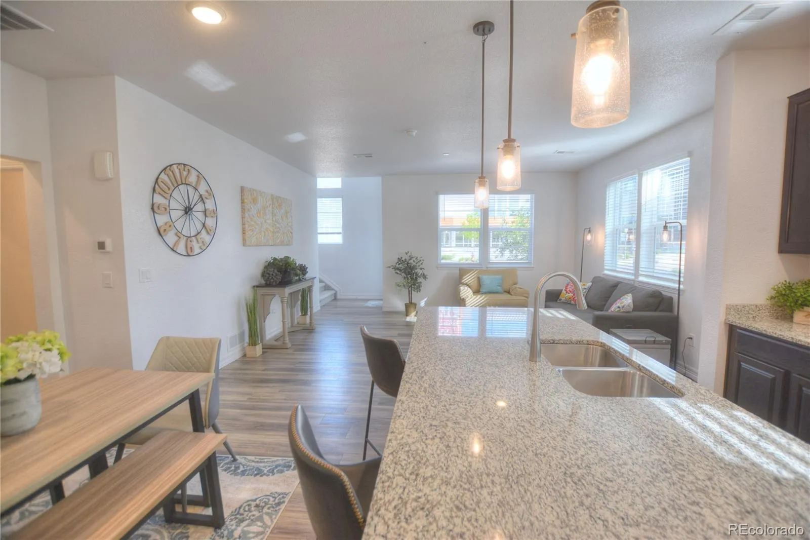 Welcome to your dream home in the heart of Victory Ridge, this very bright, end-unit townhome in Colorado Springs offers great location and modern amenities. When you walk in you’re greeted by vaulting entry foyer, LVP flooring and a beautiful open concept Great room with bright, upgraded kitchen with stainless steel appliances including 5 burner gas range, granite countertops, and a large island perfect for entertaining. Head up stairs and you’ll pass by the open loft area, with built in desk for a flex home office, the primary suite with an ensuite bathroom with dual sinks, walkin shower, and a generous walk-in closet. Two additional bedrooms share a full bathroom with dual sinks, also find the full size laundry room so laundry days are a breeze! A few more property highlights include a large 2 car extra wide garage, tankless hot water, AC, skybell doorbell, security system, smart thermostat, and lots of storage throughout the home. Step outside onto the fenced patio, offering the perfect spot to unwind and enjoy the fresh air. Got dogs? No problem! Take a few steps out the front door and there is plenty of community green space that is maintained by the HOA, No mower or yard tools needed. Location is great, you’re right by Icon Cinema, within walking distance to some of the newest dining in Colorado Springs!! Additionally, being only minutes away from the prestigious US Air Force Academy, this community offers the perfect blend of convenience and serenity. With easy access to I-25 and Powers Blvd.