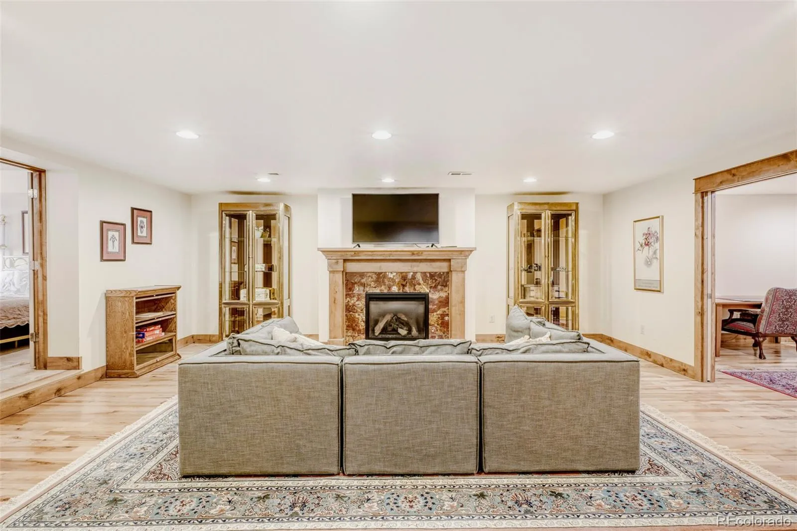 Experience refined living in this extensively remodeled luxury home in Cherry Hills III. This 4-bed, 3-bath residence showcases high-end finishes and an open-concept design ideal for both everyday living and entertaining. The fully renovated kitchen features black granite countertops, a breakfast bar, stainless steel KitchenAid appliances, double ovens, and a 5 burner gas cooktop. Walls were removed to create a seamless flow into the family room, highlighted by a beautiful gas fireplace. A convenient wet bar with a bar refrigerator enhances the home’s entertaining appeal. Throughout the home, you’ll find wood floors, solid wood interior doors, and new Pella windows and sliding patio doors, offering style, energy efficiency, and plenty of natural light. Custom window coverings complement the windows and doors* The primary suite serves as a private retreat with a walk-in closet, patio access, and a beautifully updated bath featuring a highly accessible roll-in shower. A convenient laundry closet, complete with washer and dryer, is also located within the suite* The finished basement expands the living space with a large family room and 2nd gas fireplace, two additional bedrooms (1 with a walkout door), a full bath, dedicated hobby or workout room, secondary laundry room, and a sizeable storage room. A substantial 20′ x 40′ sub-basement provides exceptional storage or future expansion potential. Additional updates include a newer furnace and tankless water heater*. Enjoy 3 private patios, 2 of which are enclosed with wrought-iron fencing and surrounded by lovely landscaping. As an end unit, the home sides to the East for beautiful morning sun, while the back patio faces South for year-round enjoyment. From the front patio, you can even hear the peaceful waterfall across the street. This is a rare opportunity to own a meticulously updated home in the desirable Cherry Hills III community, offering luxury finishes, flexible living space, and exceptional comfort throughout