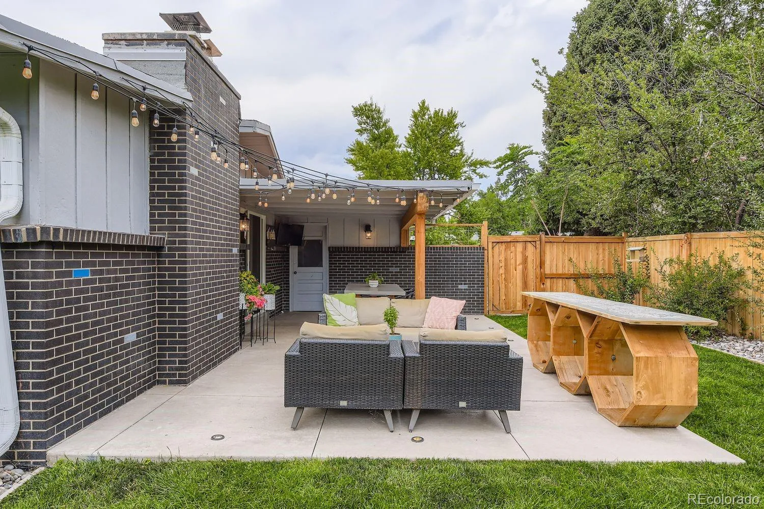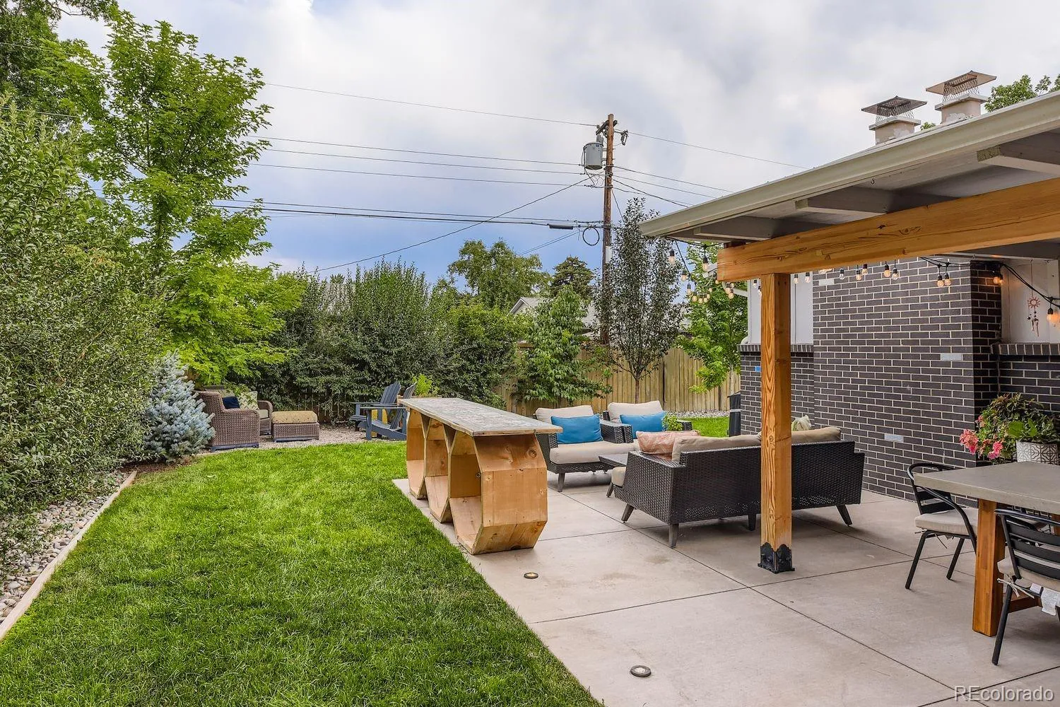 round. This incredible space flows into a private backyard oasis featuring a cozy firepit area, lush green lawn, and mature trees