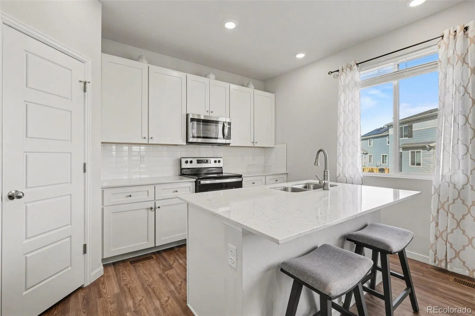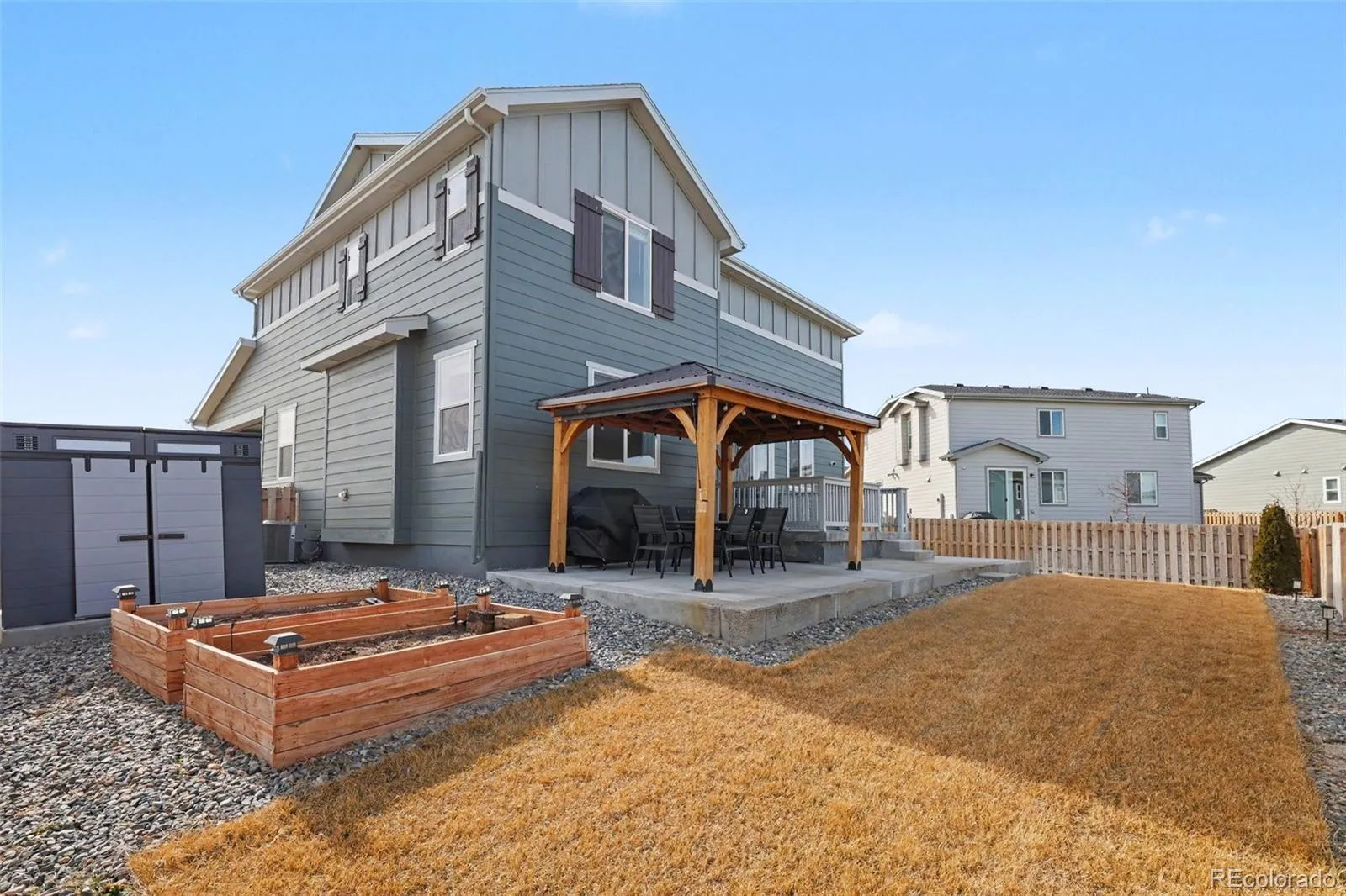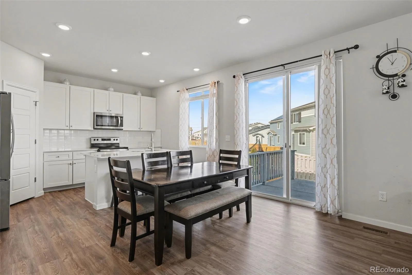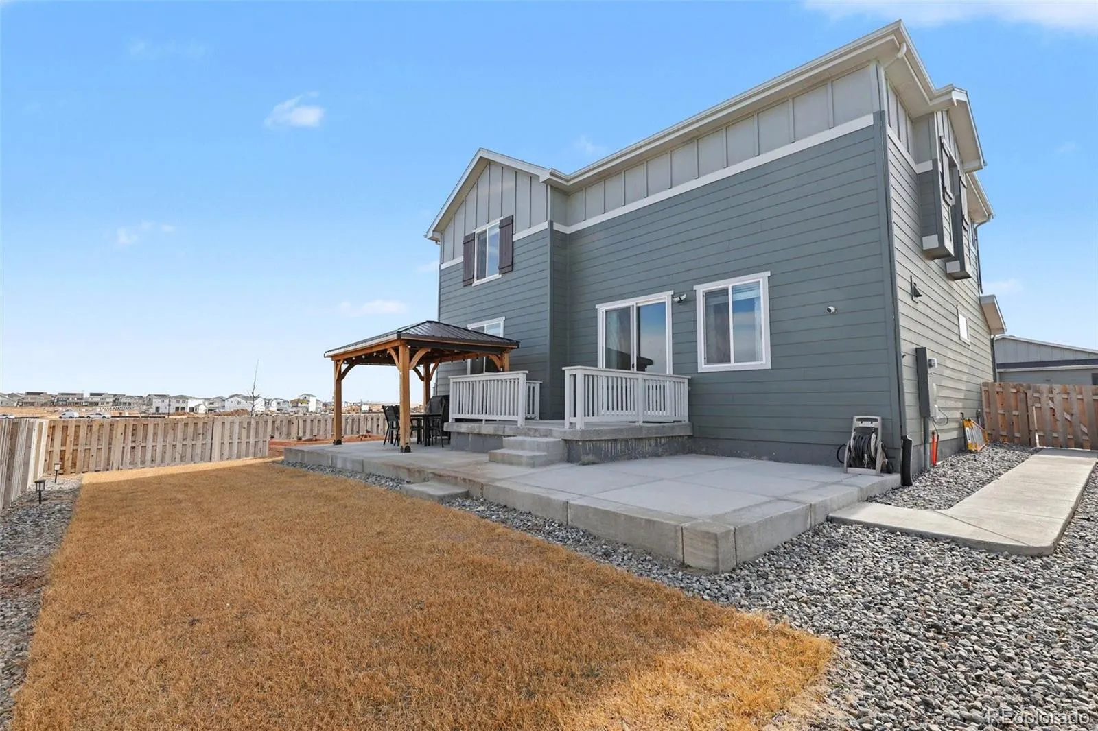 The kitchen is both functional and inviting with an eat-in island, stainless steel appliances, and a generous walk-in pantry for added storage. A large patio just outside overlooks the expansive backyard — perfect for relaxing, entertaining, or enjoying Colorado evenings with added privacy.