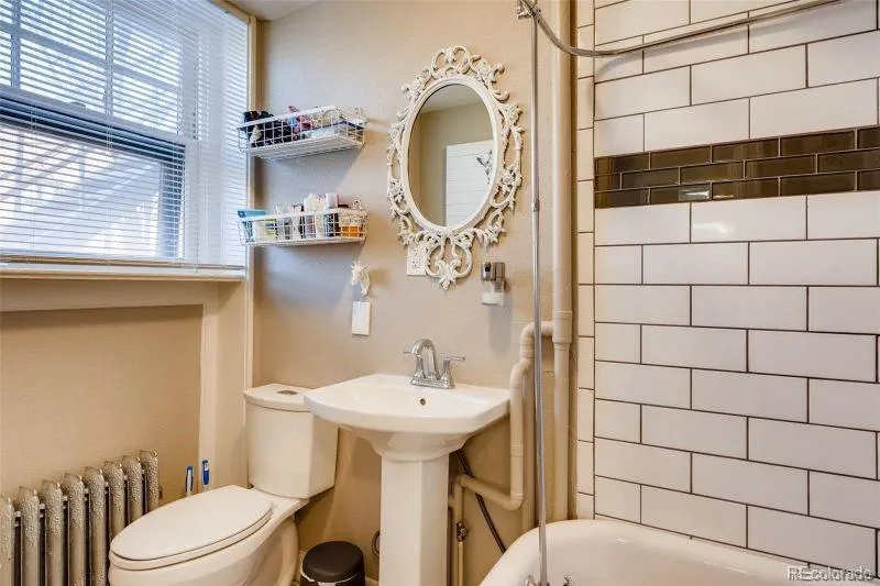 The bathroom highlights timeless appeal with a clawfoot tub, subway tile surround, pedestal sink, and updated fixtures. Located in a character-rich building with attractive architectural detail.