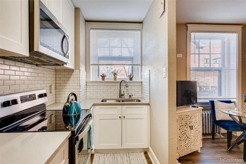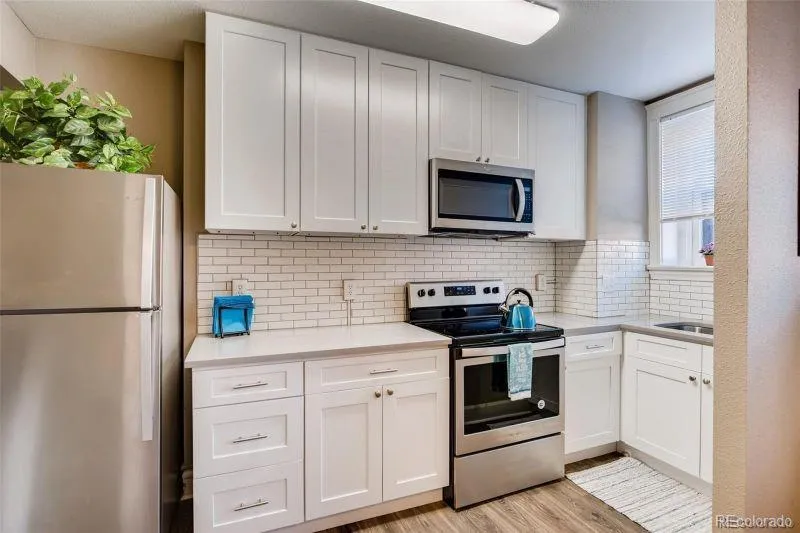 The updated kitchen includes white cabinetry, tile backsplash, stainless steel appliances, and ample counter space. The living area provides flexibility for both seating and dining. The bedroom offers a comfortable retreat with convenient access to the main living spaces.