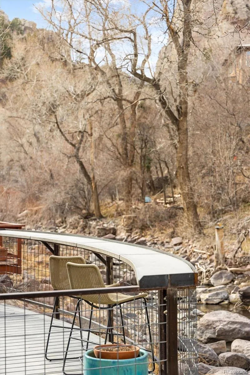 Wake to the sound of flowing water and fall asleep beneath canyon stars in this rare creekside retreat at the gateway to Eldorado Canyon State Park. Set directly along South Boulder Creek, this thoughtfully designed Eldorado Springs home redefines indoor–outdoor living, with a dramatic deck perched above the river and a polished concrete bar perfectly positioned for sunset gatherings. Fully renovated down to the studs in 2017, this home blends modern efficiency with intentional, minimalist design. Radiant floor heating, a tankless water heater, air and reverse-osmosis water filtration systems and a durable metal roof deliver comfort and peace of mind, while butcher block countertops and clean-lined finishes add warmth and character. Vaulted ceilings and skylights on the upper level enhance natural light and the connection to the surrounding landscape. Garden beds, a low-maintenance drought-tolerant lawn and a private shed complete the grounds, which are accessed through a side gate that reveals the true “front” of the home – the creek, the deck, and the canyon beyond. Just moments from Boulder and the iconic Eldorado Springs Pool, this is creekside living at its most authentic.