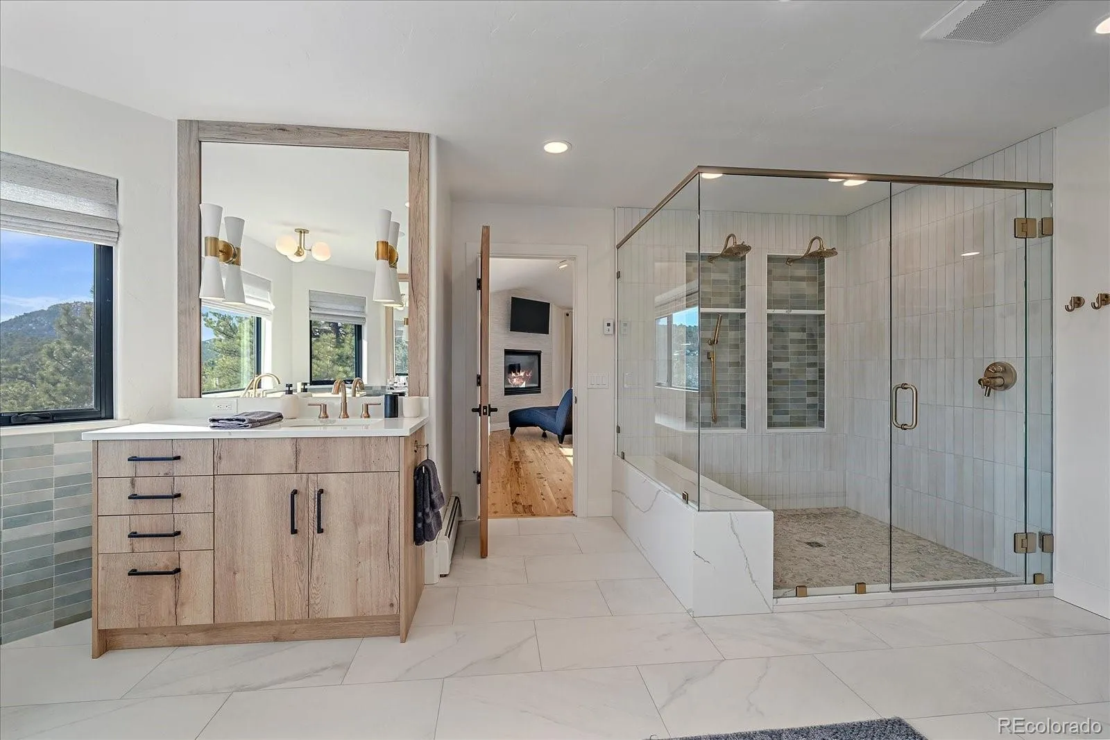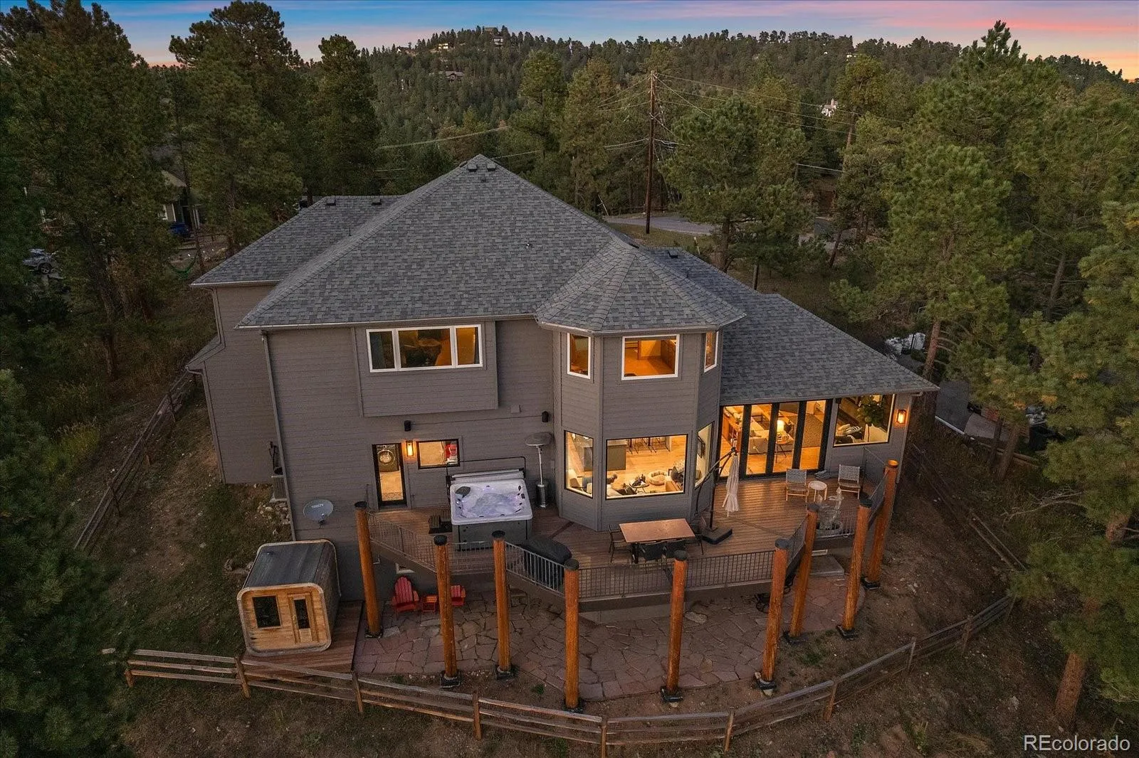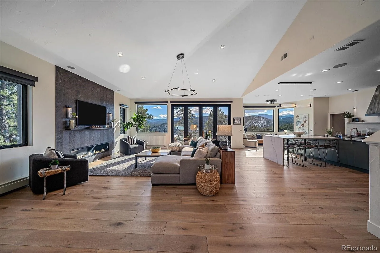Modern luxury awaits boasting snow-capped views and is walking distance to Evergreen Lake. This phenomenal showpiece starts with a partially heated driveway that welcomes you to the entrance. The foyer sets the tone making you feel like you are at a 5-star hotel. The great room design is modern, but also comfortable, and is ideal for entertaining. The accordion glass wall allows you to enjoy a hybrid of indoor/outdoor living. Try as you might, this home has an unbeatable chef’s kitchen. The gently used space (really – my sellers don’t cook but can make a mean pot of soup!) offers the ultimate in quality from the Thermador range to the Galley Ideal sink-station to the huge island with barstool seating – this kitchen has it all. A butler’s pantry offers plenty of extra cabinets and counters. A mud room leads you to the world’s nicest laundry room with extra fridge, TV and great views. A main level office (can also be a bedroom as it has a closet) and 3/4 bath are also on this level. A wide staircase leads you upstairs where the newly remodeled primary suite awaits. The views, the fireplace and overall style are hard to beat – that is, until you get to the primary bathroom. Stunning remodel boasts the best views from your soaking tub. The thoughtful design has double vanity stations, walk in-shower and a closet that offers more storage than some entire homes. The 2 upper bedrooms are large with enormous walk-in closets. Each room has a private sink/vanity and share a jack n jill style bathroom. The walk-out lower level has a great family room with plenty of space for TV watching and game tables. A guest bdrm can be found just off this space along with a full bath. The home gym (equipment not included) is smartly down the hall in a quieter area of the home. The deck provides distant views of the golf course & the hot tub is a great bonus. 3 car garage is oversized as well. Walk to downtown!