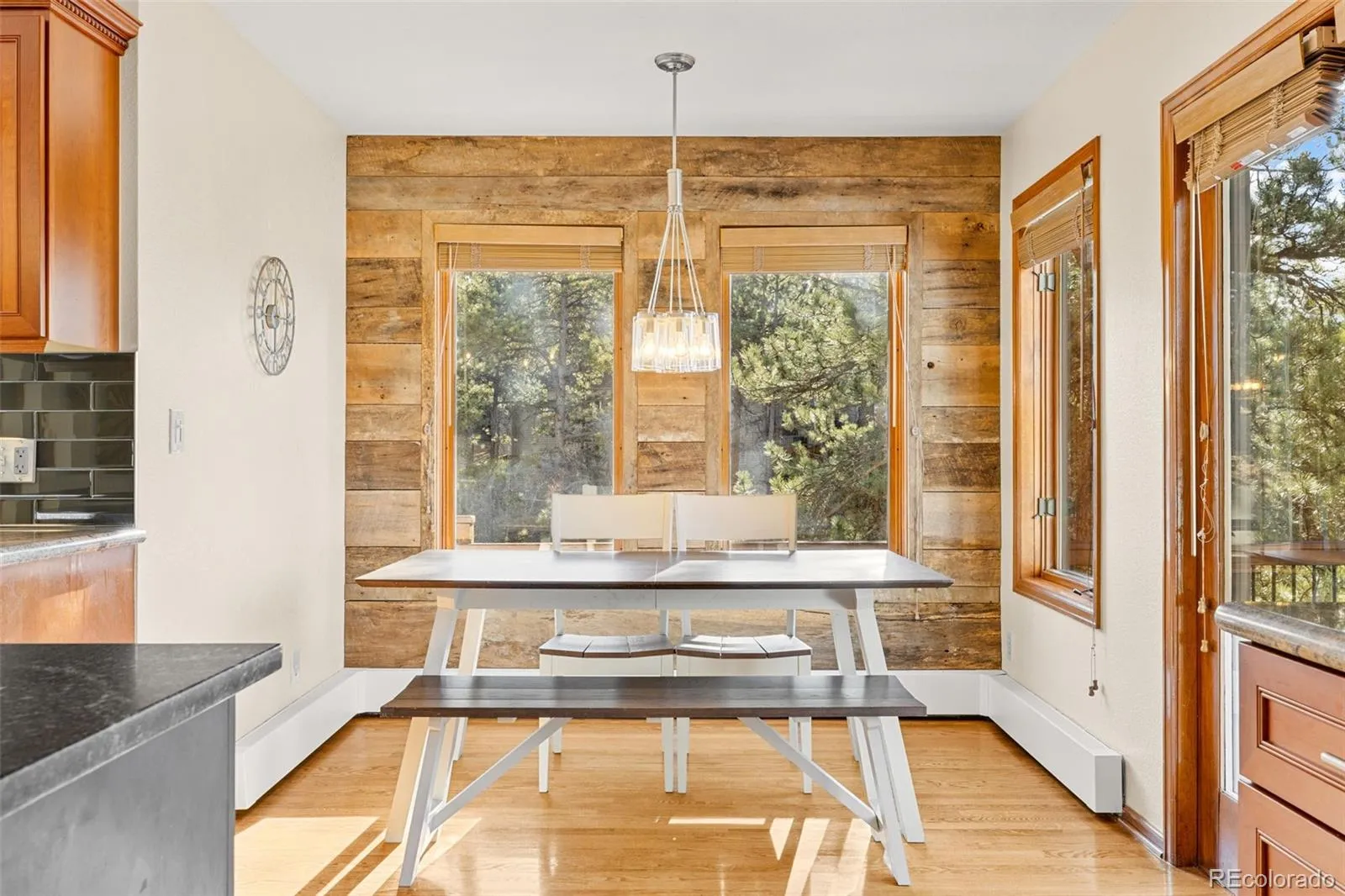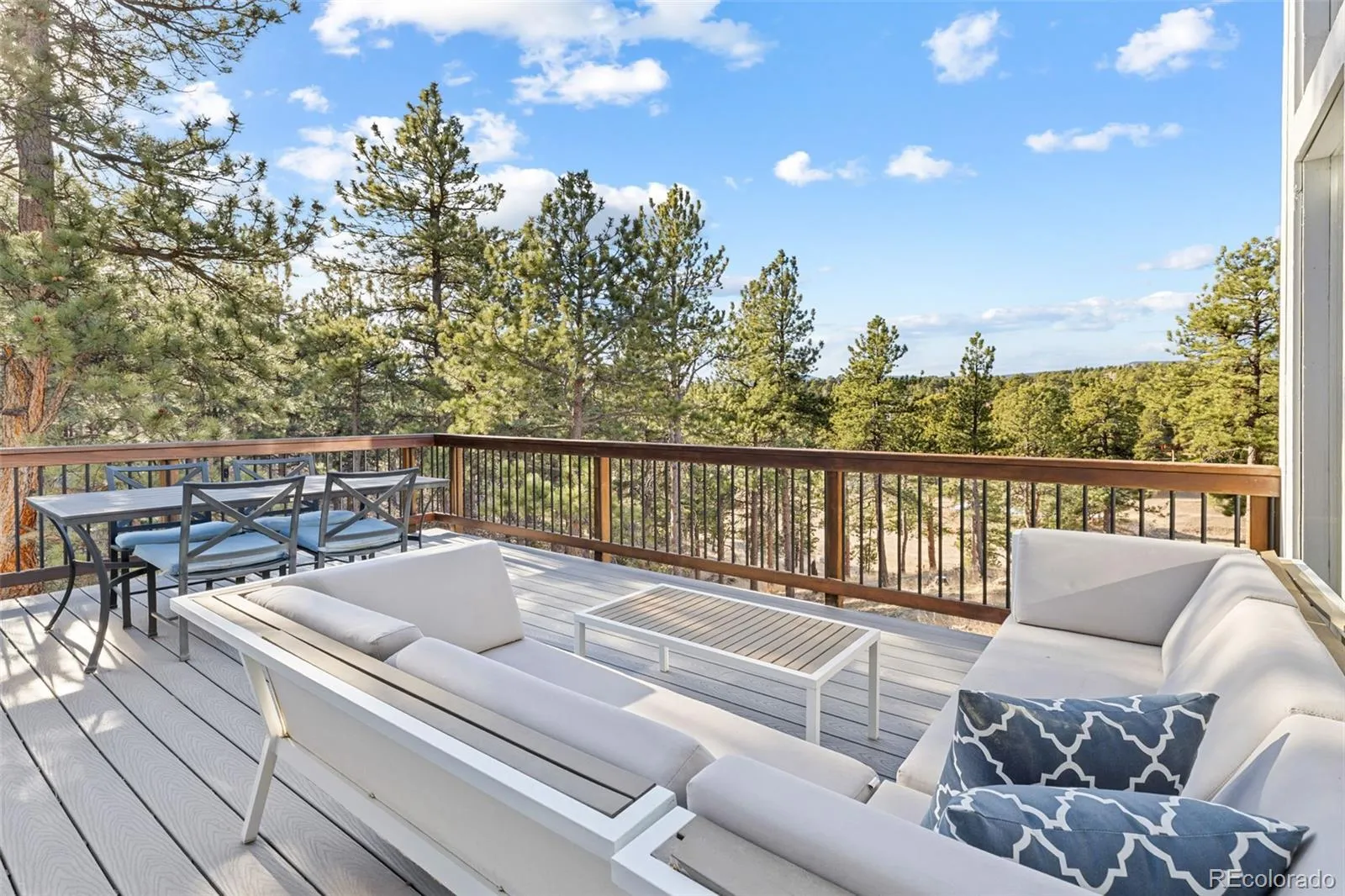 At the end of a cul-de-sac at the Ridge at Hiwan, this 4 bed 4 bath complete remodel, with A/C (upstairs 2022) backs up to acres of open space, views, and hiking trails. The owners were intentional with every renovation choice. New cement tile roof (2024, 75 year transferable warranty), high efficiency boiler (2026). New door and raised entry (2017) Reclaimed barn wood accents throughout, newer carpet, updated baths (2026) and timeless kitchen (2017), solid wood floors (2017), complete rebuild of the two-story main-floor fireplace in the great room. An entire wall of windows showcases the sweeping open space and mountain views. The fully remodeled chef’s kitchen features high end appliances (Subzero/Wolf/Bosch), including a gas range, double ovens, and a beverage bar, custom lighting and an expansive granite island. A bright and oversized formal dining room on the main floor, flows effortlessly into the great room and kitchen. Outdoor living of over 1,200 square feet of a newly added (2018) wraparound Trex deck seamlessly connects the living, formal dining, and kitchen spaces. Private home office with its own private deck with views. The primary sun-drenched bedroom features tall ceilings and a recently remodeled ensuite bath with marble counters (2026) and modern deep soaking tub! Two generously sized bedrooms on the same floor as the primary, sharing a bath and a surprise play area to a study nooksp nestled between these bedrooms. Lower level offers incredible home theater (2017) with surround sound and custom copper decorative features. Plus excellent family room/play room/fitness area with walkout access to over a 1/2 acre lot. This space has its own spacious guest suite with an updated bath, laundry, and access to a dog run. Experience a rare blend of luxury, comfort, and convenience in one of Evergreen’s most sought-after neighborhoods, this home truly has it all. Roads are county maintained thanks to its location along a school bus route.