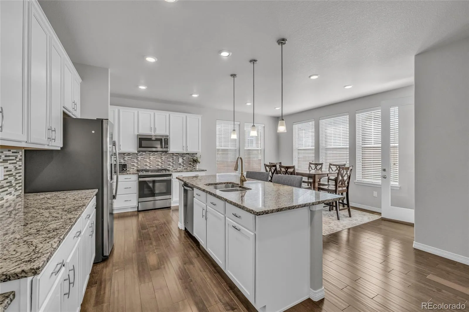 The main level is bright and open, anchored by a welcoming great room that flows naturally into the kitchen and dining area. Timeless white cabinetry, stainless appliances, an extended island with seating, a large walk-in pantry, and generous storage throughout make the space as functional as it is inviting.
