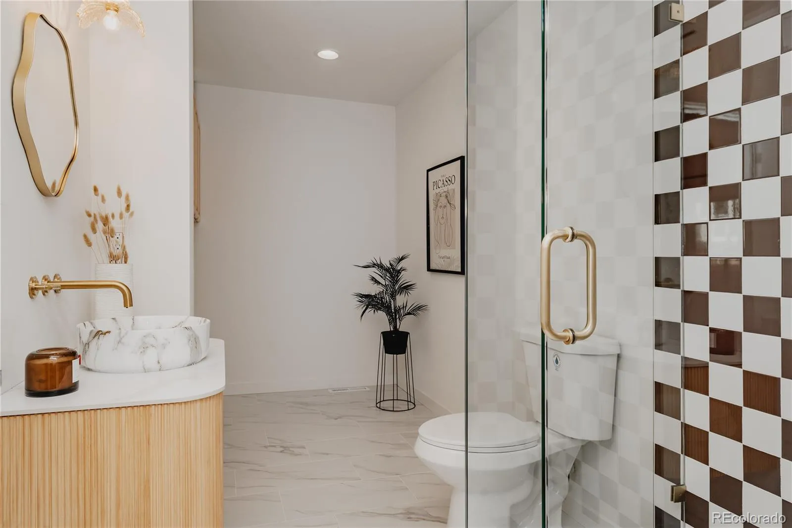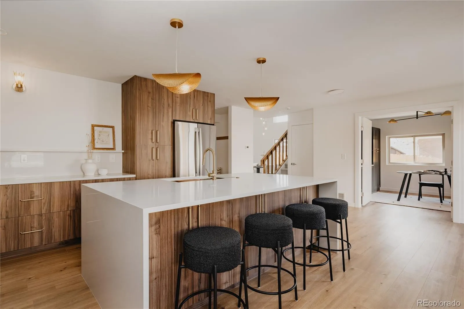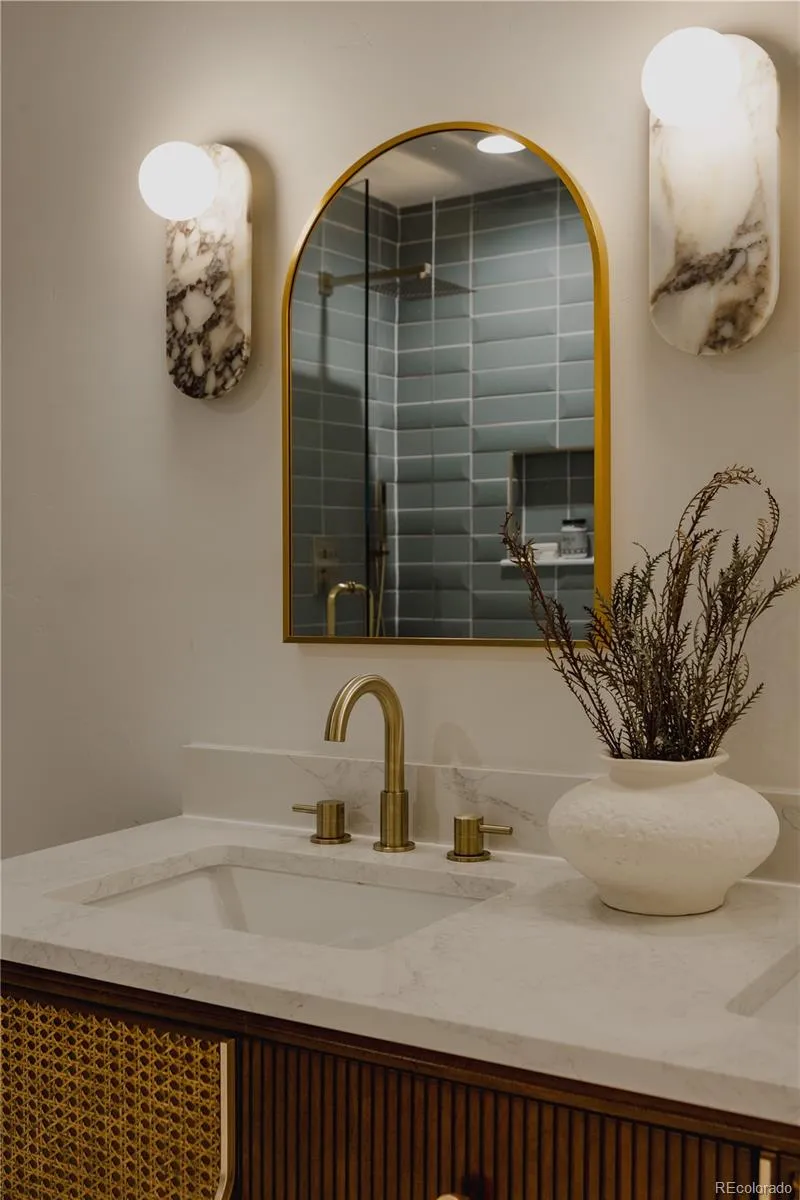 The kitchen is the showpiece. An 8-foot waterfall island commands attention, paired with a microwave/oven combo, gas stovetop, and a striking 36-inch gold sink that adds a bold, custom touch. It’s the kind of space that makes entertaining effortless and everyday cooking feel elevated.