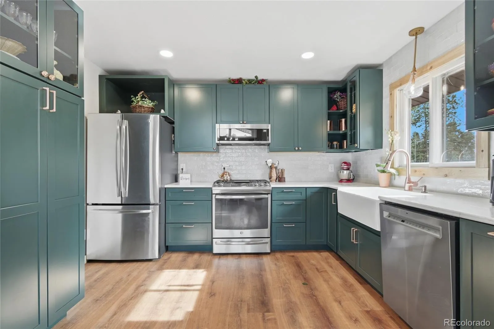 The private and pastoral setting of this lovely, remodeled ranch home on 2 acres will grab your heart and spirit. Wake up to meadow views, neighboring horses grazing in the distance, and the simple pleasure of enjoying your morning coffee as the sun rises over the hills. In the evening, watch the sunset from your new covered front deck or take in twinkling Denver city lights—proof that you’re tucked away, yet still connected. The home is designed for easy main-level living, and is filled with natural light thanks to plentiful windows that frame the surrounding meadows. And guess what, there is a gorgeous all-new kitchen and three beautifully remodeled bathrooms – this home is the meaning of move-in ready! Barn door accents and LV flooring add to the contemporary updates. The walk-out lower level provides a large living space with a fireplace and bathroom—ideal for a wonderful family room, guests, or hobbies. Outside, enjoy the new composite front deck that provides covered, sunny, and south facing outdoor living, and the wonderful raised garden. The property truly also shines as a ready-to-go horse setup or hobby farm. The 3 stall barn includes tack room, hay loft, and storage, fenced paddock, along with two fenced pastures. Additional outdoor amenities include a chicken coop (with chickens!), greenhouse, and the raised garden beds – all in great shape and ready for you to make this your own private paradise. Practical upgrades include newer vinyl siding, a newer hail-resistant roof, a spacious heated two-car garage, paved driveway, domestic well, 2022 boiler, and a generator. All this just an easy paved drive of 9 min to downtown Evergreen & amenities, with a myriad of open space and trails very close by – in fact, it’s just 1.2 miles to Bell Park! With the new kitchen, bathrooms, front deck & more, this home is a special gem. It’s tranquil, pastoral, & full of possibility—mountain living at its most inviting! 3D Tour and more at www.24597StanleyParkRoad.com