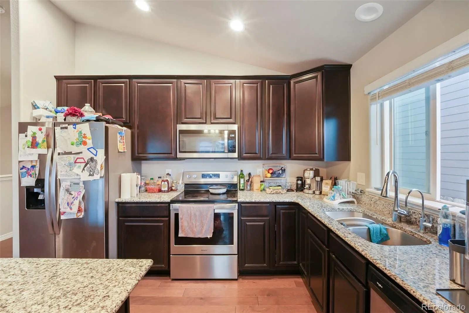Welcome home to the popular Lowell ranch floor plan, offering thoughtfully designed living space, including 4 bedrooms, 3 full bathrooms, and a large finished basement. The main level features an open-concept layout with vaulted ceilings spanning the great room, kitchen, and dining area—creating a bright and spacious feel throughout. An electric fireplace anchors the main living room, creating a warm and inviting focal point. Hardwood flooring enhances the kitchen and dining areas, while the kitchen is beautifully appointed with stainless steel appliances, granite countertops, a center island, 42” upper cabinets with crown molding, recessed lighting, and upgraded finishes that blend style with functionality. The vaulted primary suite offers a relaxing retreat with a five-piece bath. Ceramic tile flooring extends through all bathrooms and the laundry room, and all bath and shower surrounds are finished in tile—no plastic inserts. Lighted ceiling fans in the great room and primary bedroom, upgraded trim with detailed windowsills, lever door handles, and Decora light switches add both comfort and sophistication. Central A/C ensures year-round comfort. Downstairs, the spacious finished basement includes a large recreation room, two additional bedrooms, and a full bath—ideal for guests, multi-generational living, or flexible entertaining space. Main-level laundry adds everyday convenience. Additional upgrades include a water softener, water purifier, and newer roof for peace of mind. Enjoy beautiful mountain views and a convenient location near Powers Boulevard and all military bases making commuting a breeze. With hardwood kitchen and dining floors, granite counters, stainless steel appliances, 42” cabinetry, upgraded lighting and trim packages, and extensive tile work throughout, this home truly stands out. Quality craftsmanship and elevated finishes make this home a standout opportunity—schedule your showing today!