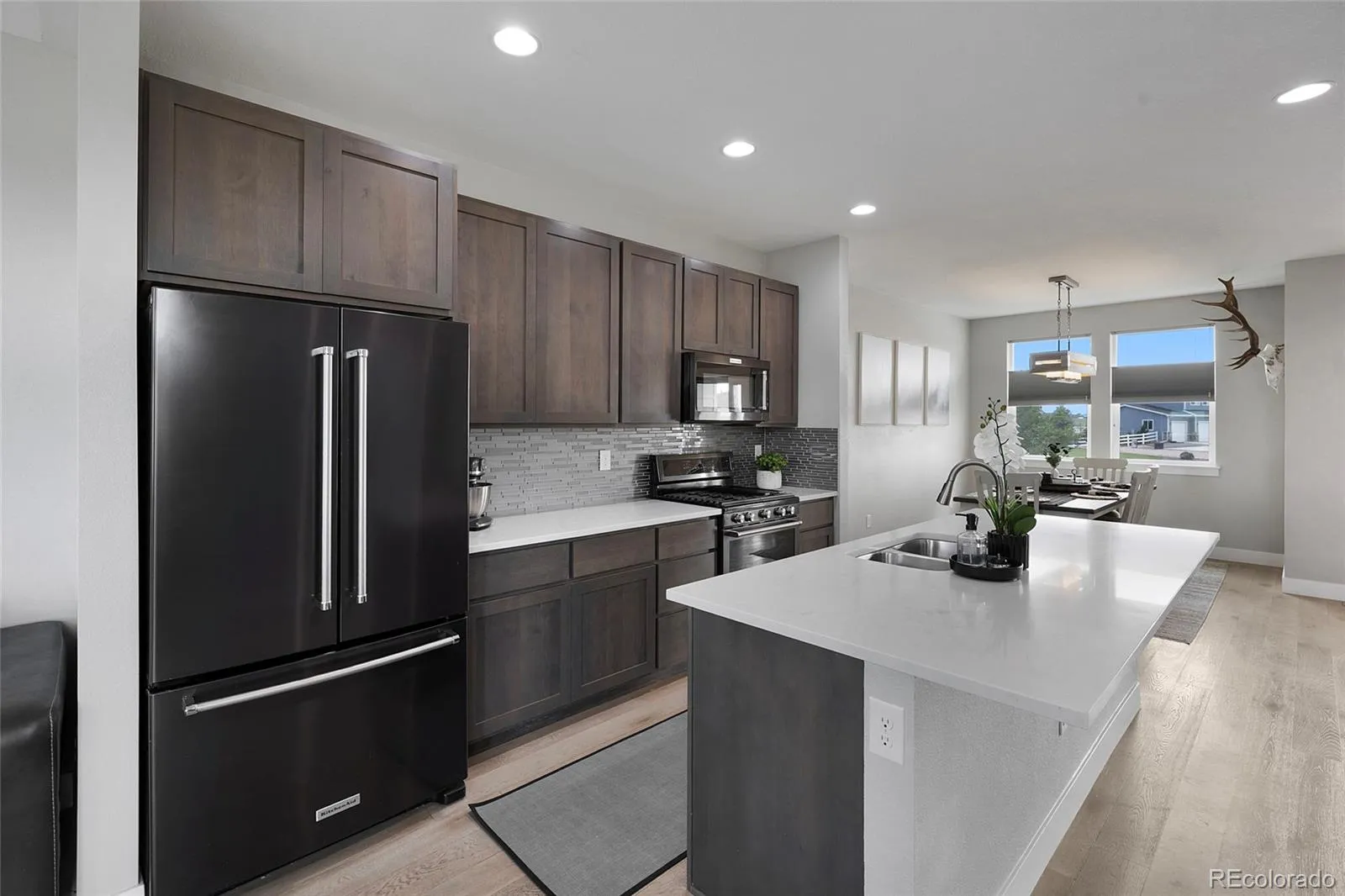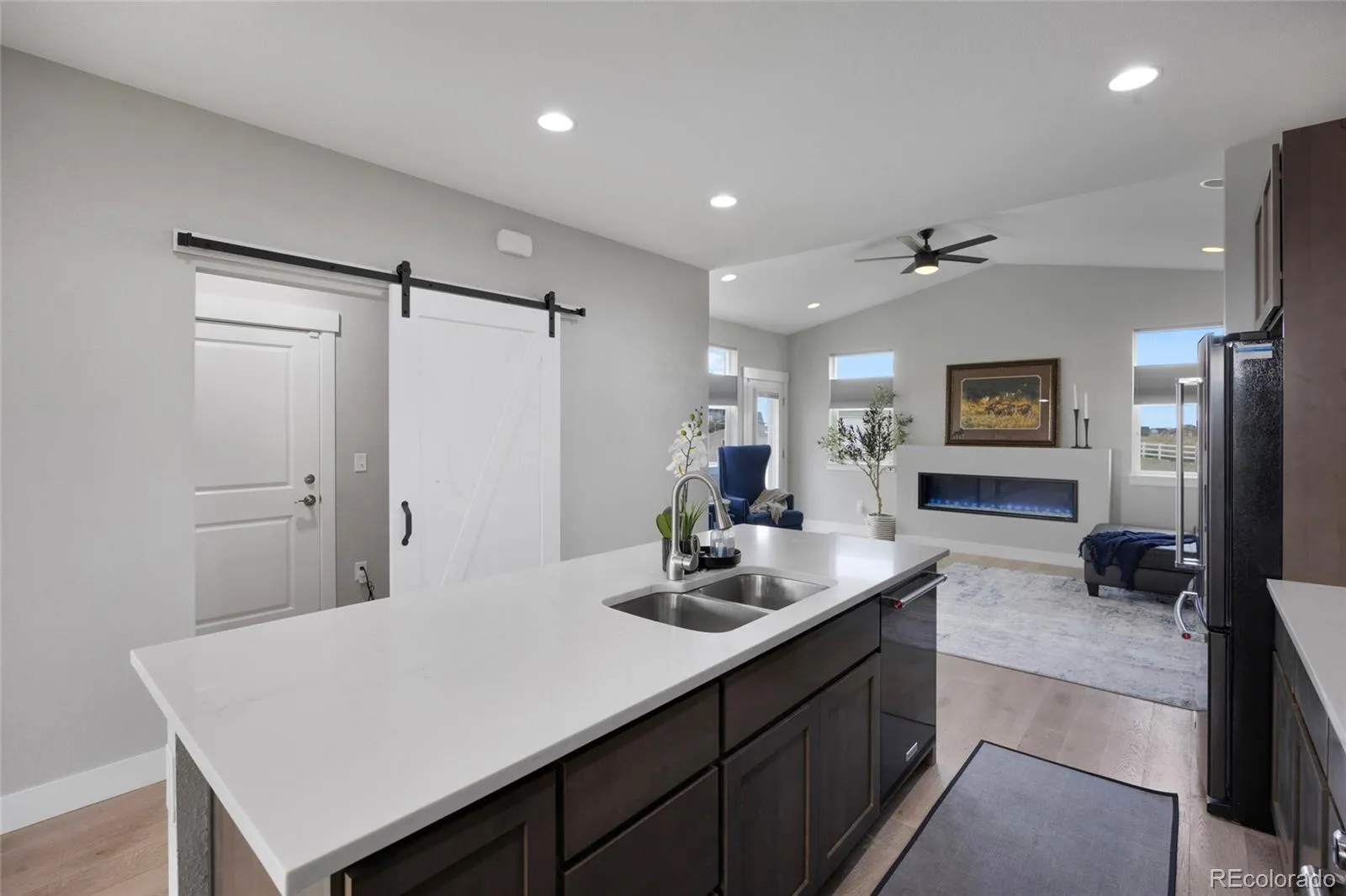 Step inside and you’re welcomed by an open, light-filled floor plan featuring vaulted ceilings, sleek laminate hardwood floors, and a cozy gas fireplace anchoring the main living area. The heart of the home is a chef-worthy kitchen complete with a large quartz island, 42” cabinets, matte black appliances, and an eye-catching tile backsplash, all framed by oversized windows that capture views of the rolling plains and distant peaks.
