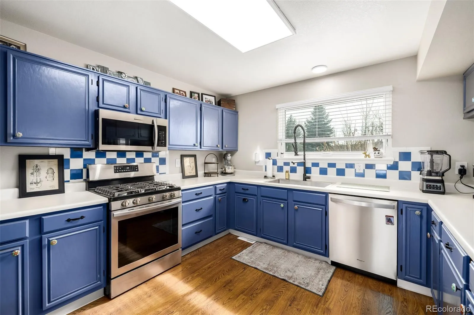 The stunning kitchen features designer blue cabinetry, white countertops, new stainless steel appliances, gas range, updated fixtures, and a new sliding glass door leading to the backyard.