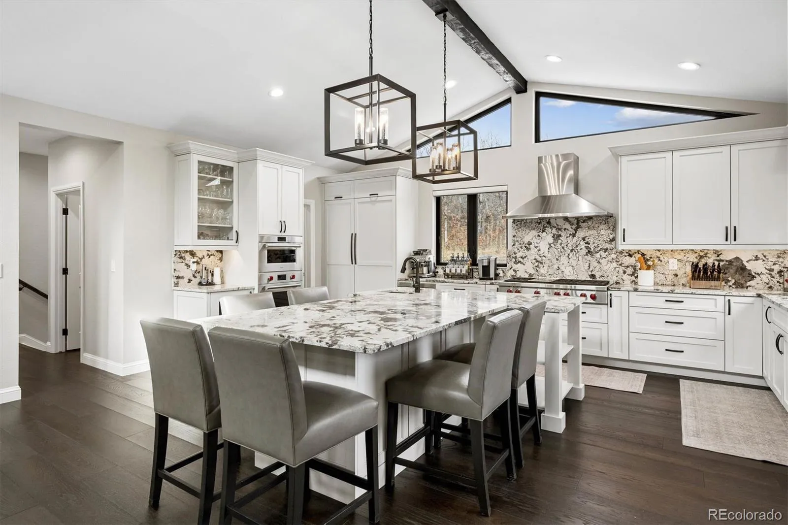 Privately tucked away in the rolling hills of Charter Oaks, this exceptional 2.25-acre property captures distant mountain views in a peaceful, serene setting. Completely remodeled in 2022, this main-level living home delivers a true “WOW” moment from the instant you step inside. Architectural details including soaring vaulted ceilings accented by rich wood beams, skylights that flood the space with natural light, designer lighting, muted paint hues, and wide-plank engineered hardwood flooring throughout—creating warmth, character, and timeless appeal. A spacious Great Room, anchored by a stunning stone fireplace, flows effortlessly into the dining area and open-concept kitchen, making this home an entertainer’s dream. The gourmet kitchen is nothing short of spectacular, featuring an oversized center island with breakfast bar seating for six—perfect for gathering with family and friends. Premium built-in Wolf, Sub-Zero, and Cove appliances elevate the space, including a refrigerator/freezer, wine and beverage refrigerator, double oven with steam oven, microwave, gas cooktop with stainless hood, and dishwasher. Main level living includes an en-suite guest bedroom, while the luxurious Primary Suite features its own spa-inspired ensuite bath, and a private sitting room—perfect for quiet mornings or relaxing evenings. On the opposite wing, you’ll find a spacious laundry room with built-in cabinetry, an additional bedroom/office, powder room, and mudroom. The lower level continues to impress with a bedroom, a media/game room, a ¾ bath, and a full wet bar. The well-appointed bar includes a wine refrigerator, beverage refrigerator, and separate refrigerated and freezer drawers—ideal for hosting gatherings. Step outside to enjoy a welcoming front deck and take in panoramic mountain views, and enjoy the frequent visits from local wildlife. This is refined mountain living at its finest—where luxury, comfort, and tranquility come together beautifully. Truly Stunning!
