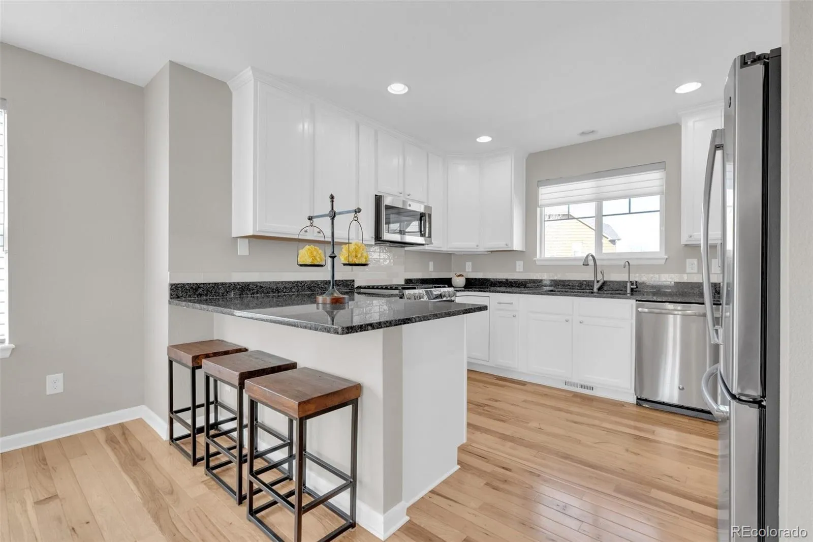 The kitchen features granite counter tops, ample cabinetry, and the added convenience of an instant hot water dispenser — a small luxury that makes a big difference in daily living. Professionally cleaned carpet enhances comfort in the bedrooms and upper level, creating cozy retreats for family or guests.