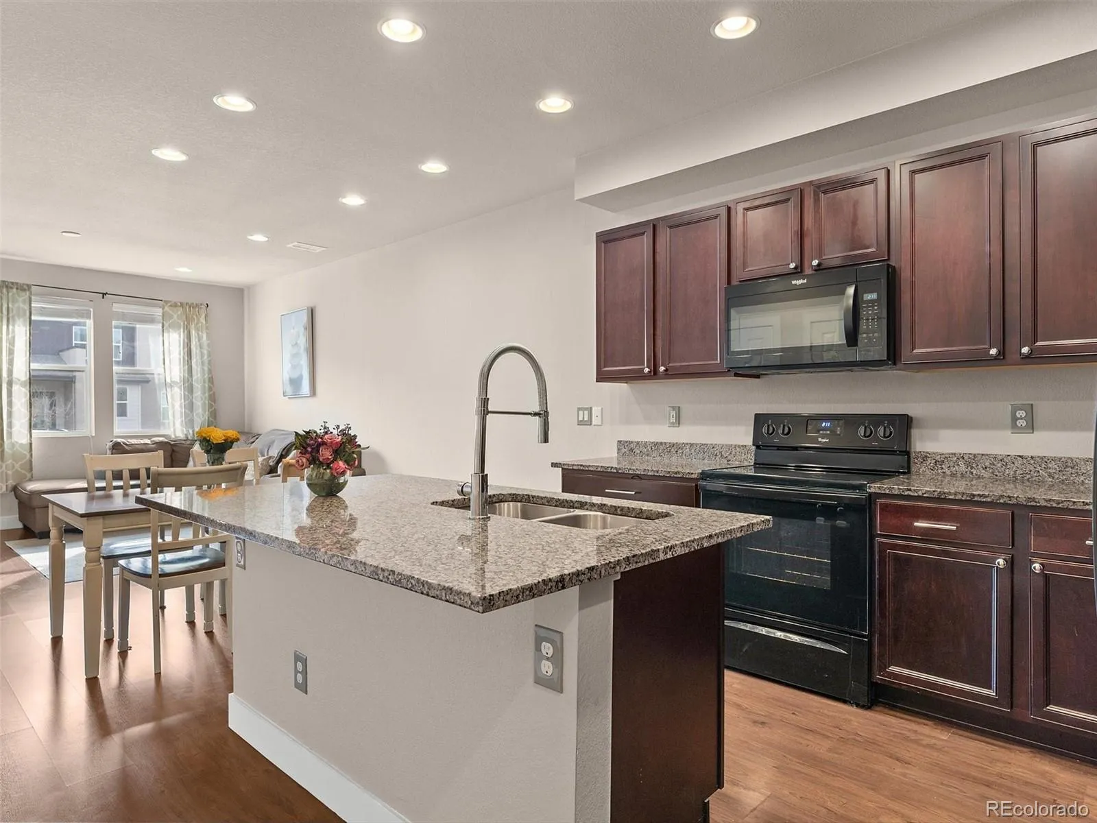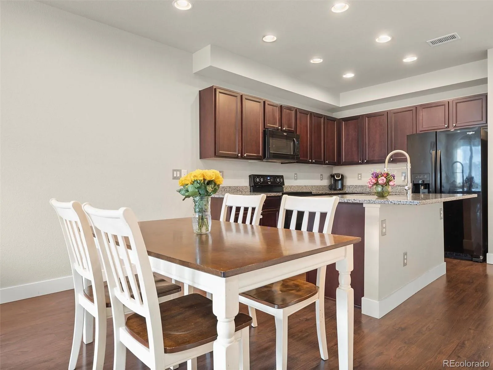 The kitchen is designed for real use, offering generous cabinet storage, a true pantry, and an island with seating that keeps everyone connected. Stainless steel appliances and clean finishes create a space that is both functional and welcoming. Just off the kitchen, the dining area is ready for daily meals or larger gatherings without feeling tight or limited.