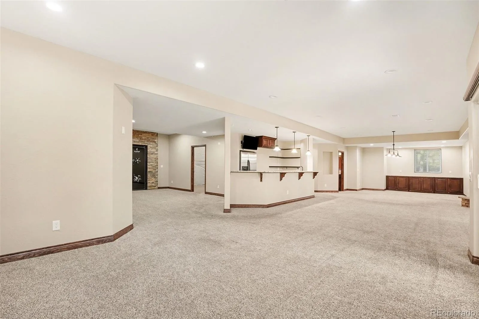 generous pantry, and a built-in wine cooler – offering both style and practicality. The main-level primary is a true retreat, it includes a private balcony to take in the peaceful surroundings. The luxurious five-piece primary bath provides spa-like relaxation with dual vanities, a soaking tub, and a separate shower. The main floor also includes an office, 2 additional bedrooms, and 2 bathrooms. The lower walkout level of this house includes expansive, open interior space that leads to an exterior backyard with a stone fire pit. The lower level also includes a large walk in GUN SAFE, a hobby/storage area, a full bar, 4″ bedroom, and ¾ bath. The 3 car garage is equipped w hot/cold running water.