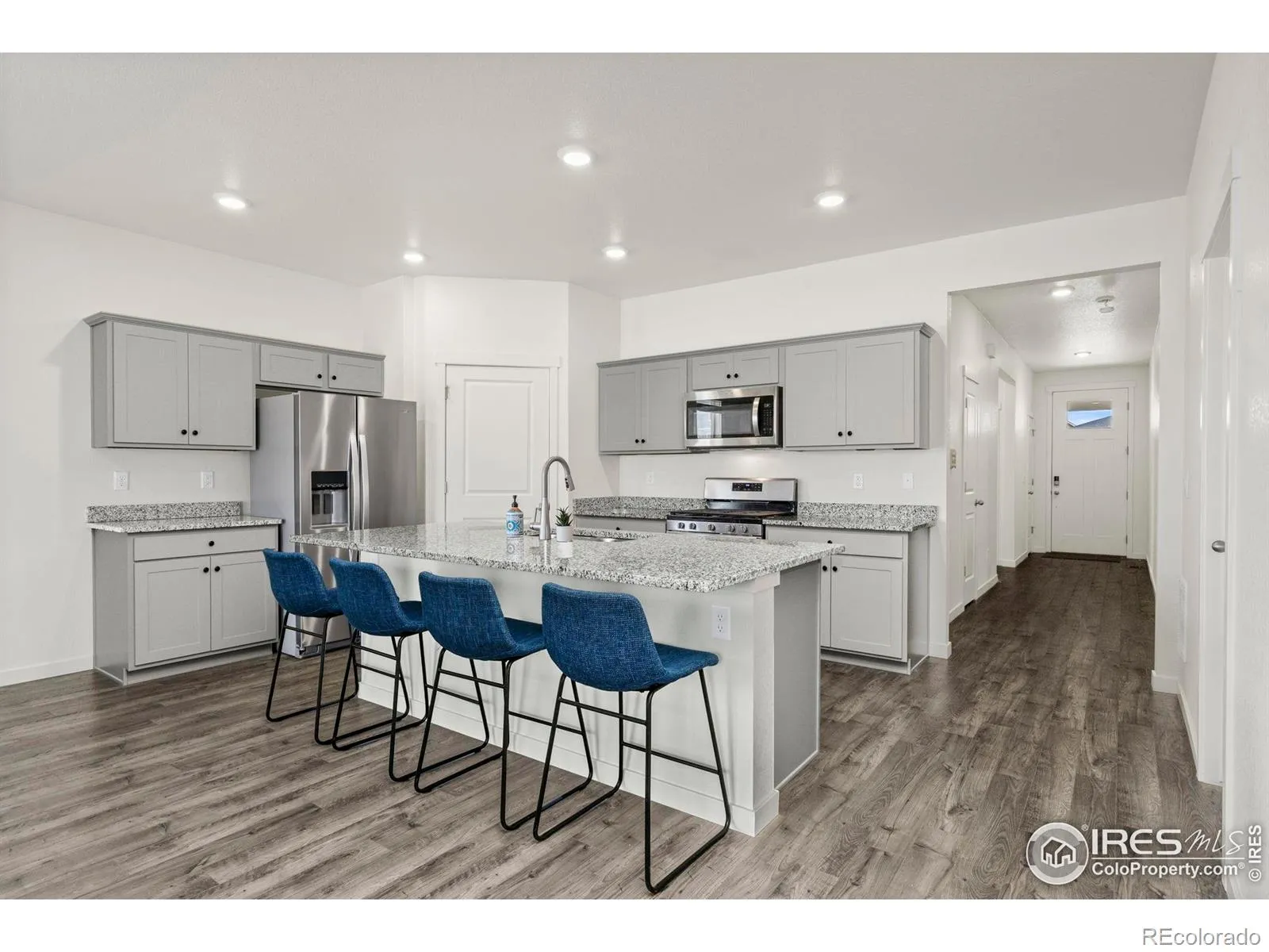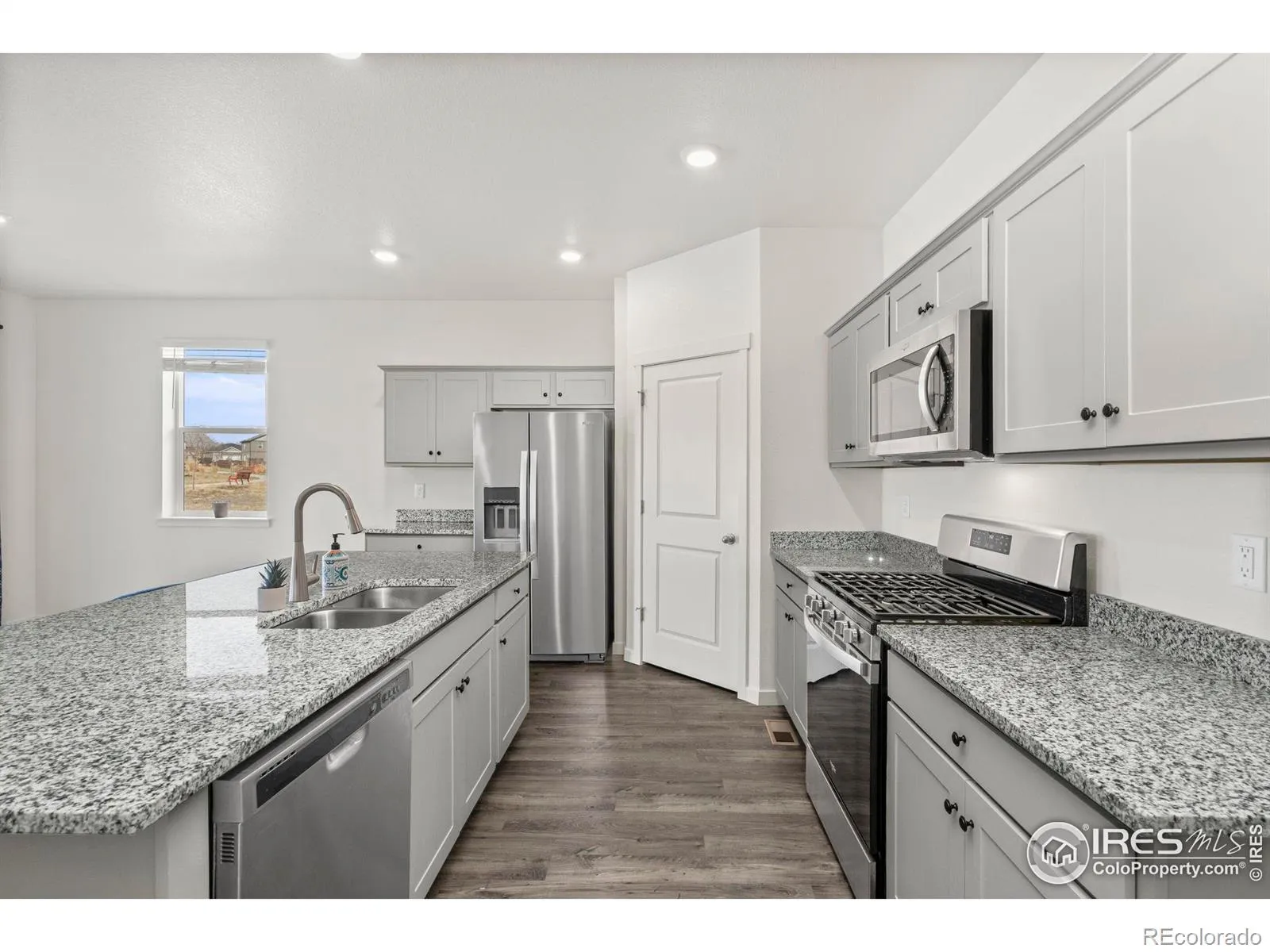 Move-in ready and thoughtfully designed! This like-new single-level home offers effortless living, modern finishes, and a peaceful setting backing to a greenbelt. Step inside to a welcoming, open-concept layout filled with natural light, designed to make everyday living and entertaining feel easy and connected. The kitchen features stainless steel appliances, granite countertops, a spacious island with seating, and a pantry for additional storage. The primary suite offers a relaxing retreat complete with a walk-in closet and an ensuite bathroom, while three more bedrooms provide versatility for guests, a home office, hobbies, or whatever fits your lifestyle needs. Outside, the fenced backyard includes a covered patio for enjoying quiet mornings while still staying shaded and comfortable. An attached two-car garage offers secure parking and additional storage space. Convenient location, with easy access to I-25 and just a short five-minute drive to downtown amenities.