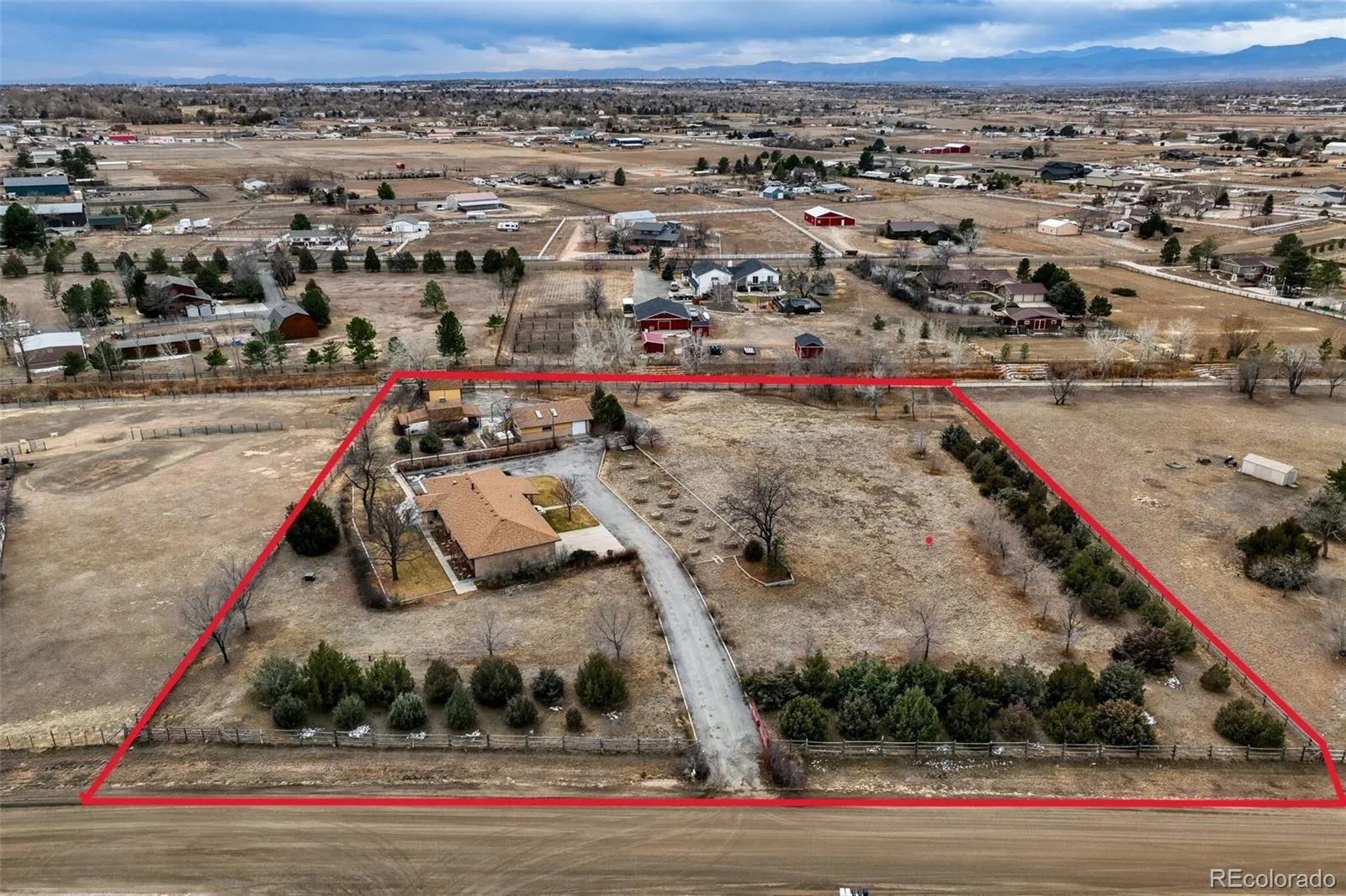 LOCATION, LOCATION, LOCATION! Rare opportunity in Wadley Farms! This 3,252 SF brick walkout ranch on 2.6 acres boasts breathtaking mountain views! Enjoy country living with close proximity to everything! Bring your horses, goats, chickens, RV’s, toys, custom cars and whatever you can think of! Lovingly maintained by original owner, this custom ranch has a ton of potential! Brand new carpet, interior paint & lighting on the main level. Use your imagination for the HUGE open family room/rec space in the basement. Plenty of room to have a pool table, living space, gym, home office or addt’l bedroom. The large un-finished space with walkout access offers endless opportunities for a home business. The OS two car attached garage has a mechanics pit plus pull down attic access. On the exterior of this home you’ll find nicely landscaped front and back yards (with sprinkler system), covered patios, a garden & garden boxes, and tons of parking! Enjoy access to the community walking/bridle path and water feature just beyond the back fence. Now, let’s talk about the 1,044 SF heated workshop w/3 single car garage doors, skylights, electric hoist, pull down attic access, numerous 220 outlets and more! There is also a 285 SF barn w/loft, garage door access and 2 covered overhangs, plus a 198 SF storage shed with a garage door access. Property upgrades include: Mini-split A/C (4 yrs), brand new well pump (2025), Boiler (7 yrs), New roofs & gutters on all buildings (incl leaf guards on the house, 2024), Vinyl windows, Solar panels (paid for), Plumbed for evap cooler, Sprinkler system front & back. All of this amazing country living is close to schools, I25, shopping, restaurants, DIA, Boulder, Denver and more! Too much to list! Don’t miss this gem!
