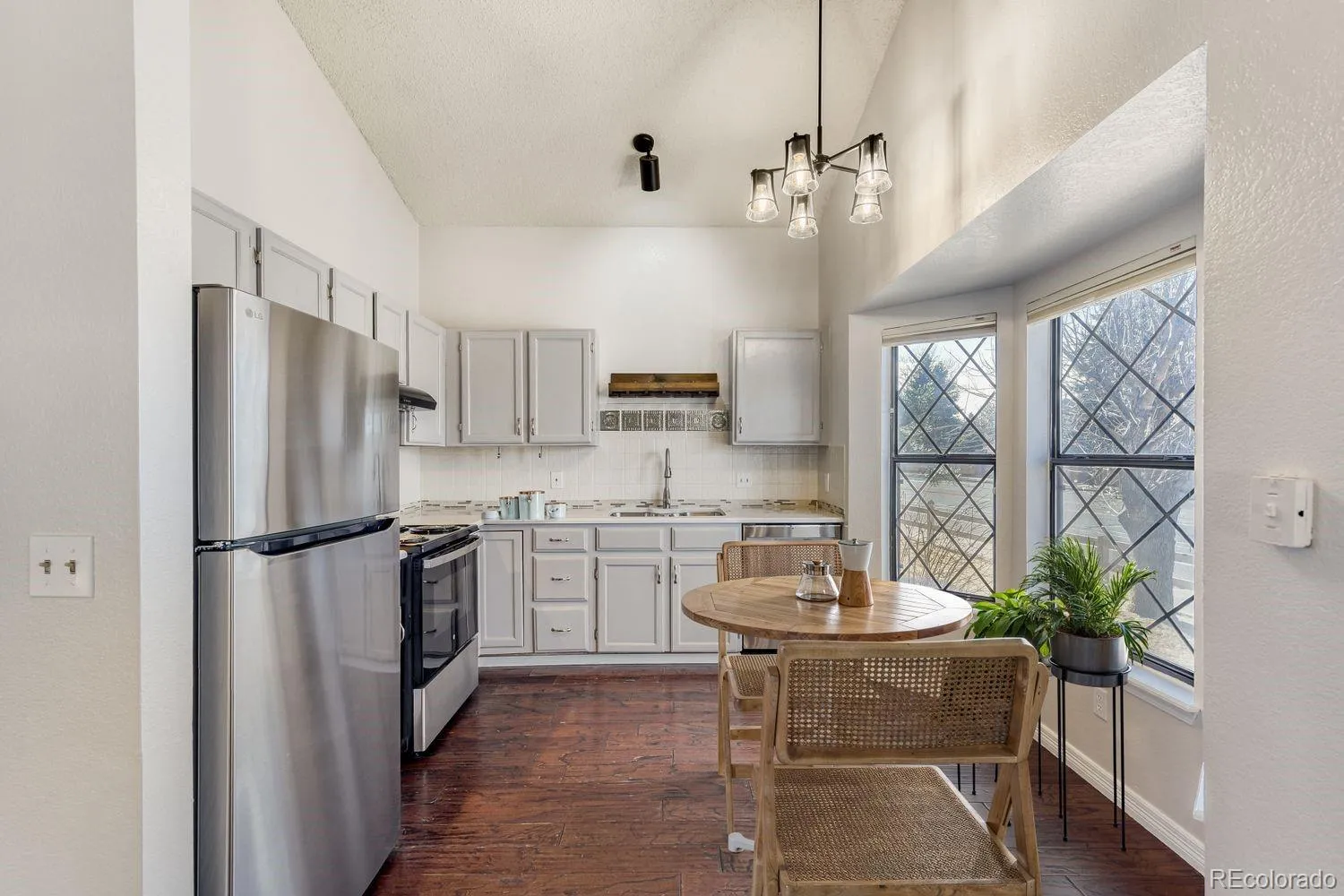 Natural light fills the open main level, highlighted by vaulted ceilings, fresh interior paint, and a cozy wood-burning fireplace. The updated kitchen combines style and functionality with stylish quartz countertops, brand new stainless steel appliances, and a modern sink and faucet—ideal for everyday living and entertaining.