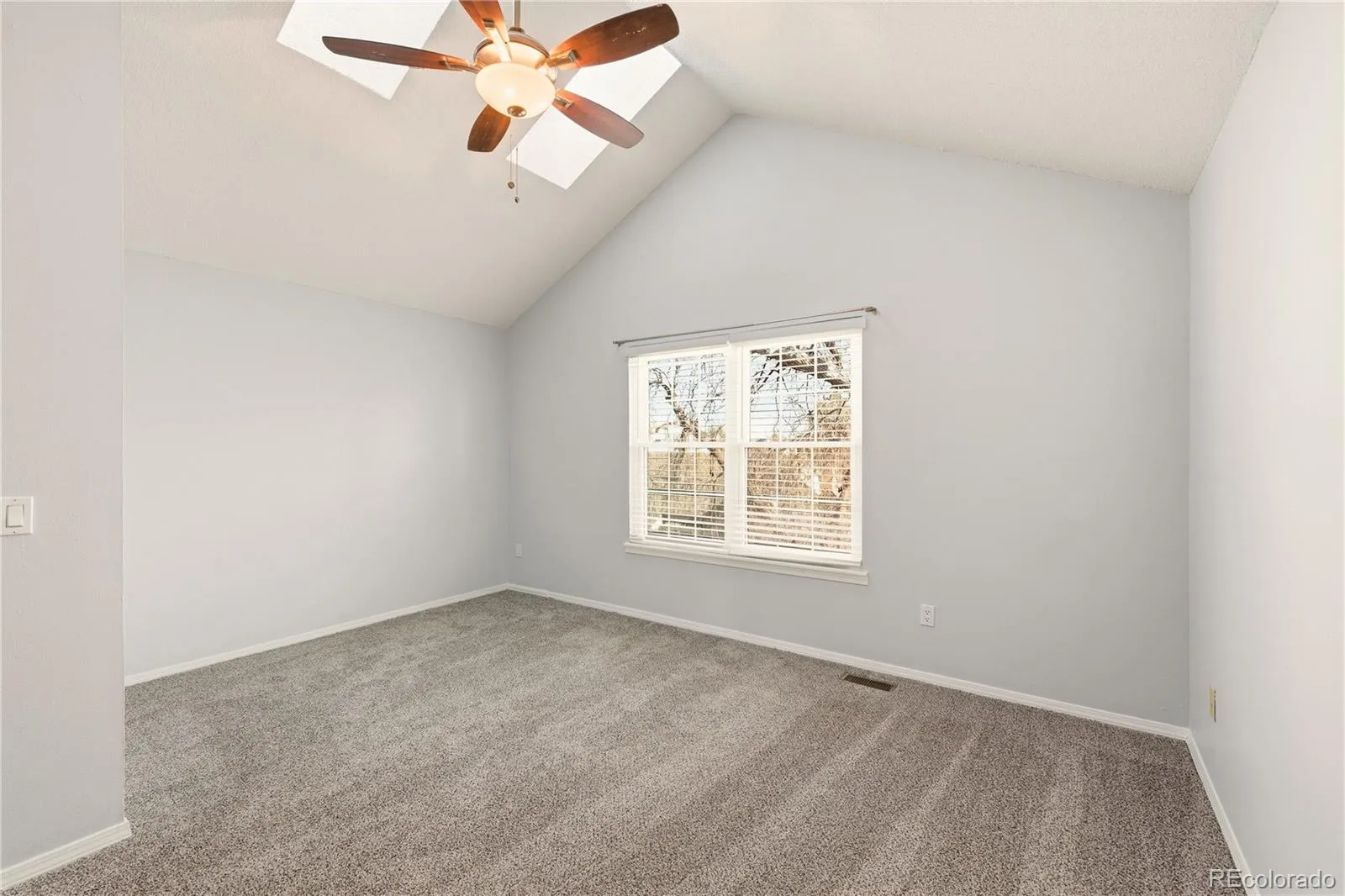 Upstairs, both bedrooms and bathrooms offer a peaceful retreat, featuring vaulted ceilings and skylights that fill the space with natural light and architectural character. Wake up to sunlight streaming in overhead and enjoy the sense of openness these elevated ceilings provide. Large closets ensure you’ll have plenty of storage space to stay organized without compromise. Ceiling fans add convenience and functionality.