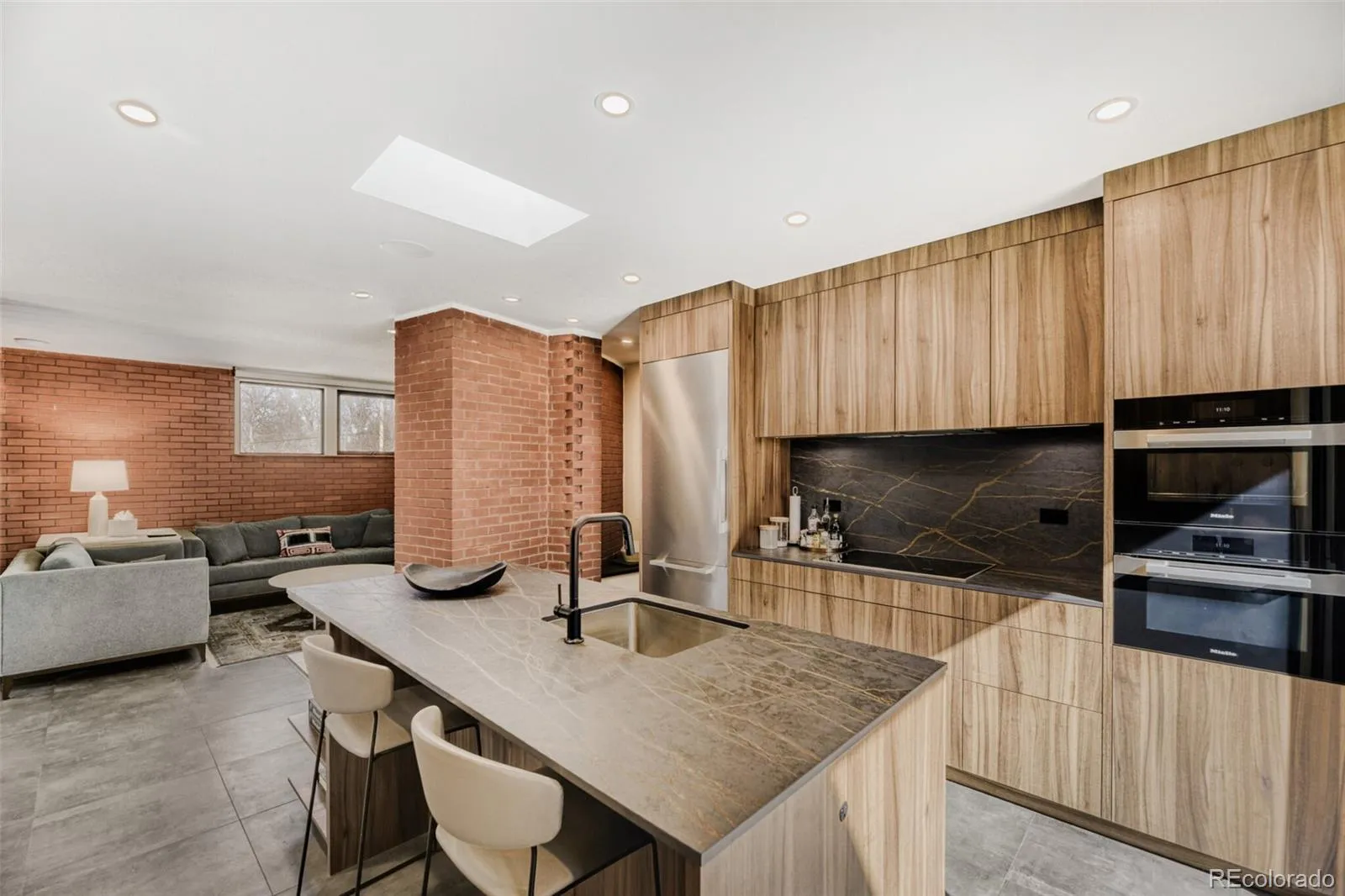 The gourmet kitchen showcases custom Leicht cabinetry with integrated lighting, luxurious Brizo fixtures, imported slab countertops from Spain and high-end Miele & Cove appliances. The primary suite is a private retreat, complete with a beautiful 5-piece bath showcasing slab countertops, imported luxury stone and materials, a deep soaking tub, and a stunning custom walk-in closet.