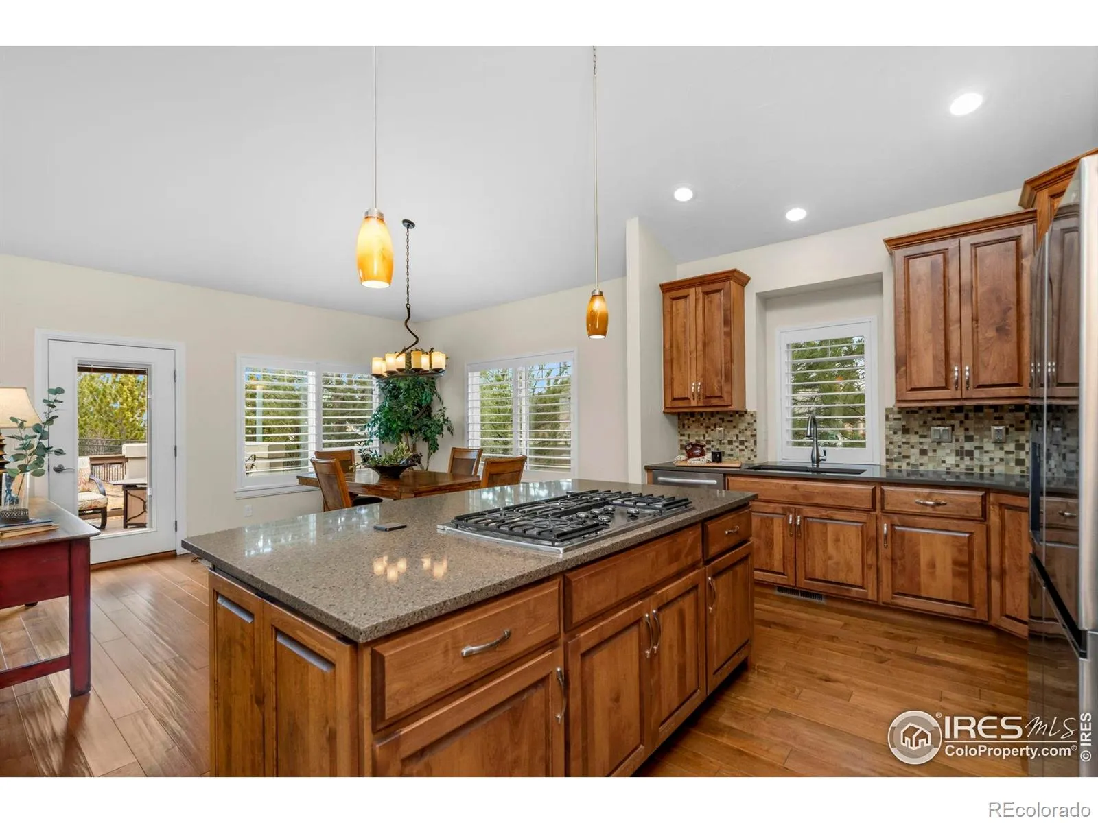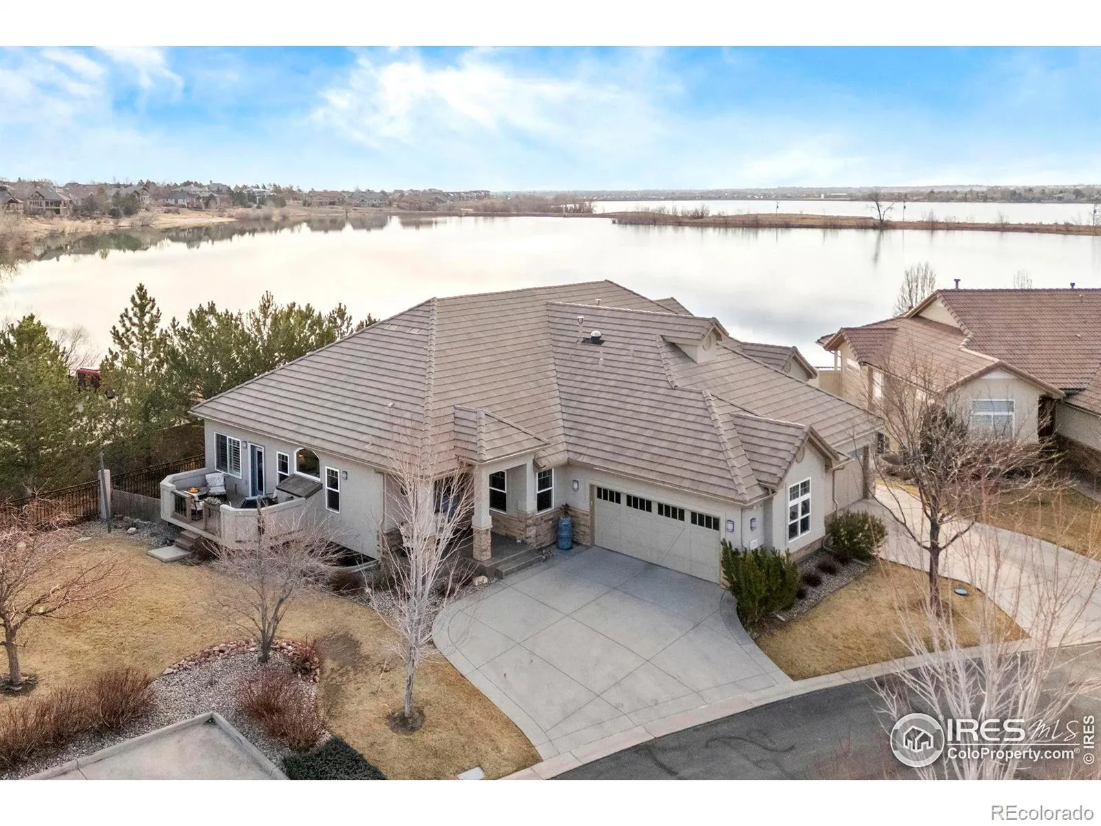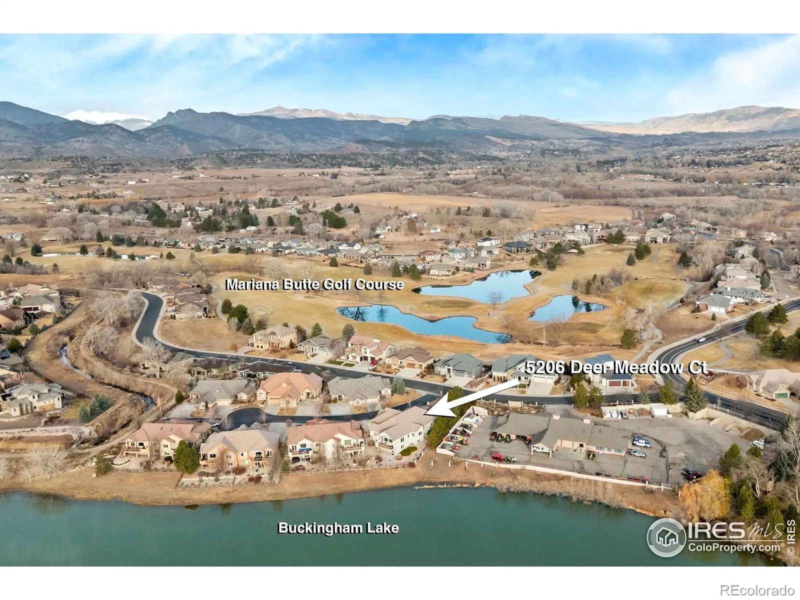 Wake up to sweeping mountain and Buckingham Lake views in this rare, maintenance-free end-unit ranch offering easy, lock-and-leave or stay-and-play living in desirable and active Mariana Butte in Loveland CO. Open and airy main level boasts vaulted ceilings, gas fireplace, expansive windows, plantation shutters, and dining area with deck access. Deck opens to green space with lovely mountain views and includes study posts for solar shades. Gourmet kitchen features quartz counters, tile backsplash, granite composite sink, built-in oven and microwave, XL gas cooktop, and large island. Gorgeous primary suite captures lake views and includes a spa-like bath with oversized designer shower, grand double vanity, private water closet, and oversized walk-in closet with custom shelving and solar tube. Main level also includes an office, powder bath, and dedicated laundry room with sink and abundant cabinetry. Well-designed garden-level basement with picturesque lake views features a spacious living room with gas fireplace. Bedrooms 2 and 3 share an upgraded bath with large tub, extended vanity, tile flooring and tub surround, ensuite access from Bedroom 2 plus hall entry. Dog run provides a convenient space for furry friends. Ample storage including basement storage room and 2-car garage.Thoughtfully designed to combine effortless, low-maintenance living with exceptional views and everyday functionality.