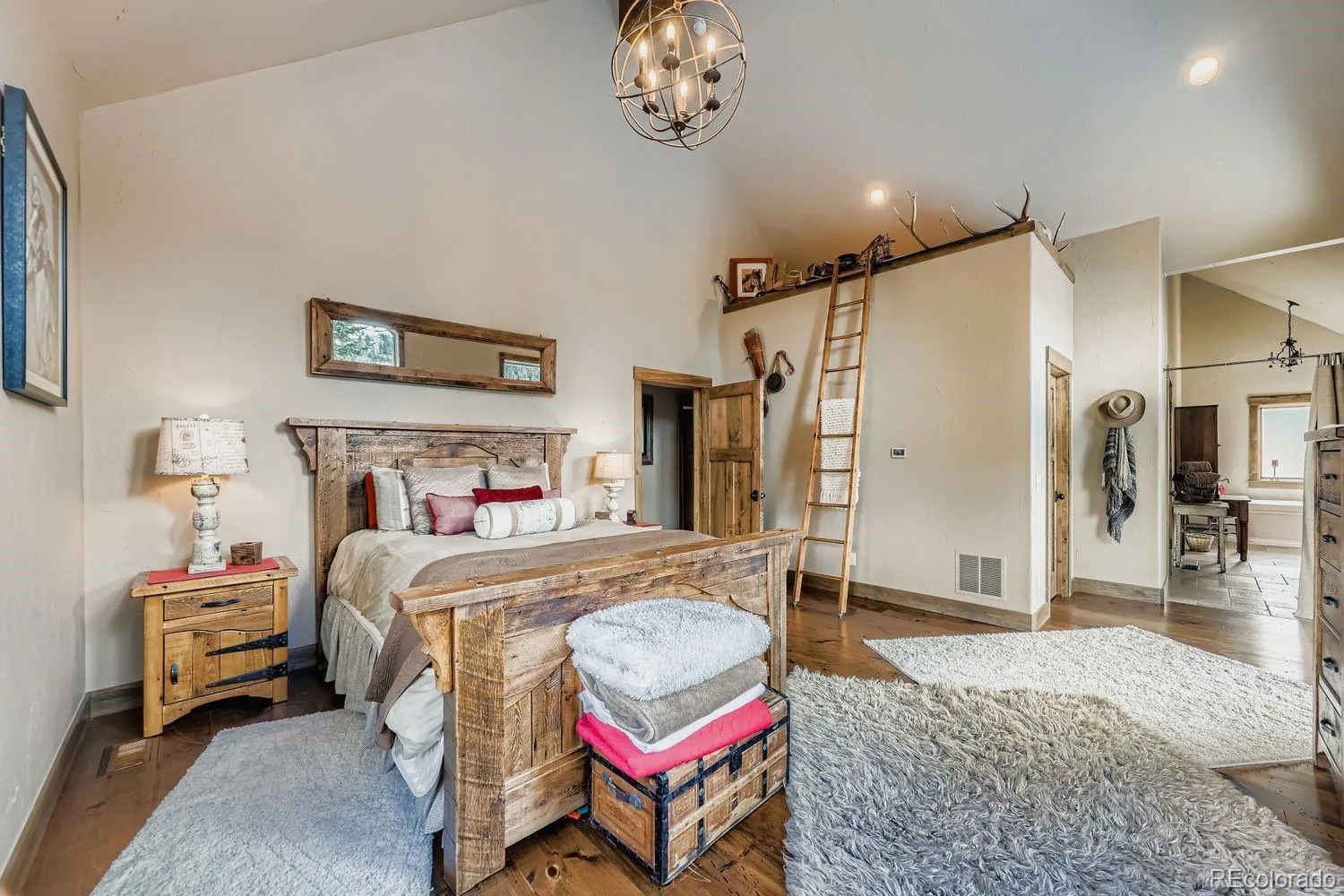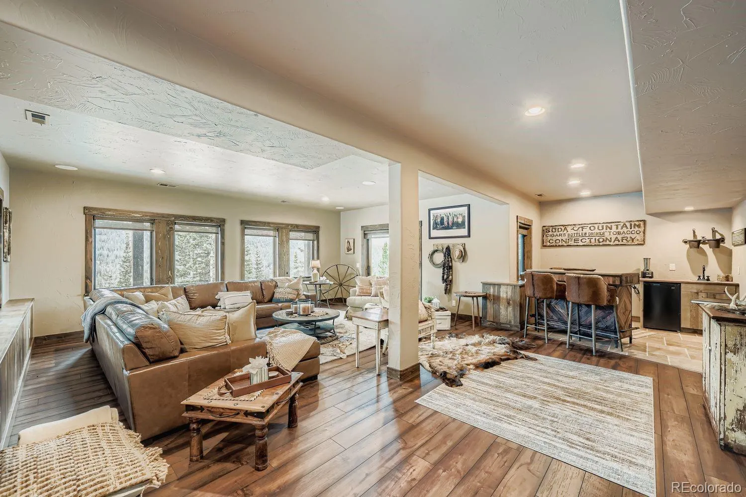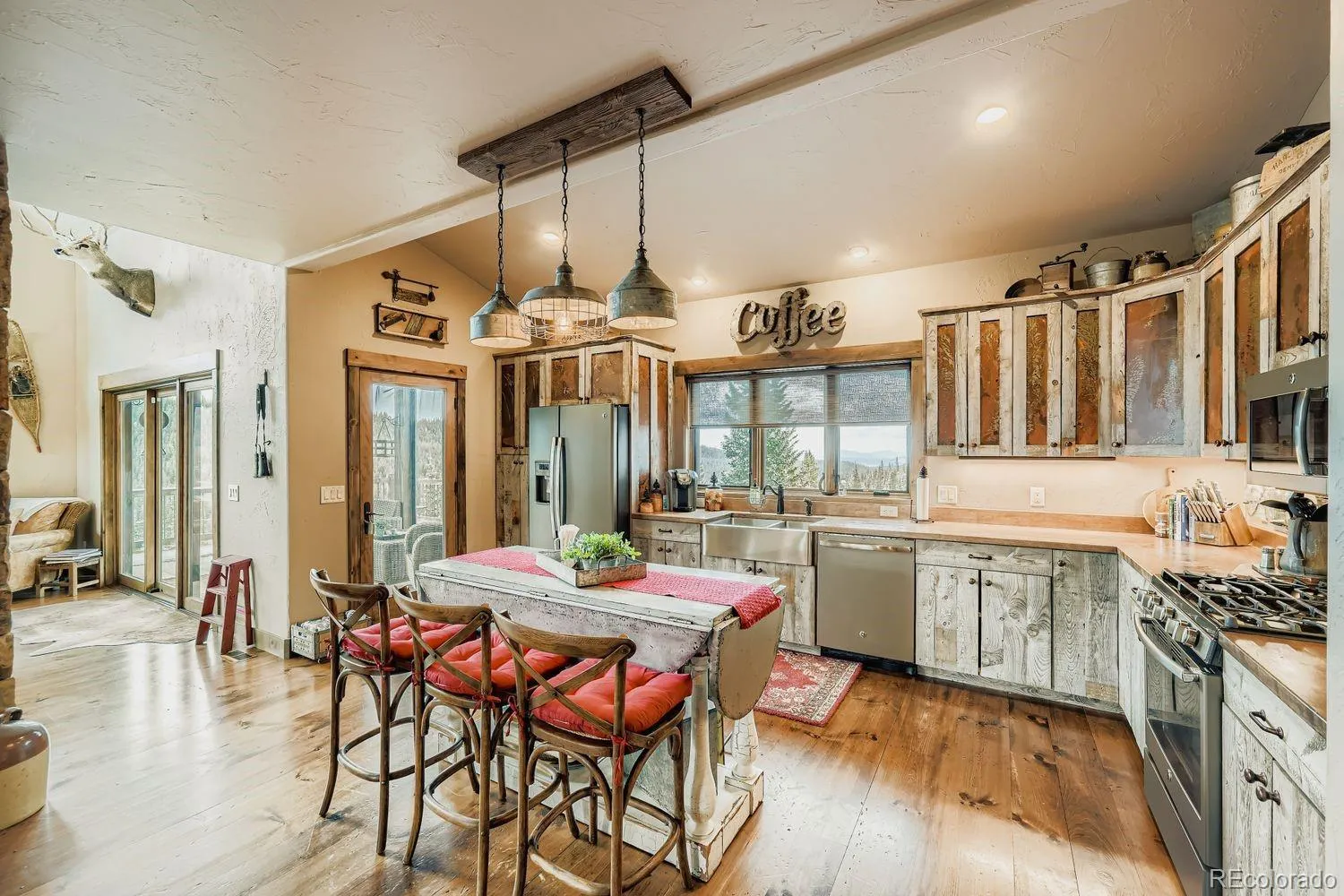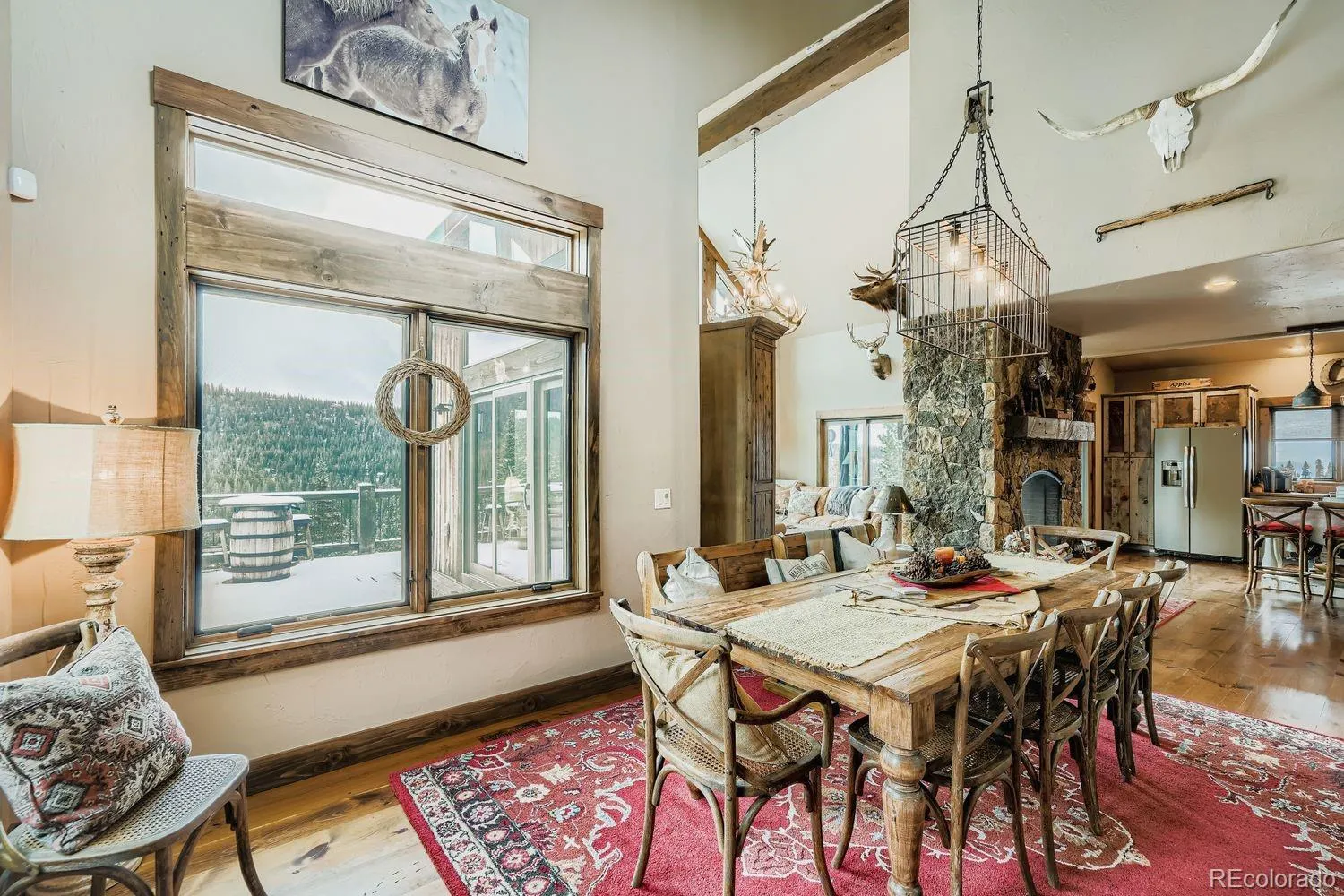 Rare New England pine floors anchor the interior, complimented by authentic moose and elk antler chandeliers as well as windmill-style ceiling fans that add architectural presence while honoring the surrounding alpine setting.