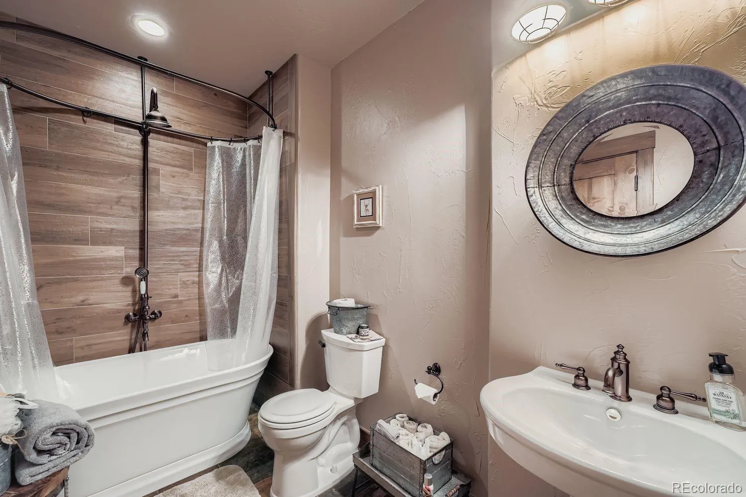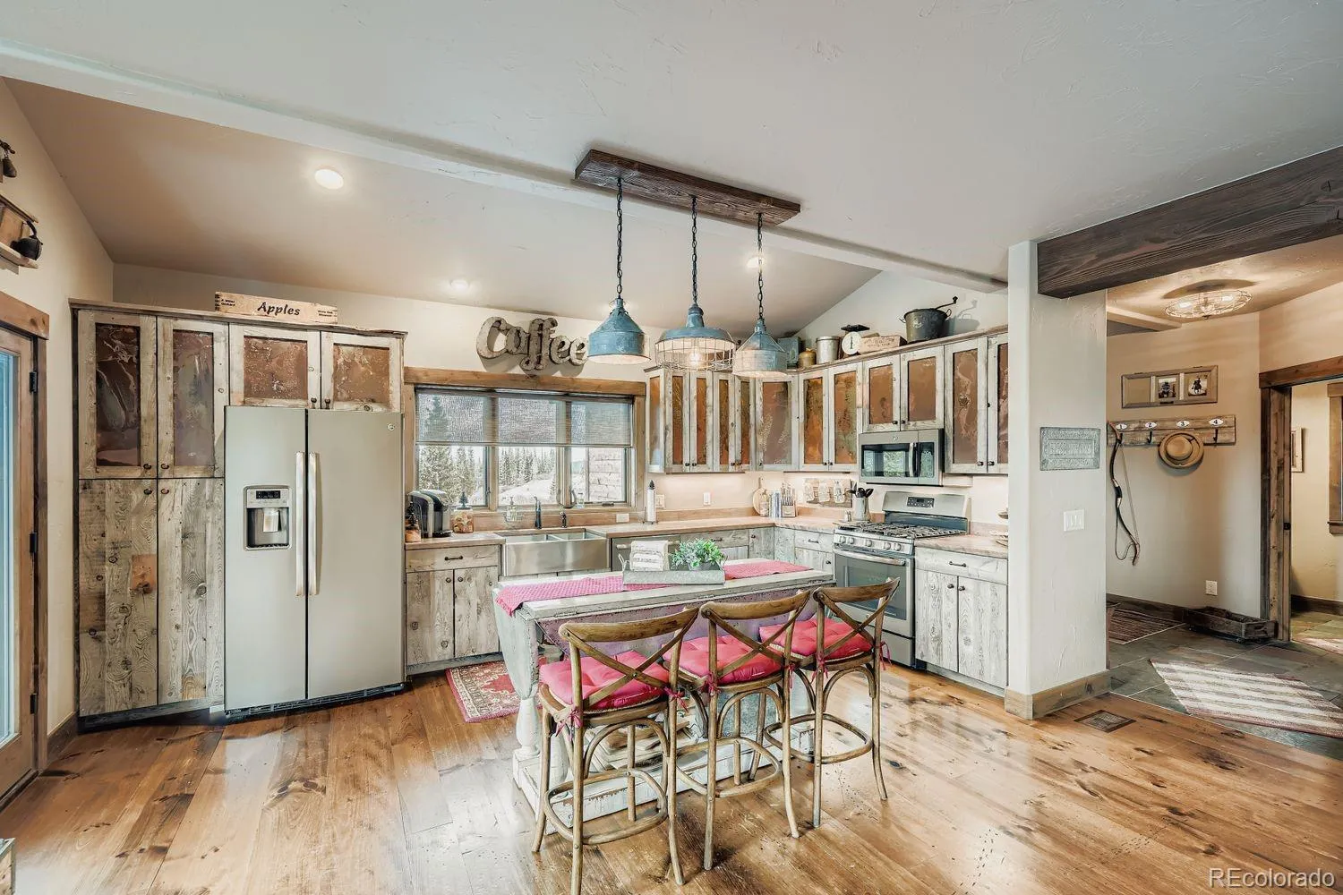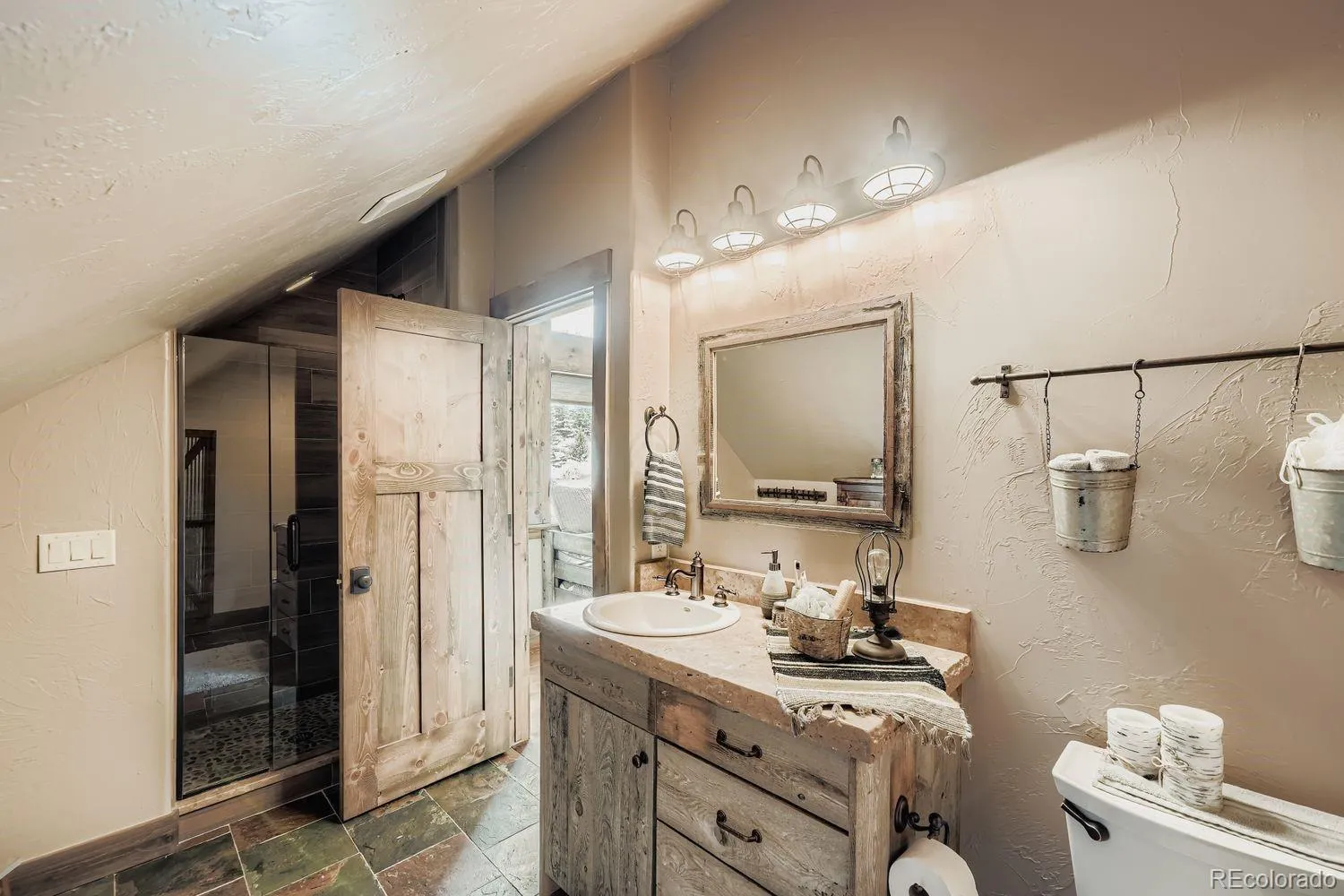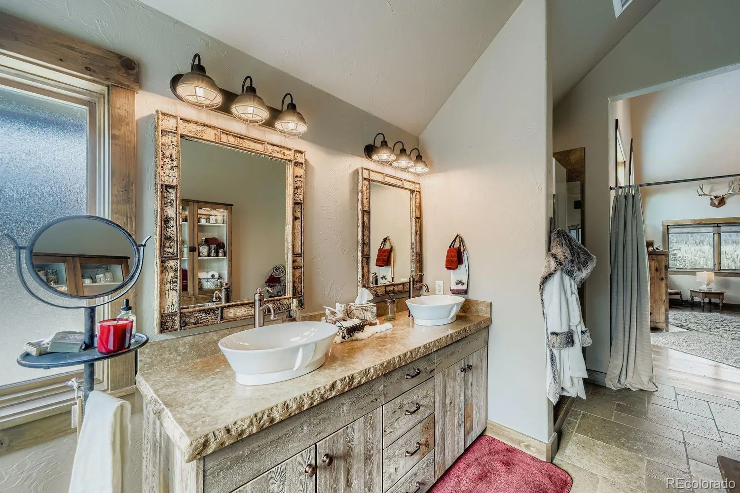 The exterior of the home possesses a beetle-kill siding framed with galvanized metal accents, blending rugged mountain durability with timeless design. Inside, you’ll find rich mountain inspired textiles including Mexican soapstone surfaces texturizing charm, while unique antique vanities replace the expected, offering one-of-a-kind character in lieu of the ordinary.