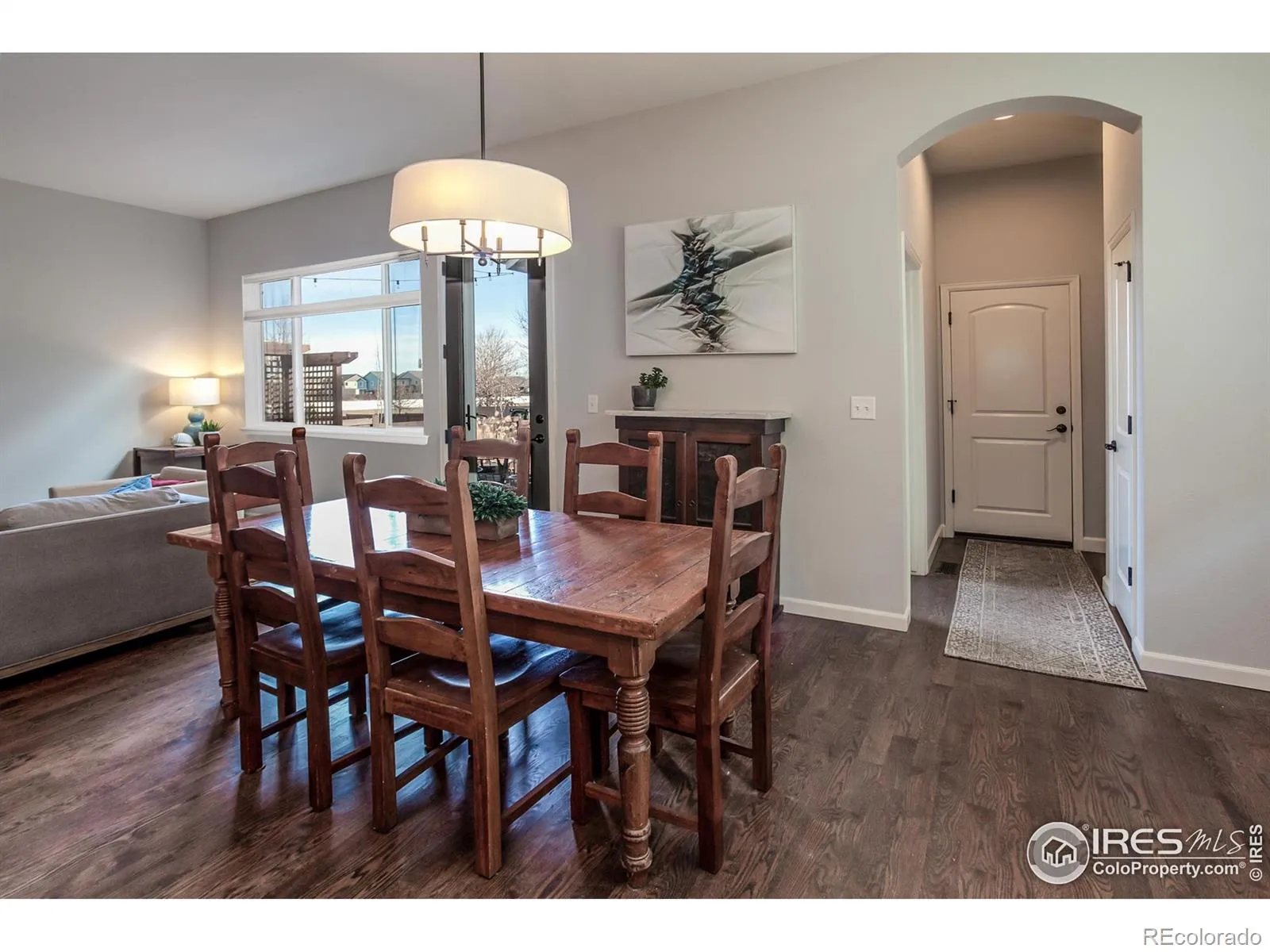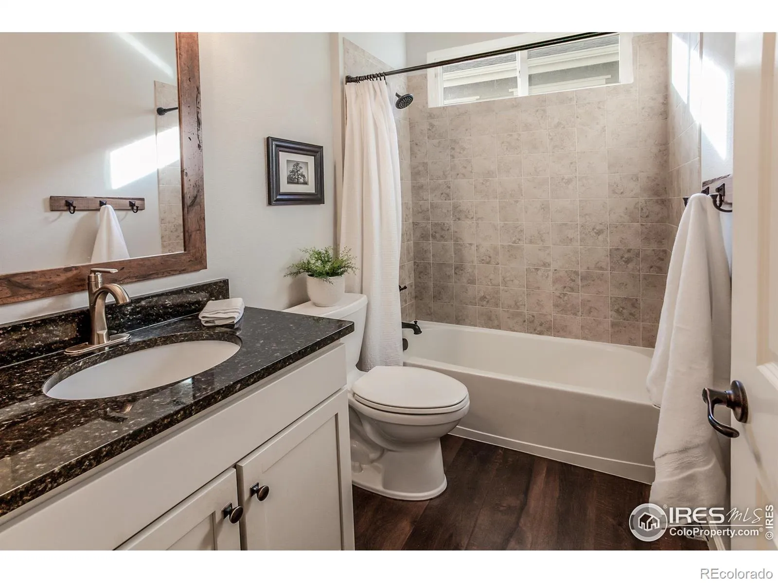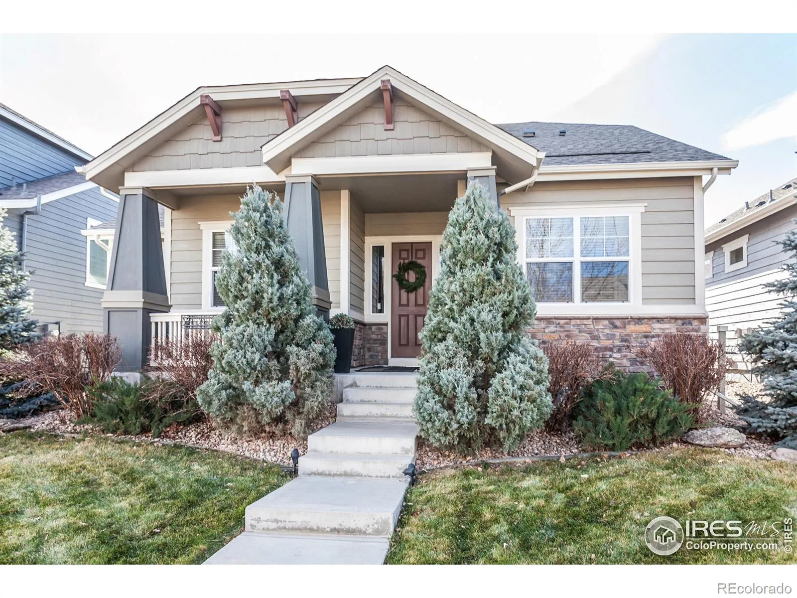 Welcome to this delightful ranch-style home, ideally located just minutes from Old Town Berthoud, world-class golf, fishing, trails, the new recreation center, and everything that makes life in Northern Colorado so special. Built in 2014 with solid 2×6 construction, this former model home for the community has been meticulously maintained, with tasteful upgrades added by the current owners. The timeless Craftsman exterior-freshly painted in 2024-makes a great first impression. Inside, you’re greeted by 10-foot ceilings and real hardwood floors. Two spacious main-level guest bedrooms sit just off the entry hall and share a full bath with updated flooring and fresh paint. The open-concept living area is the heart of the home, where the kitchen, dining, and family room flow seamlessly together. The kitchen features a large breakfast bar/island, white cabinetry, granite countertops, black hardware, and stainless steel appliances. The dining area comfortably seats 6-8, with additional nooks perfect for buffets or storage pieces. A drop zone with built-in lockers, main-level laundry with upper cabinets, and a convenient doggie door add everyday functionality. The attached oversized garage is insulated, finished, and includes a handy tool area. The private primary suite is thoughtfully separated from the guest bedrooms and overlooks the low-maintenance backyard. The primary bath boasts a stunning brand new walk-in shower with high-end imported tile and a frameless glass door. The basement offers 9-foot ceilings, a spacious rec room, third guest bedroom, full bath, and a large unfinished storage area with built-in shelving. Outdoors enjoy summer BBQs on the poured concrete patio (wired and “hot tub ready”) and evenings under the stars sat out around a fire pit. With convenient alley-way access, a very low HOA, neighborhood park, a new roof in 2024, and no metro tax make this an exceptional home in a cozy, hometown community. Click the virtual/video tour link for more info.