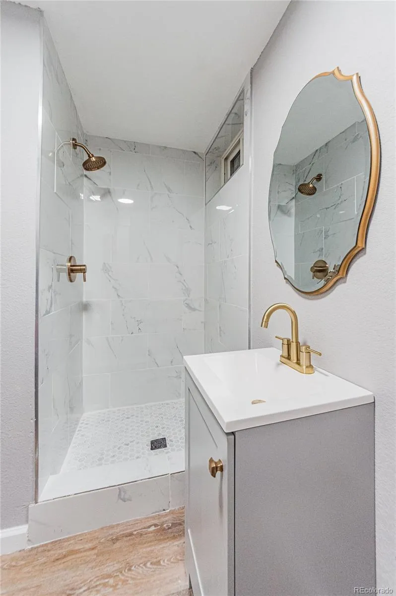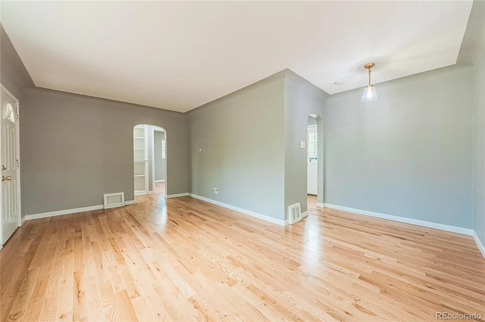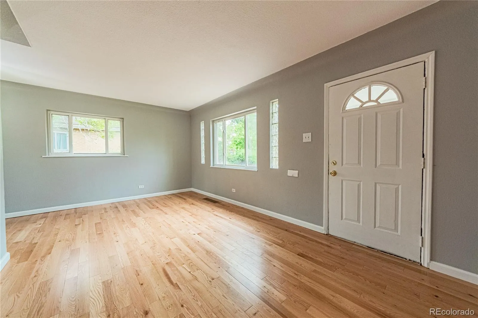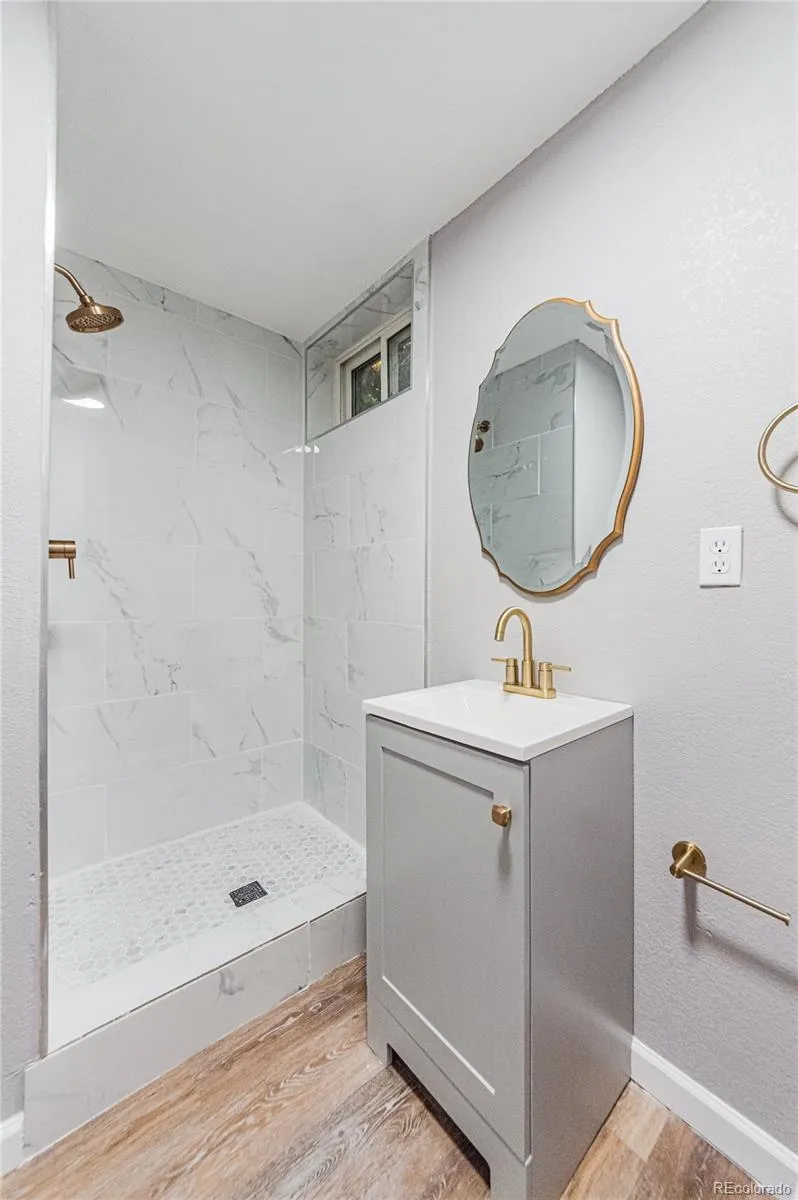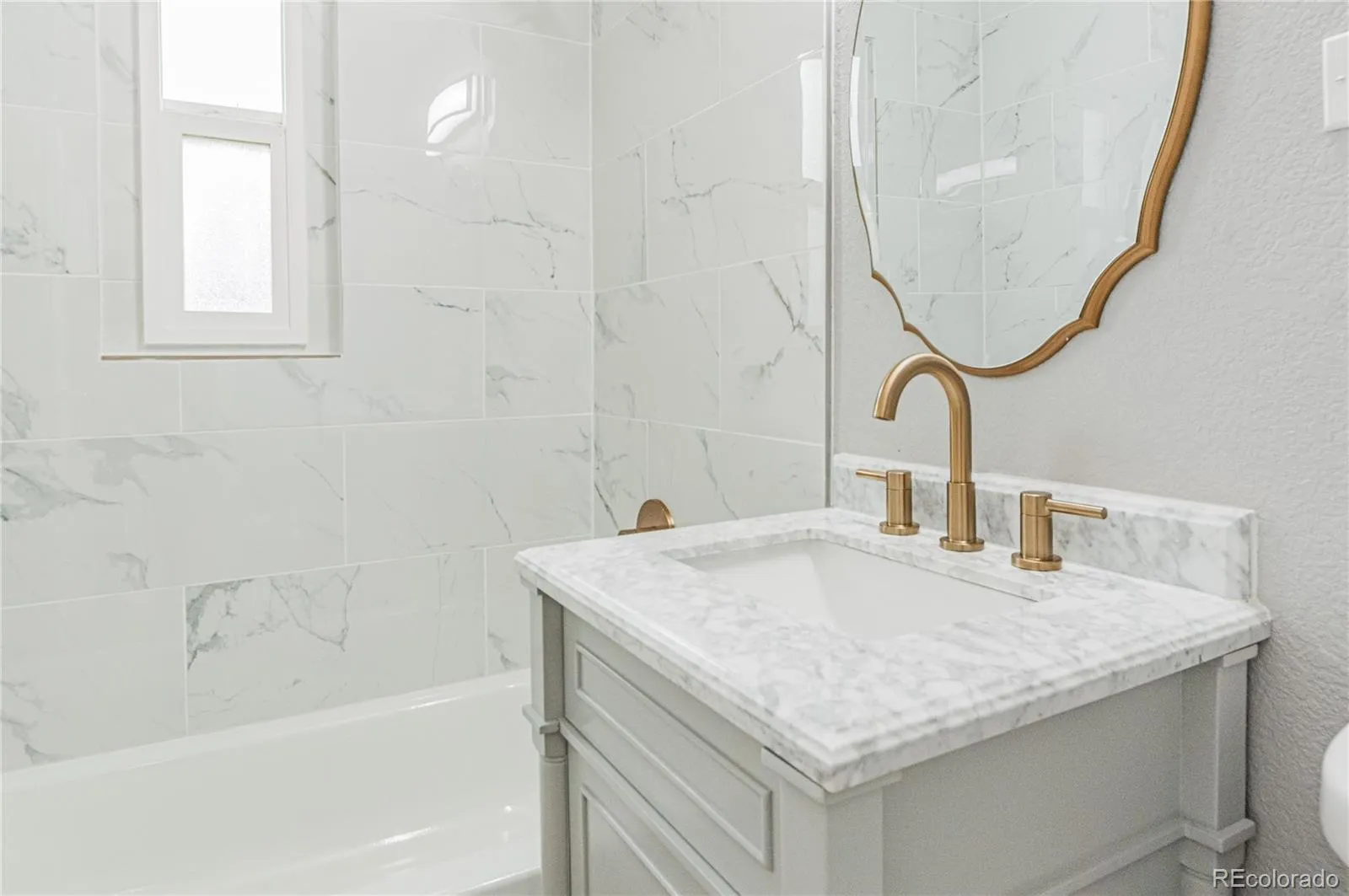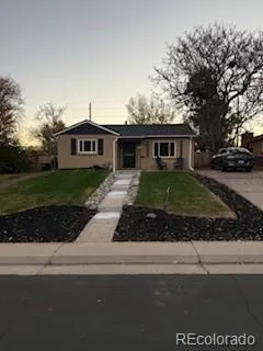 Amazing Park Hill brick ranch that has it all. Watch the sunset from your own front porch. Hardwood floors throughout main level lead you from living room open to dining room and down the hall to the primary bedroom and second bedroom with updated windows and good storage. The hall has a built in telephone table. The bathroom is updated with new vanity, tub and all custom tile. The kitchen is well appointed new with white shaker cabinets, stainless appliances and slab granite. Walk out to the oversized yard with a nice patio to entertain. Don’t worry, head downstairs for extra space with your 3rd and 4th conforming legal bedrooms, living space and laundry room plus second custom all new 3/4 bath. Certified roof, newer furnace and central AC. Plenty of off street parking in the driveway perched at the top of the block with tidy grass and mulch landscaping.