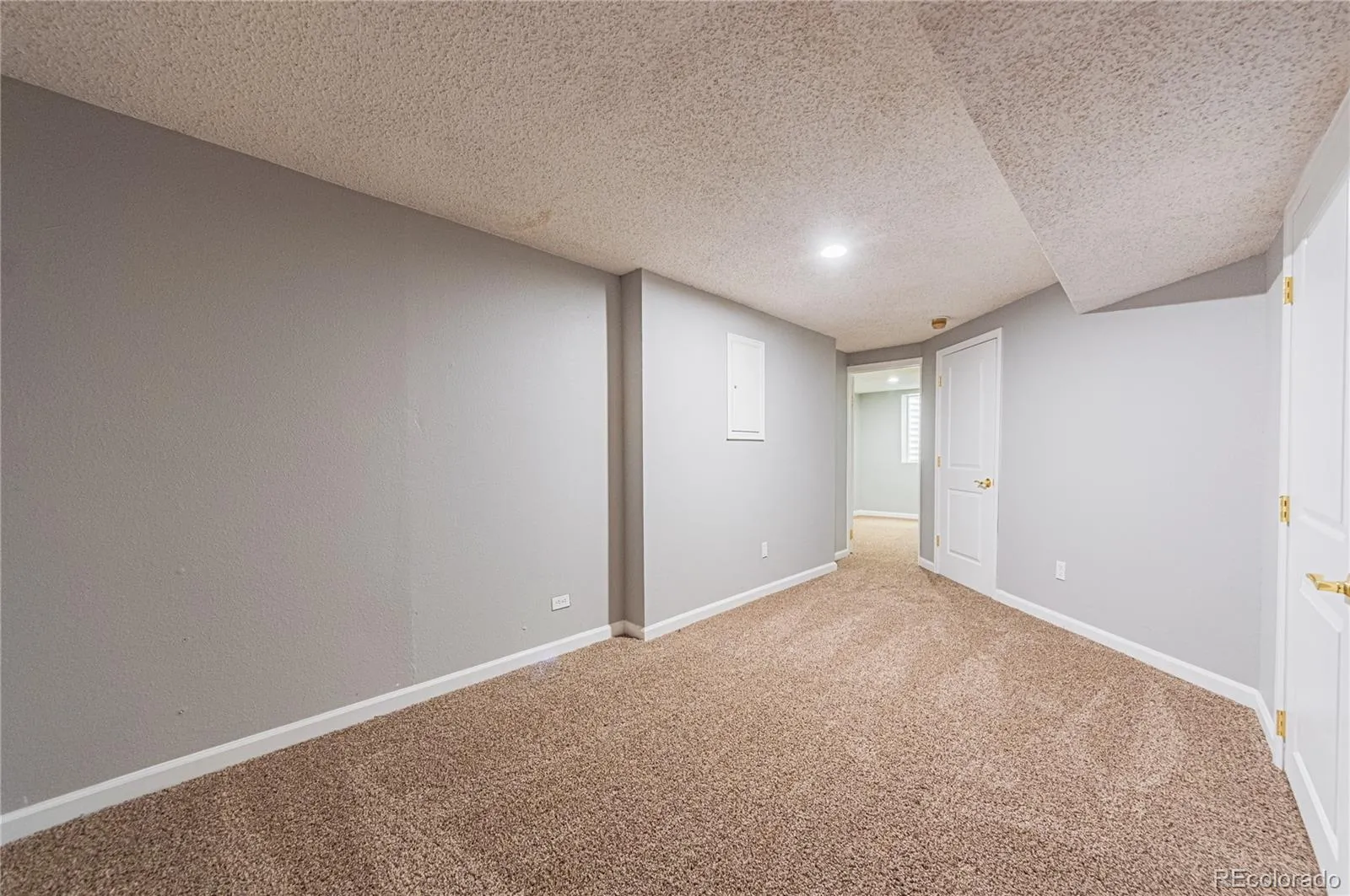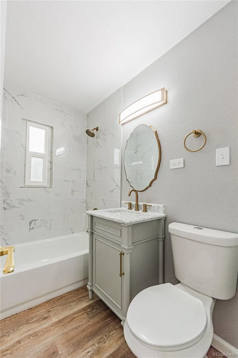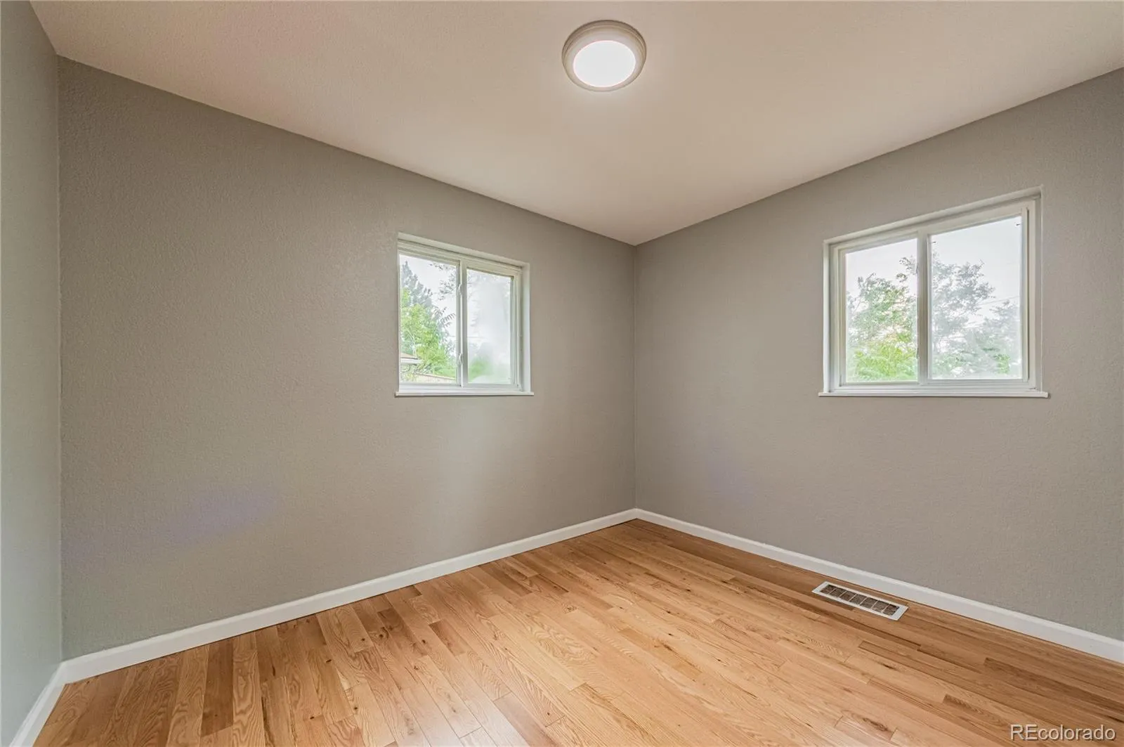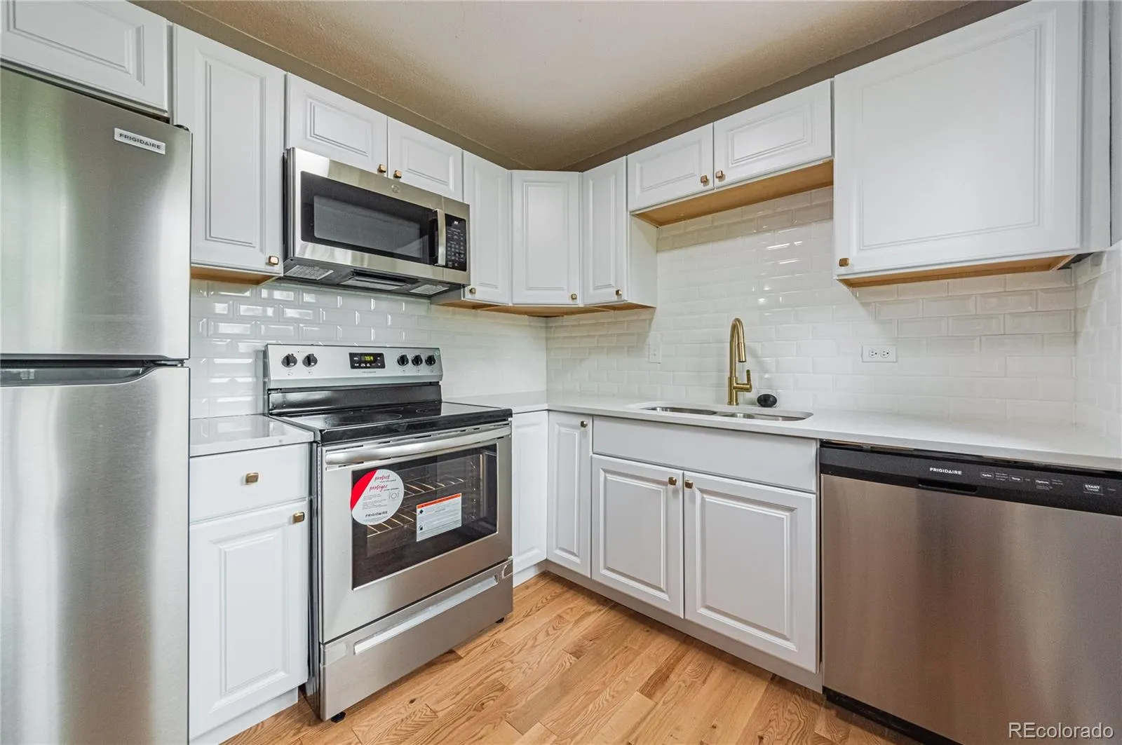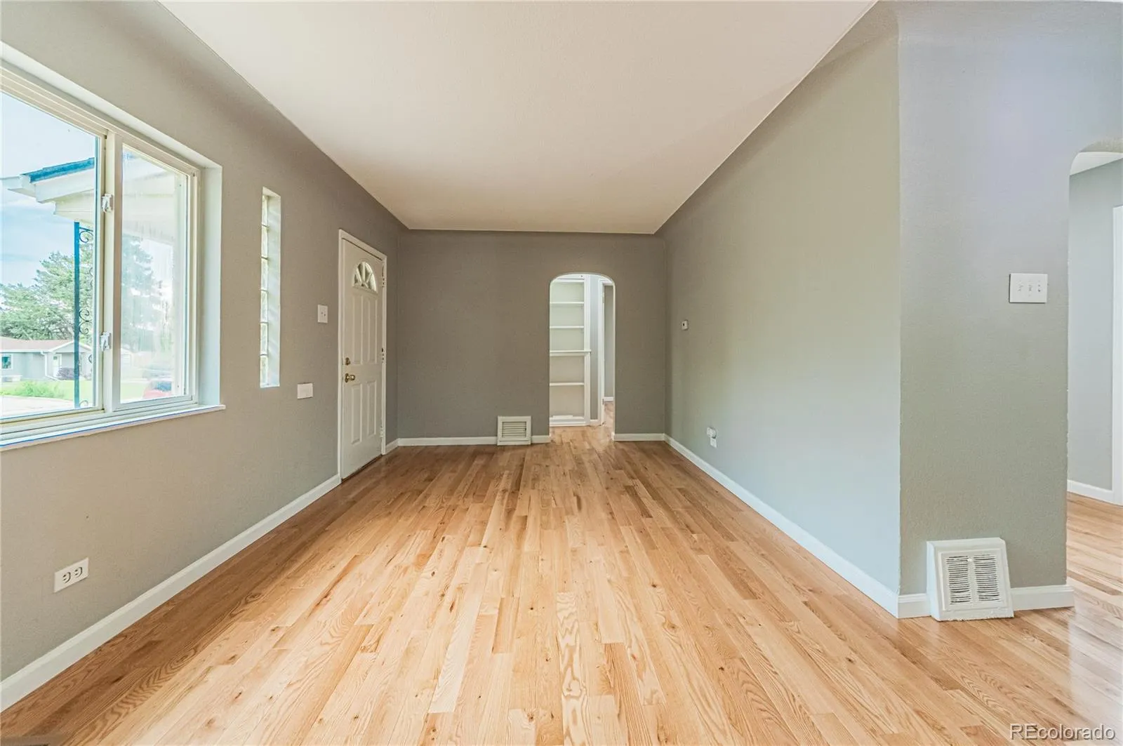 Amazing Park Hill brick ranch that has it all. Watch the sunset from your own front porch. Hardwood floors throughout main level lead you from living room open to dining room and down the hall to the primary bedroom and second bedroom with updated windows and good storage. The hall has a built in telephone table. The bathroom is updated with new vanity, tub and all custom tile. The kitchen is well appointed new with white shaker cabinets, stainless appliances and slab granite. Walk out to the oversized yard with a nice patio to entertain. Don’t worry, head downstairs for extra space with your 3rd and 4th conforming legal bedrooms, living space and laundry room plus second custom all new 3/4 bath. Certified roof, newer furnace and central AC. Plenty of off street parking in the driveway perched at the top of the block with tidy grass and mulch landscaping.