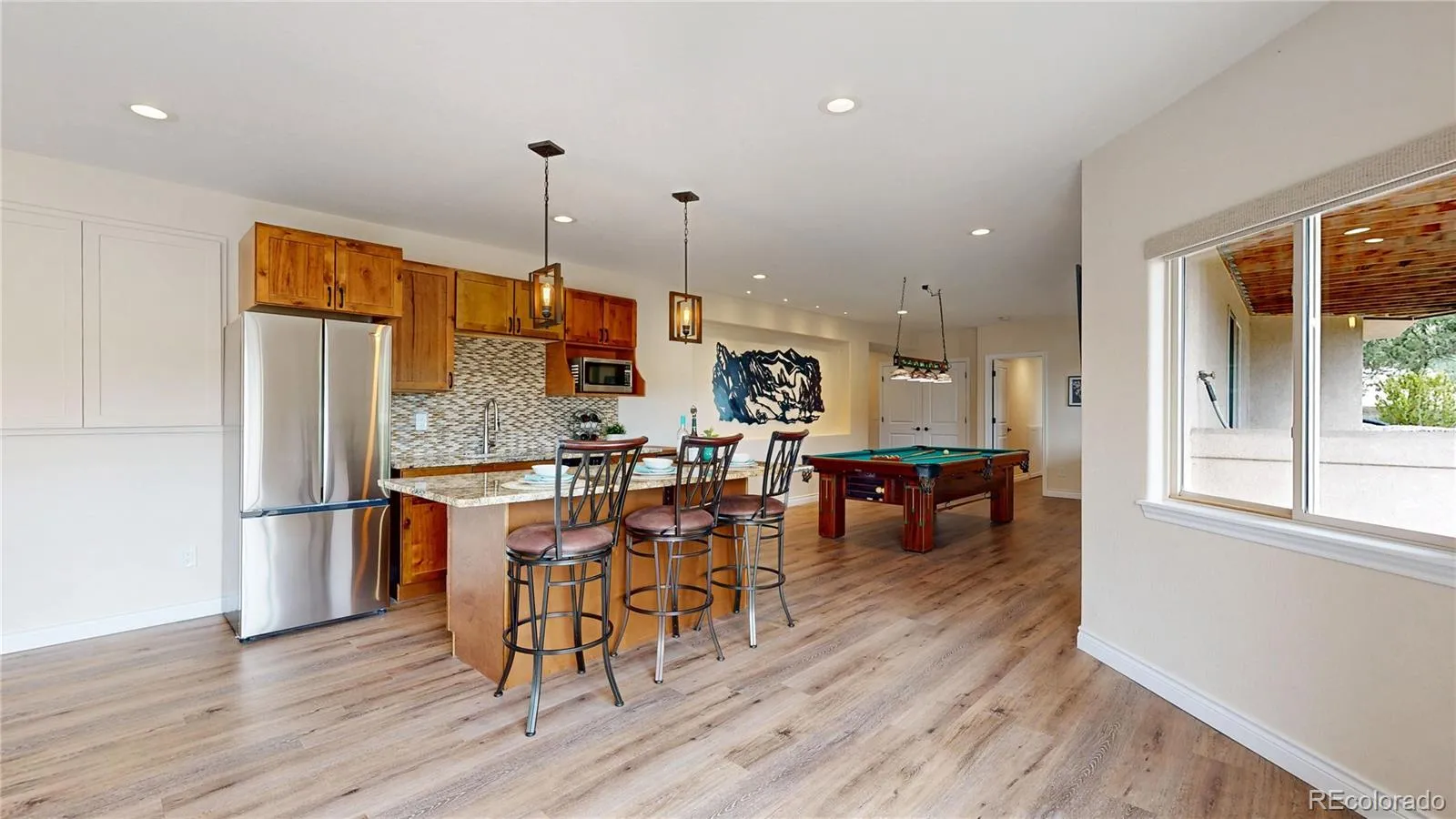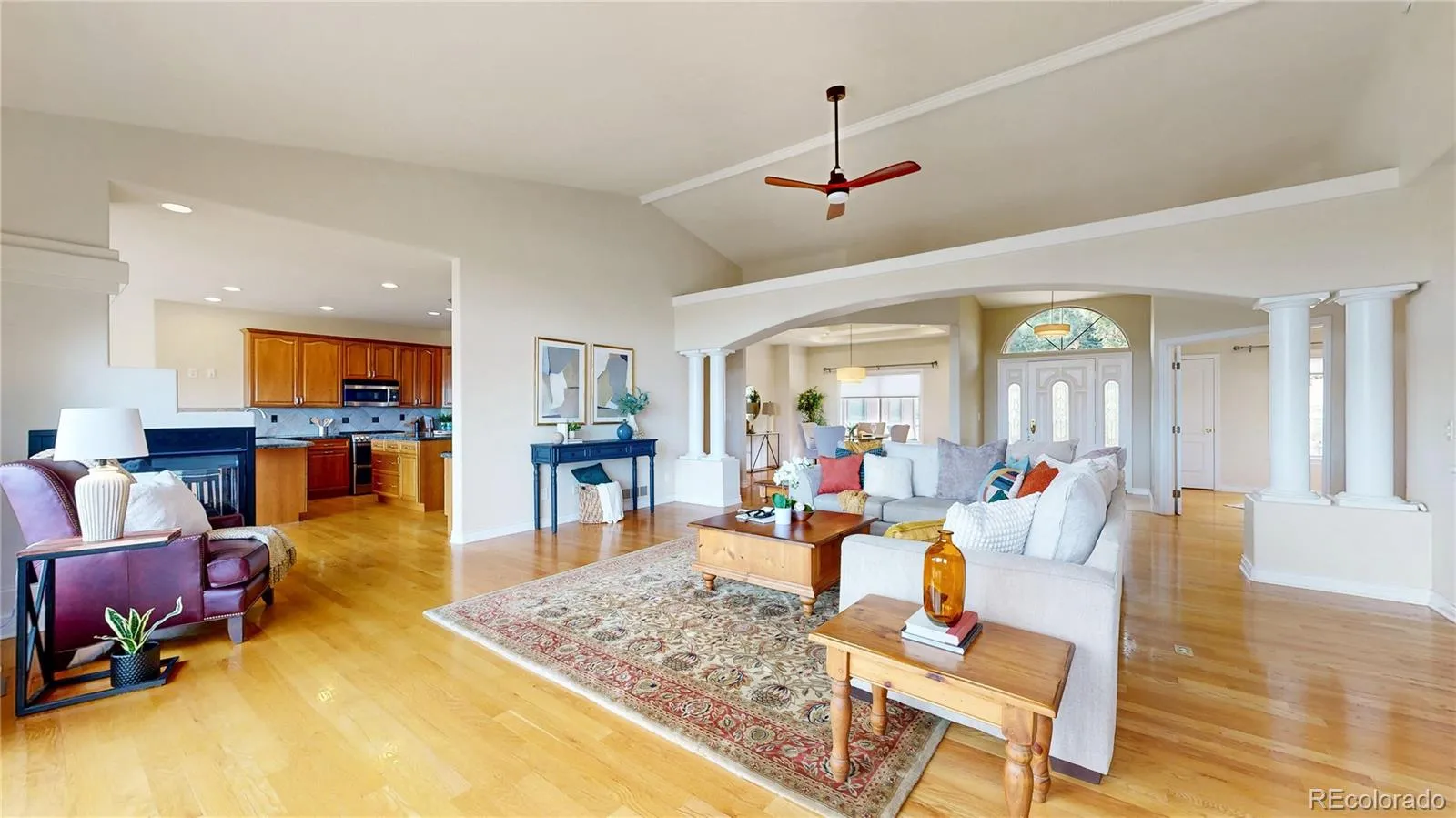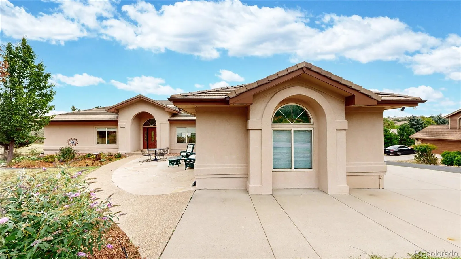 This Roxborough Park ranch-style home showcases views of Arrowhead Golf Course, ancient red rock formations, and the glittering city lights! Step inside to a spacious great room that flows seamlessly into the formal dining area-deal for hosting gatherings both large and intimate. Hardwood floors run throughout the main level, with soft carpet in the bedrooms and tile in the baths. The dining room features a convenient dry bar, a linen-drum light fixture, and space for varied table styles plus a buffet or sideboard. Just inside the foyer, a private study with French doors and custom ceiling detail creates a sophisticated home office. The gourmet eat-in kitchen impresses with slab granite counters, large island, and walk-in pantry, making it a chef’s dream. The expansive primary suite offers new carpet, a sitting area, five-piece bath, walk-in closet, and glass doors to the composite deck. The retreat easily accommodates a reading nook or second office. The updated guest bath highlights an artistic copper dragonfly sink—sure to spark conversation—and 2 secondary bedrooms share a functional Jack-and-Jill bath. The main-floor laundry includes washer, dryer, utility sink, and cabinetry for storage. The newly finished walkout level is designed for entertaining with LVP flooring, a wet bar, seating area with gas log fireplace, and recreation space perfect for a pool table, fitness area, or media setup. The spa-inspired ¾ bath adjoins a spacious guest bedroom. A workshop, large storage/utility room, and a crawlspace, ensure abundant storage. Outdoor living shines with a newer composite deck, a walled area ideal for a dog run, and a large front flagstone patio that easily hosts multiple seating groups. The three-car garage provides room for cars, toys, and tools. Siding and facing designated greenbelts, this home enjoys privacy and a wide-open feel with nature surrounding you—yet all within minutes of trails, Roxborough State Park, and conveniences.