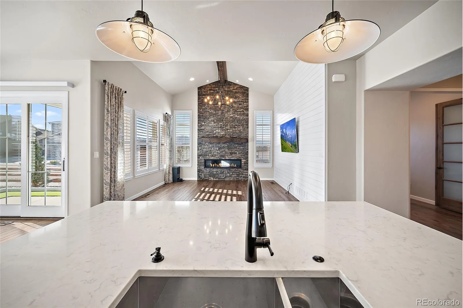 Experience refined main-level living in this stunning semi-custom ranch, thoughtfully designed and loaded with exceptional upgrades, located in the prestigious Flying Horse community. Immaculately maintained, this home sits on a beautifully landscaped corner lot with mountain views, a finished basement, and an oversized 3-car garage. The inviting great room features a beamed cathedral ceiling, floor-to-ceiling stone fireplace, wood flooring, and a striking shiplap accent wall. The gourmet kitchen impresses with a 5-burner gas cooktop, double ovens, stately vent hood, quartz countertops, brick backsplash, expansive island with seating and walk-in pantry. The adjoining light-filled dining area walks out to a partially covered patio, perfect for indoor-outdoor entertaining. A main-level office with 8’ French doors offers an ideal work-from-home space. The primary retreat boasts 12’ ceilings, abundant windows, and a ceiling fan. The spa inspired 5-piece bath includes a soaking tub, double quartz vanity, custom tile, and walk-in shower with pebbled tile floor. The custom walk-in closet features built-ins and generous storage. A second main-level bedroom with adjoining full bath provides private guest accommodations. The finished basement offers 9’ ceilings, a gas fireplace, spacious family room with wet bar and quartz counters, two additional bedrooms with walk-in closets, and a full bath. An unfinished flex space allows for future expansion. Enjoy exceptional outdoor living with a natural gas fire pit. Tesla solar panels and charging station included. Walking distance to The Club at Flying Horse and conveniently near Academy School District schools, Highway 83, Powers Boulevard, and Northgate Boulevard. A rare opportunity for luxurious main-level living in one of Colorado Springs’ most sought-after communities.