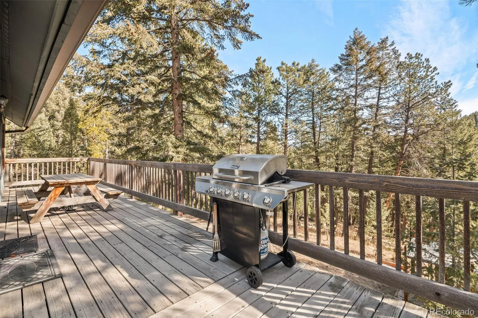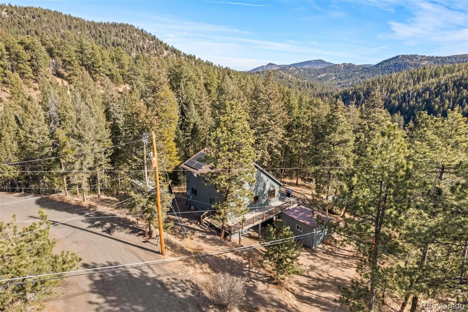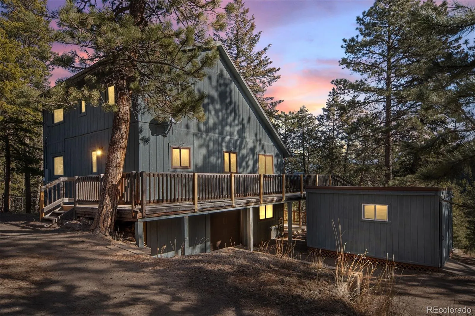 Welcome to your private mountain escape in Evergreen—an updated 3-bedroom home that lives large with open surroundings and a direct border to Arapahoe National Forest. With undeveloped land behind you, sweeping forest views, and Maxwell Falls within walking distance, this property delivers that rare “more land than the deed” feeling. The setting shines from the start: RV parking with 30-amp service, fire mitigation, a secluded backyard, horseshoe pits, and a quaint kids’ clubhouse. Outdoor lovers will appreciate the large shed with a wood loft plus room for recreational toys and more. Inside, mountain character meets smart upgrades—log/wood accents, fresh interior paint, and updated lighting. The remodeled kitchen features newer stainless-steel appliances. The main bath offers new tile, a corner shower, and a stacked high-efficiency front-load washer/dryer. The open dining/living area includes vaulted ceilings and a centrally located pellet stove for cozy, efficient heat. One spacious bedroom sits on the main floor. Upstairs, enjoy a renovated full bath and two large bedrooms with newer carpet. The walk-out lower level has new stair carpet and luxury vinyl tile, a family room with a wood-burning fireplace, and a true hobby/crafter’s paradise with counters, cabinets, and a bonus room. A generous attic provides exceptional storage. Extras include a newer water heater and updated filtration/softener system. Served by Brook Forest Water District, you’ll have peace of mind—water flows even during mountain power outages. Just 10 minutes to downtown Evergreen. Multiple big decks and a hot tub make forest days last longer. Soak under the stars, host easily, and step out into the forest—right from your yard. Sip coffee as elk and deer pass by, then unwind under the stars—this is Colorado mountain living with modern comfort and room to roam. Welcome home.