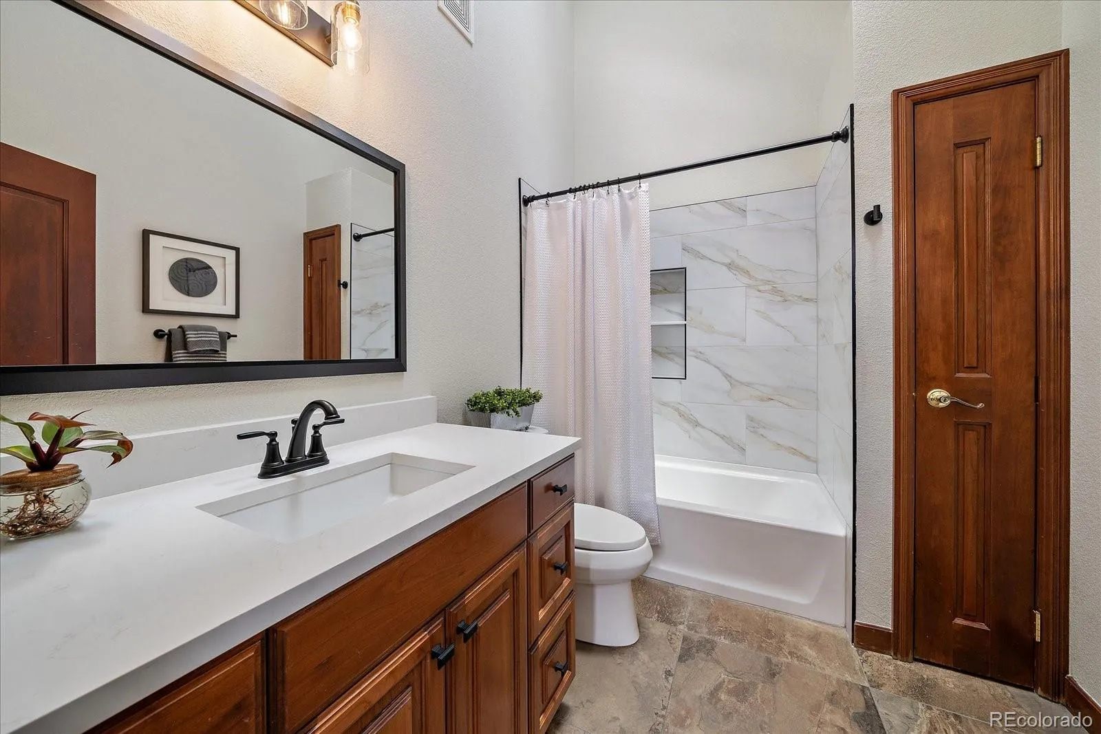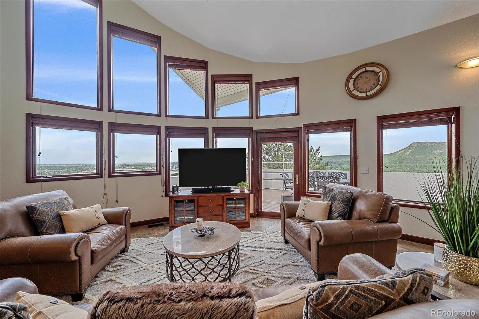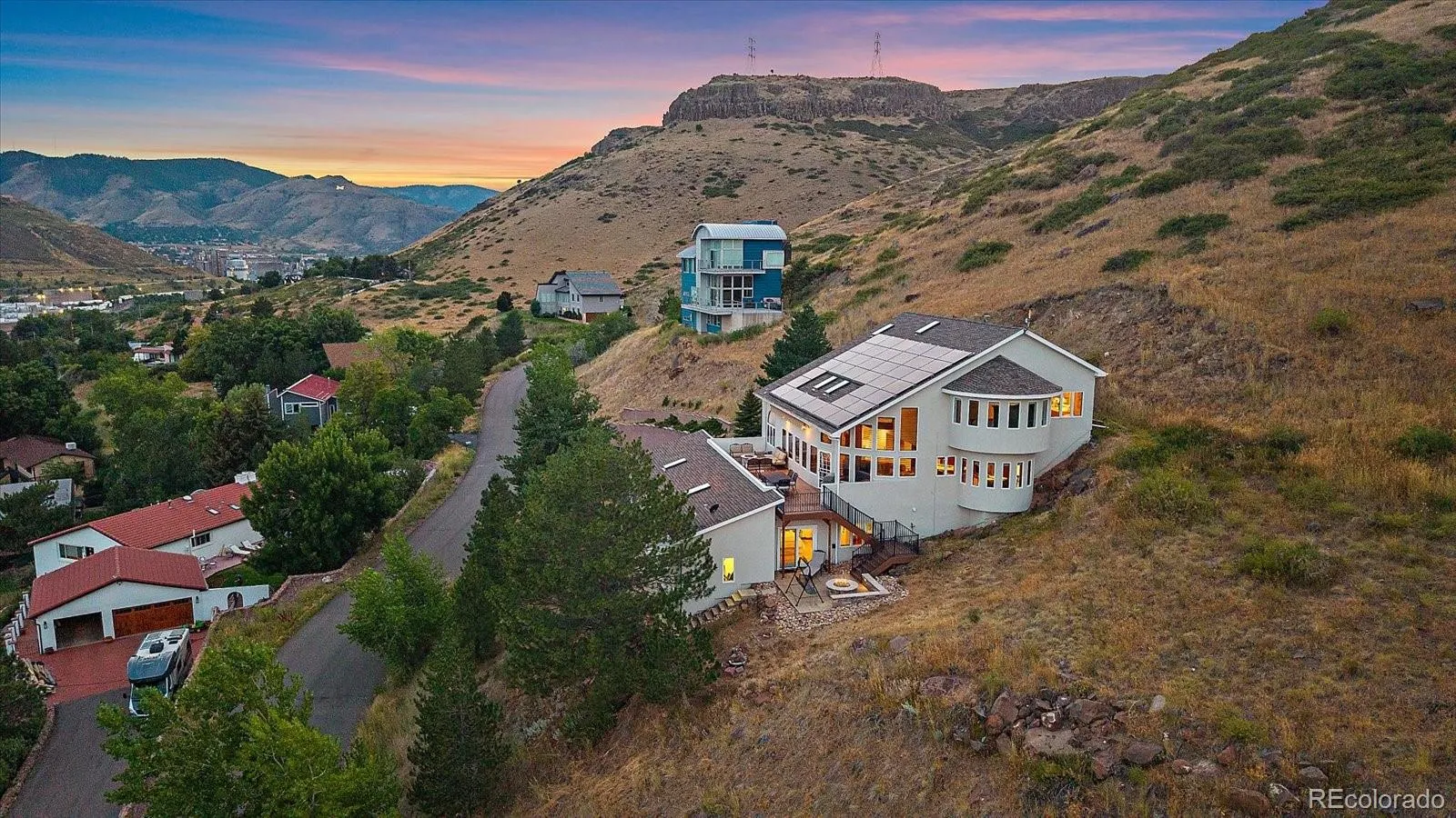 Perched atop North Table Mountain, this one-of-a-kind home offers the rare experience of mountain living with sweeping, unobstructed views—while remaining just minutes from the heart of downtown Golden. From sunrise to sunset, enjoy breathtaking vistas of Golden, downtown Denver, North & South Table Mountain, and the surrounding foothills. The home welcomes you with a grand foyer and exquisite craftsmanship throughout. The main level features rich cherrywood paneling in the office and dining room, setting a warm, refined tone. A spacious kitchen with granite countertops, SS appliances, and a sunny dining nook flows seamlessly into the formal dining room and light-filled great room, where expansive windows frame the scenery. Step onto the deck to take in panoramic views and Colorado’s ever-changing skies. An office with a double-sided fireplace, a remodeled powder bath, and a flexible bonus room currently used as a bedroom complete the main level. Upstairs, the primary suite is a peaceful retreat with large windows and a newly remodeled five-piece bath. Two additional bedrooms and an updated full bath complete the upper level. The walk-out basement is ideal for entertaining, featuring a spacious family room with media center, wet bar, ¾ bath, and a versatile bonus room that can function as another bedroom area. Outside, a lower patio with a built-in fire pit offers the perfect place to unwind and enjoy the quiet surroundings. In addition to a two-car garage, the property includes a massive RV garage—currently set up as a game room with a removable wall—offering endless flexibility for recreation, storage, or hobbies. This exceptional location blends privacy, open space, and trail access with the convenience of being minutes from downtown Golden’s shops, restaurants, and cultural attractions. With abundant wildlife, stunning scenery, and easy commutes to Boulder and Denver, North Table Mountain remains one of the Front Range’s most sought-after places to call home.