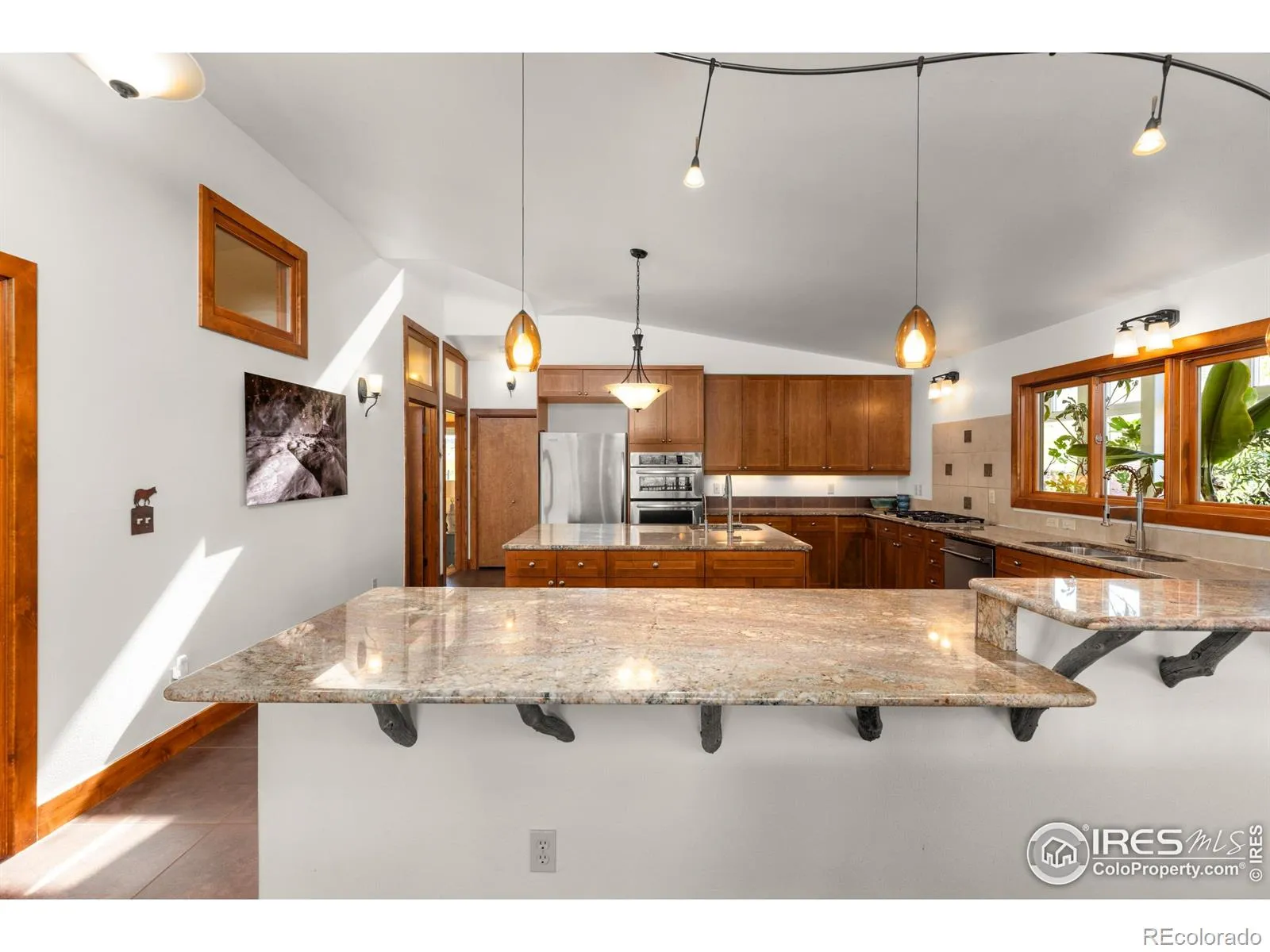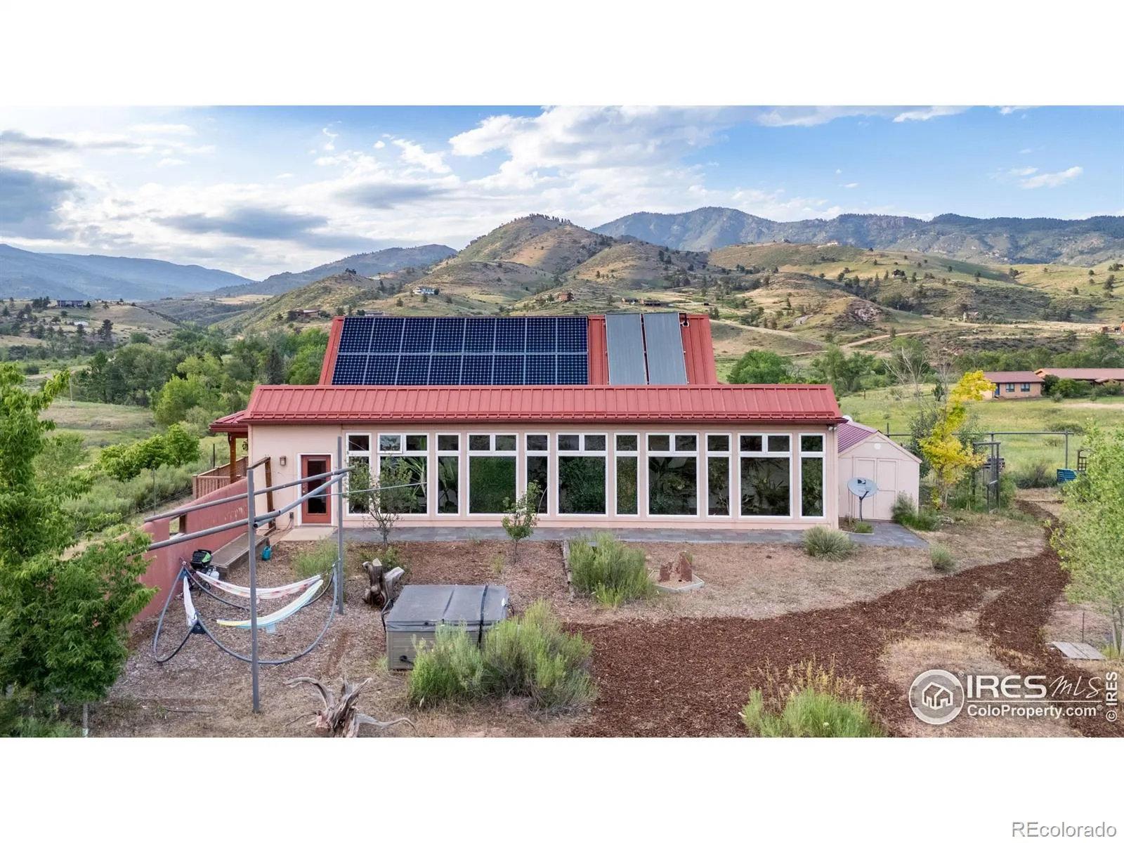 A rare opportunity in the foothills of Lyons, this 13-acre permaculture retreat feels like something out of a dream, but it’s very real and very ready. Designed in consultation with renowned sustainable architect Michael Reynolds of Earthship Biotecture, the home draws inspiration from Earthship principles but is conventionally built, offering the best of both worlds: sustainable design without sacrificing daily comfort, utility, or aesthetics. This 3-bedroom, 3-bath home is a study in off-grid elegance and purposeful design. Vaulted ceilings, expansive windows, and a passive solar layout fill the space with warmth and light. The integrated greenhouse room is a thriving, year-round tropical oasis with mature banana, fig, and olive trees. Interior windows open into the greenhouse room, allowing natural light and lush greenery to serve as a living backdrop to the home’s main living areas, blurring the line between indoors and nature in the most beautiful way. At the heart of the home’s sustainability is a sophisticated rainwater harvesting and purification system. It is more efficient and often more abundant than many of the area’s lower-producing wells. The land itself is level, usable, and quietly pastoral, with panoramic views of Blue Mountain, fenced gardens, a dedicated space for animals or small livestock, and a detached outbuilding ideal for an artist studio or workshop. Convenient two-car attached garage. The Little Thompson River winds along the edge of the property, offering private riverfront access and the soothing sound of water as part of the everyday experience. You don’t just live here. You plant, create, restore, and reconnect. This is a one-of-a-kind property for those who want to live intentionally and beautifully. Less than nine minutes to Planet Bluegrass and the shops and restaurants of downtown Lyons, and under 30 minutes to Boulder or Longmont.