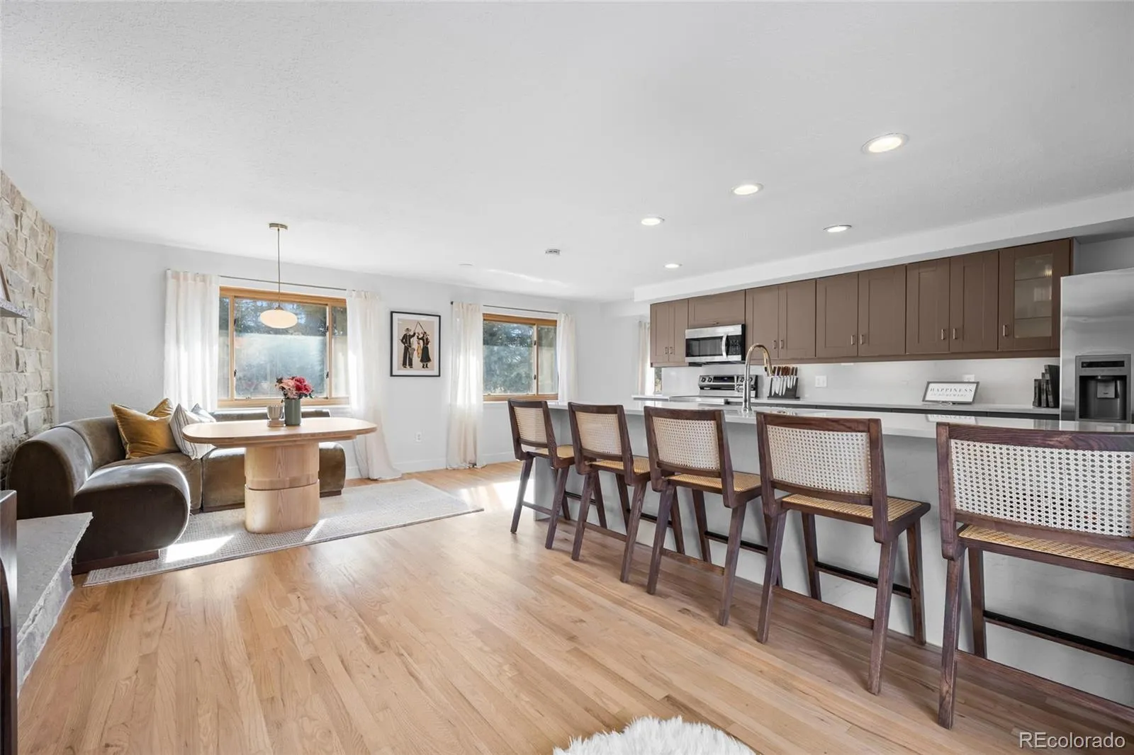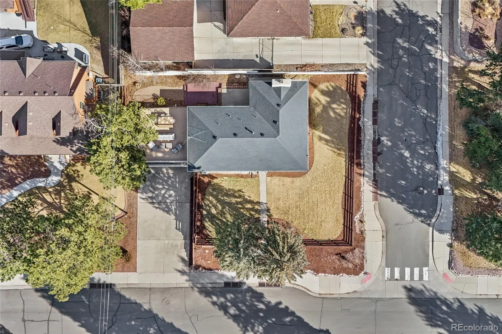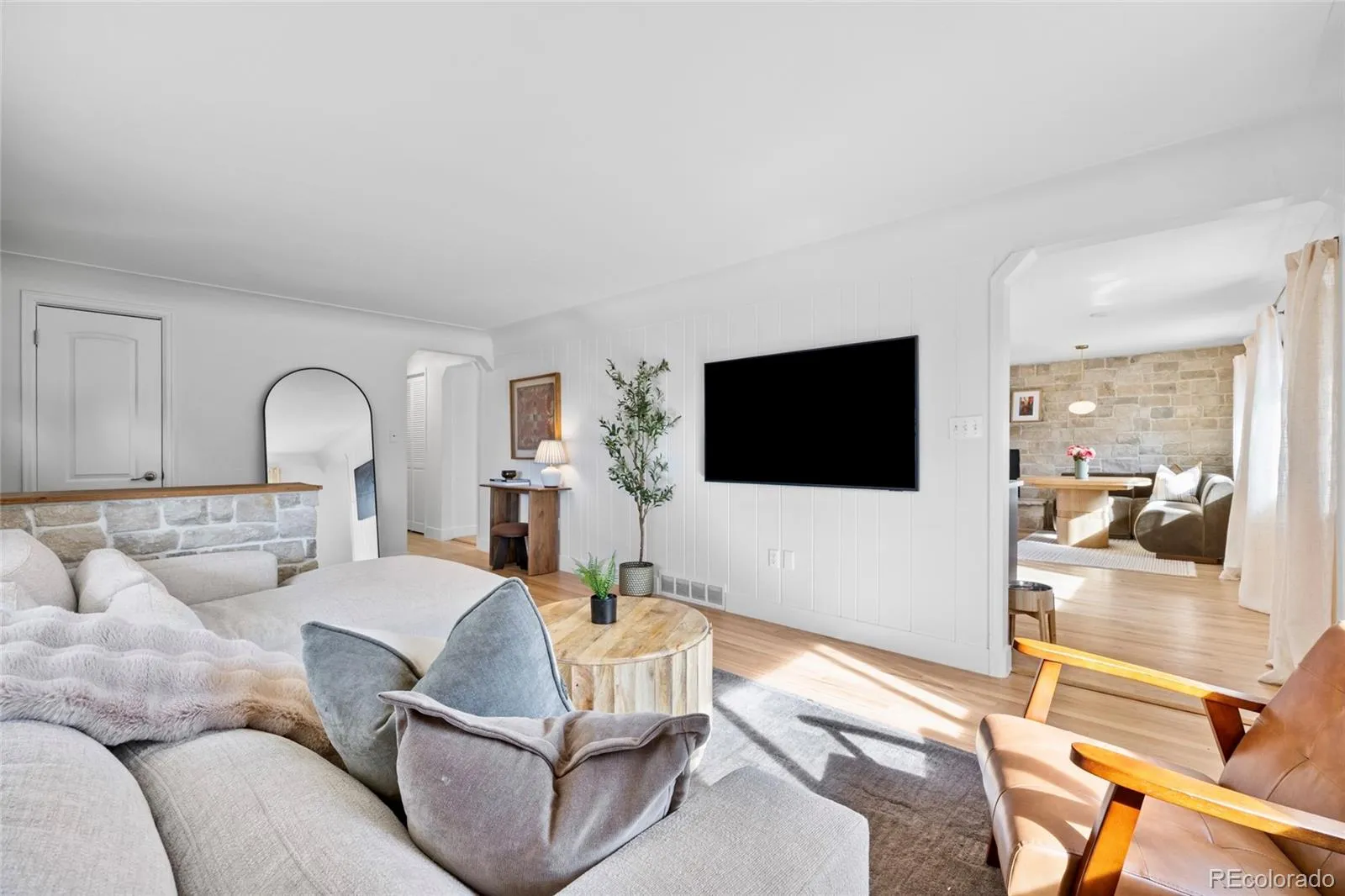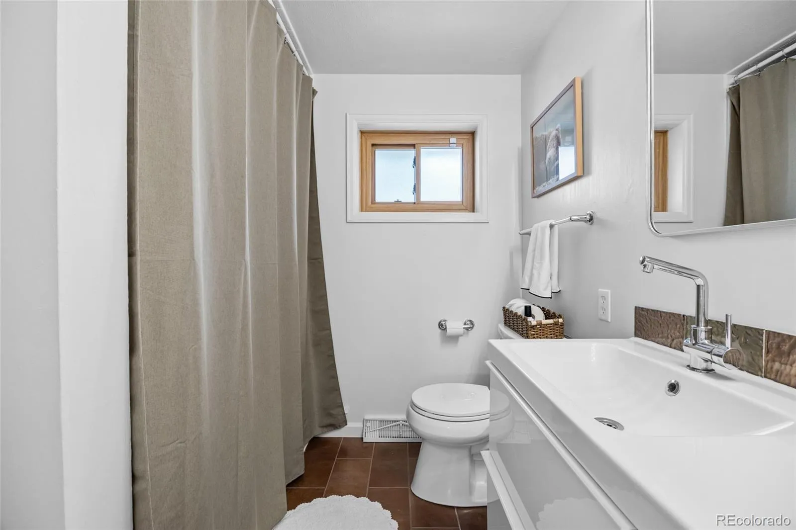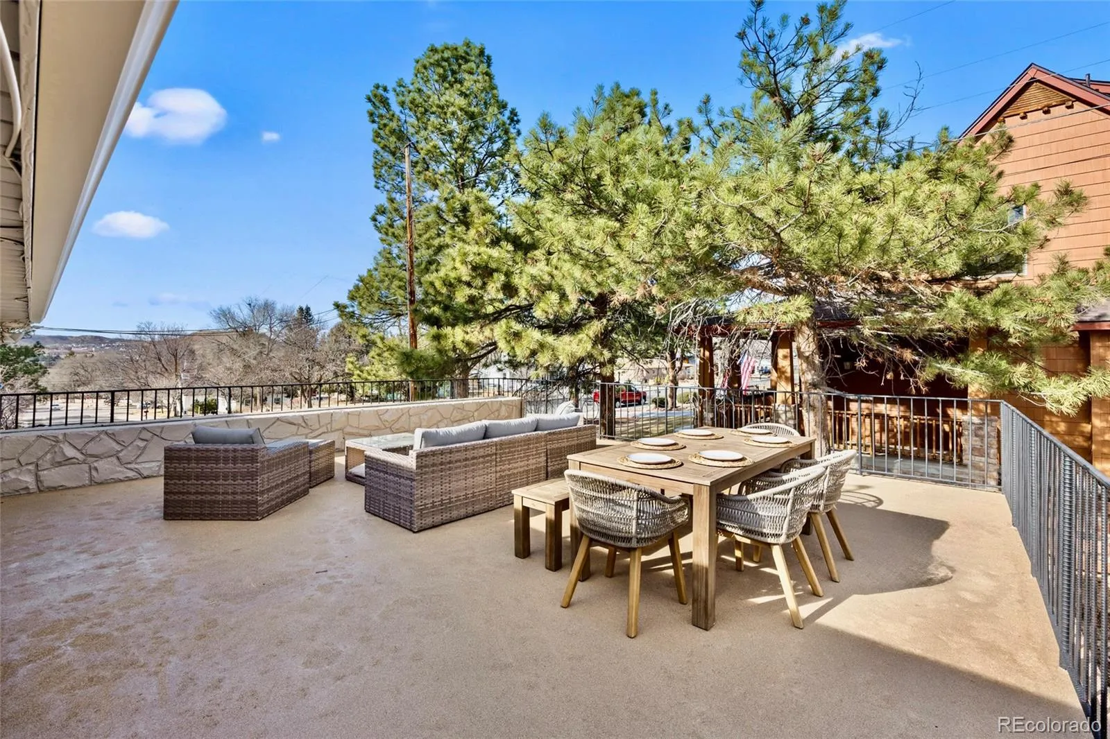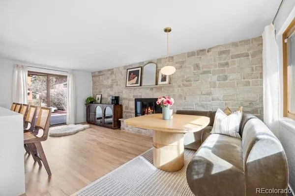 A rare opportunity, this is the mid-century modern home you’ve been awaiting! Architecturally distinctive, thoughtfully updated, an ideally located GEM just steps from vibrant Downtown Castle Rock. Perfectly positioned on a desirable corner lot, this completely redone brick ranch showcases stunning interior and exterior upgrades that elevate its mid-century modern vibe — and best of all, NO HOA. Defined by clean rooflines, expansive windows, and a seamless indoor-outdoor connection, this light-filled home embraces the simplicity and functionality of classic mid-century design while offering today’s most desired finishes. Warm hardwood floors flow throughout the main level, enhancing the open, airy layout. At the heart, the stunningly updated kitchen blends timeless character with modern warm vibes featuring quartz waterfall countertops, range and hood, Bosch dishwasher, and a breathtaking stone wall with gas-burning fireplace anchors the eat-in kitchen and living space exuding warmth and a nod to the home’s roots. Recent improvements include a brand-new roof, fully redone landscaping and fencing, radon mitigation system, and extensive additional upgrades throughout. The thoughtfully designed main level offers three spacious bedrooms and two bathrooms, creating comfortable, convenient single-level living with ample storage. The fully finished functional and expensive basement provides exceptional flexibility with a large rec room, a full bedroom, and a bathroom with walk-in shower- this lower level offers abundant additional living space ideal for guests, multigenerational living, work-from-home needs, with generous storage. Enjoy the picturesque Castle Rock backdrop while entertaining on the HUGE resurface rooftop patio with stunning views of “The Rock” structurally built for future expansion capabilities. Unbeatable walkability to downtown restaurants, boutiques, parks, miles of trails, plus quick access to I-25 and an easy commute to DTC. Welcome home!