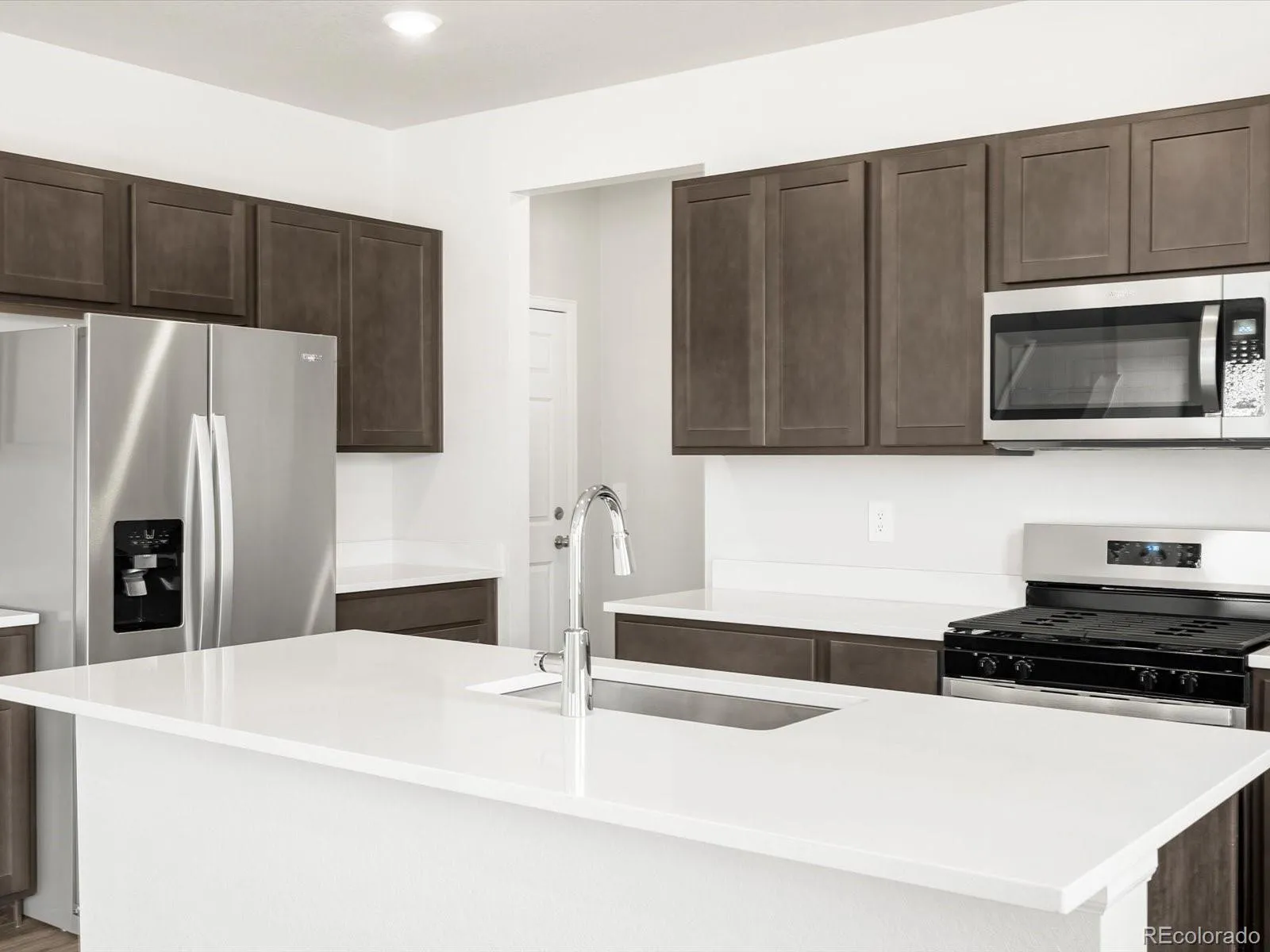Open concept kitchen with quartz countertops and slate cabinets!