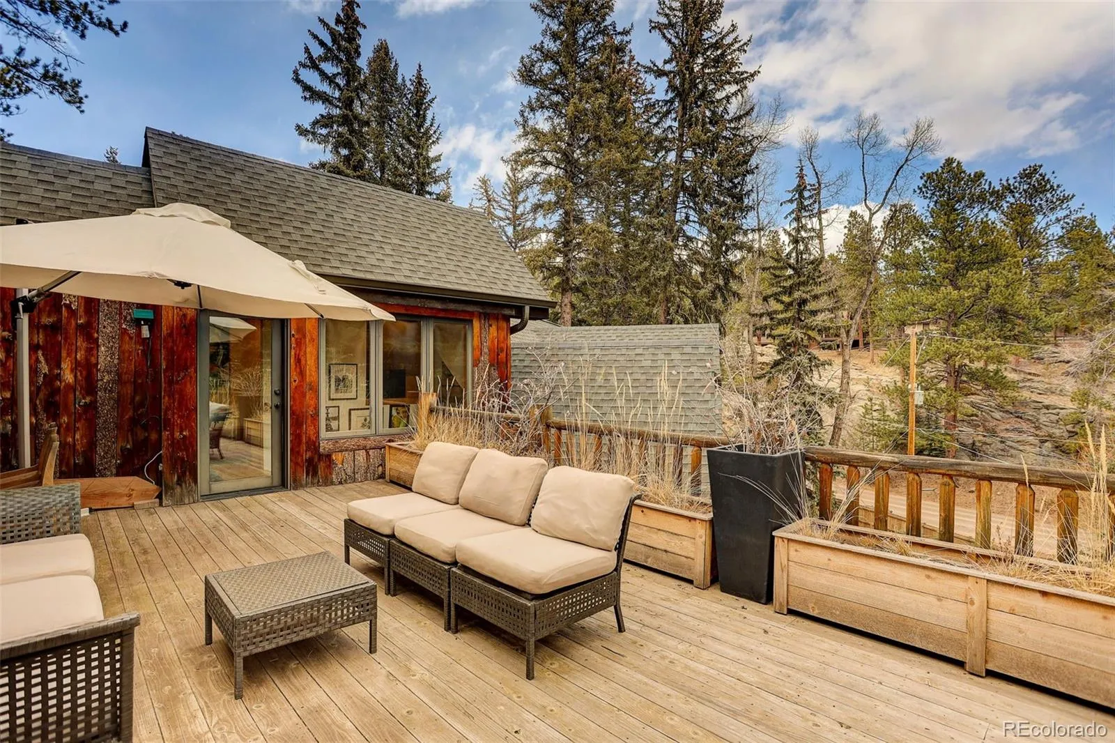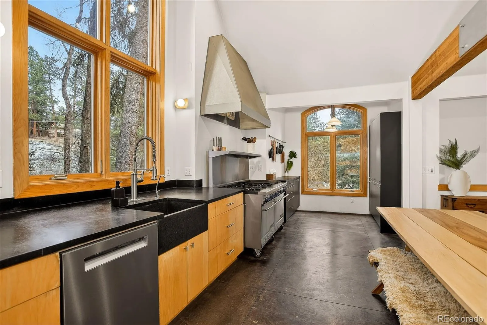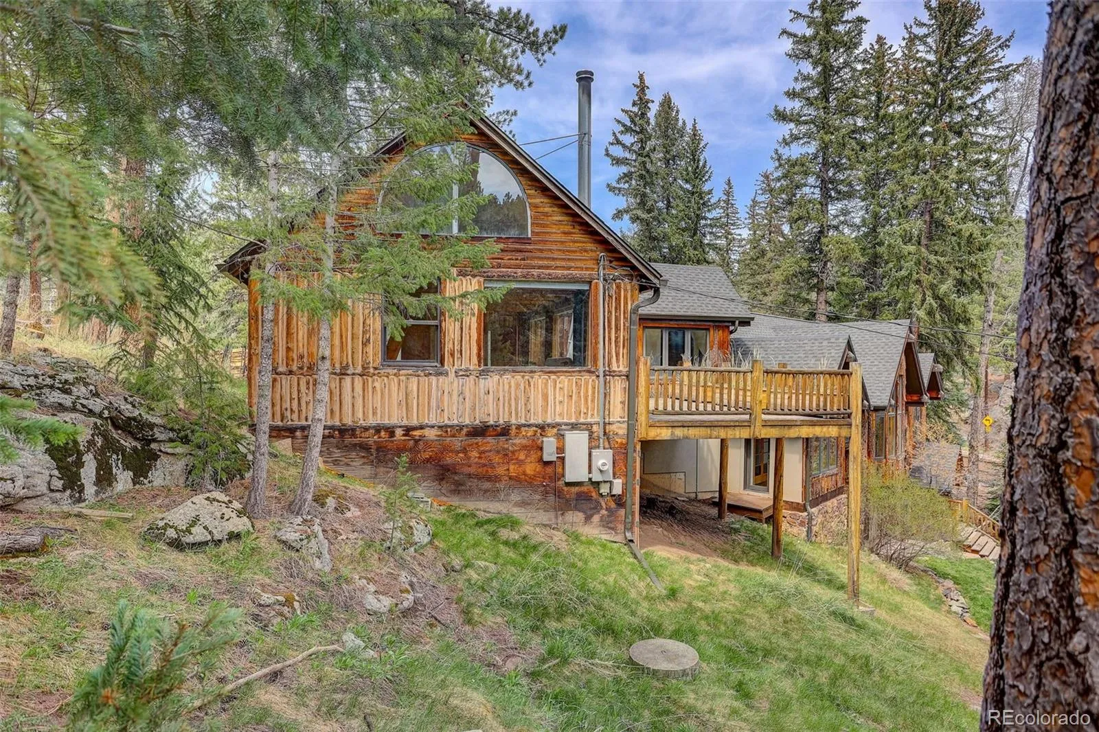 Mountain living meets modern luxury in this truly one of a kind creekside retreat. Listen to the soothing sounds of Turkey Creek and enjoy breathtaking views from every room. From the minute you pull up to this home, you will fall in love. Designed for both comfort and entertaining, the open-concept floor plan is filled with natural light. The chef’s kitchen is a showpiece, featuring a commercial grade double-oven range, stainless steel appliances, an abundance of cabinets, and stunning soapstone countertops. The living room is impressive with vaulted ceilings, a cozy fireplace and a new Pella sliding glass door that opens to a spacious new deck with a built-in outdoor dining space, private, peaceful, and perfect for enjoying Colorado’s outdoor lifestyle. You will love the year round creek location, the sound is so relaxing. Bedrooms are thoughtfully placed on every level, offering privacy and flexibility for family and guests. The upper-level primary suite is a spa-like sanctuary with a loft, private deck, and tranquil ambiance. The primary suite was part of the original cabin before this property underwent a complete renovation. This space blends historic charm with a complete modern transformation. Work from home buyers will appreciate the dedicated office space, plus a versatile bonus area currently used as a family room, ideal as a second office, yoga studio, or fitness room. Renovated bathrooms also feature soapstone countertops, and polished concrete floors with radiant heat, adding warmth and character. Pet friendly features include an invisible fence and a three panel dog door, allowing convenient indoor-outdoor access while keeping pets safely on the property. This property is special. The views from every room are unbelievable. Serene and beautiful, the perfect retreat and just 10 minutes to Downtown Evergreen and close to Denver for the buyer who needs to commute for work. Don’t miss seeing this one of a kind property.