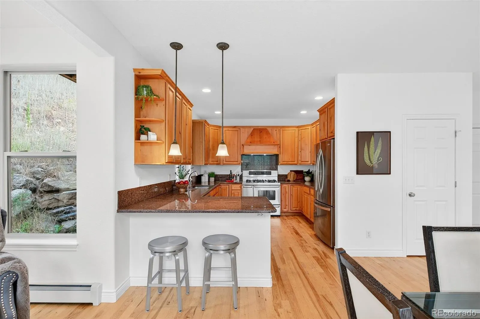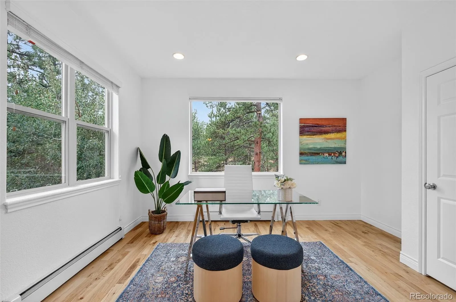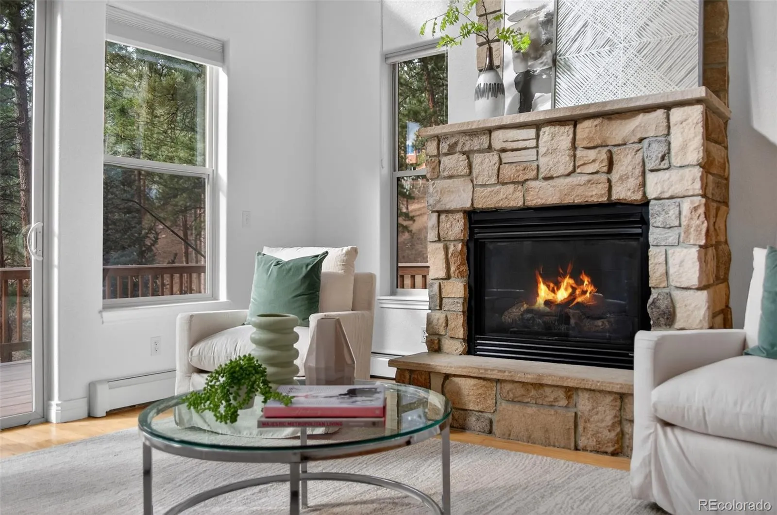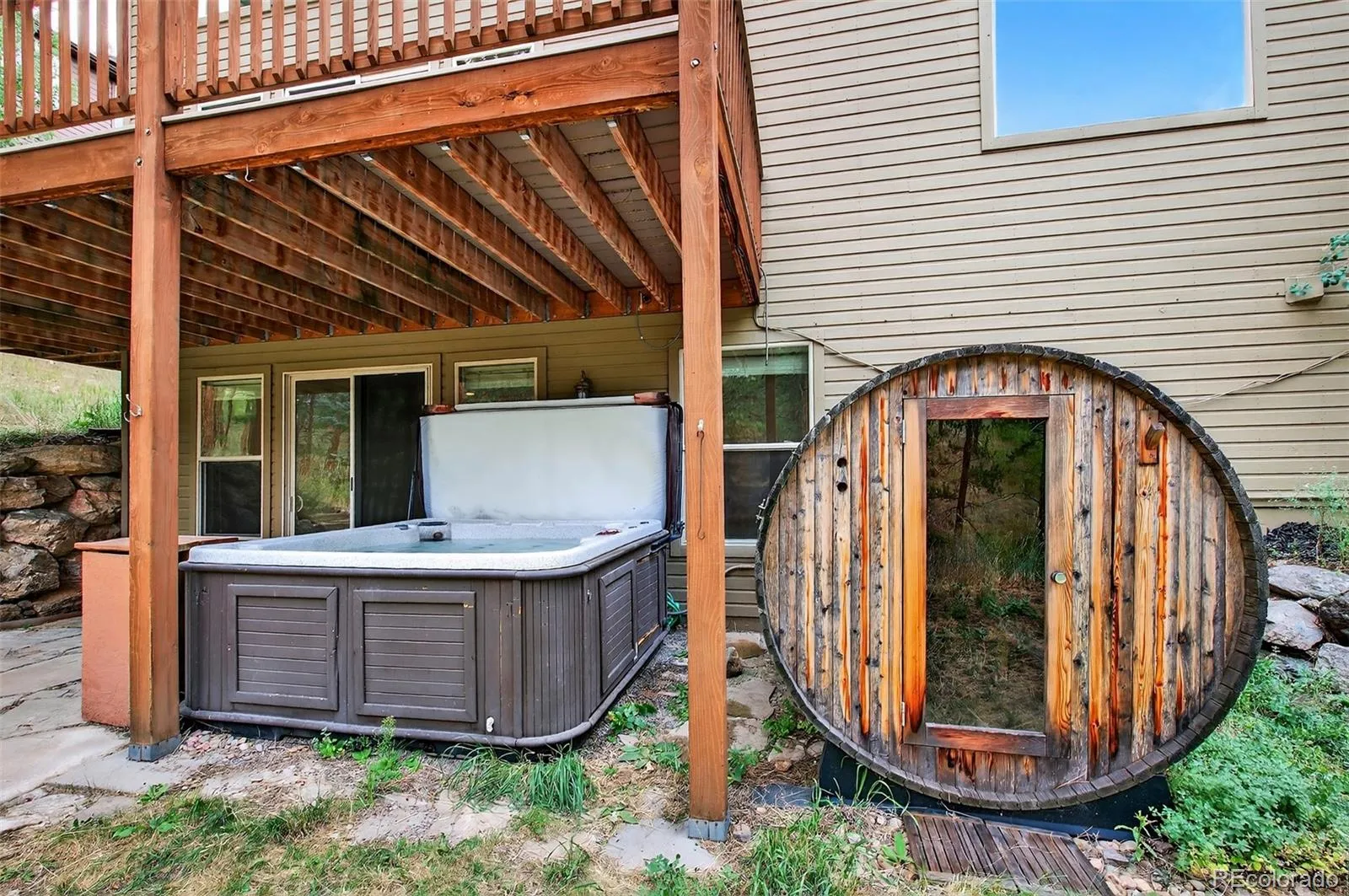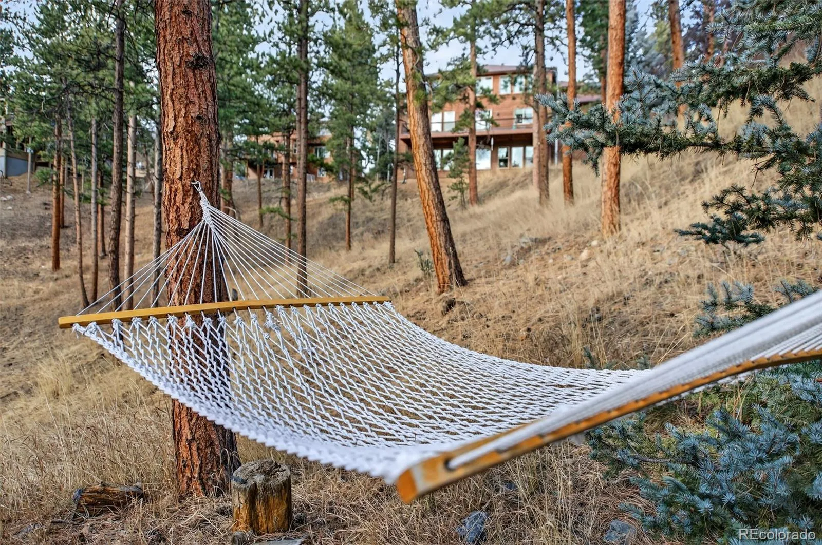 Step into this stunning mountain home where soaring ceilings, expansive windows, and sweeping views create an immediate sense of space and light. The two-story living room is anchored by a dramatic floor-to-ceiling stacked stone fireplace and connects seamlessly to the kitchen and dining areas, ideal for both everyday living and entertaining. The kitchen features stainless steel appliances, alder cabinetry, granite countertops, and hickory flooring, flowing into a casual dining space. A formal dining room sits just off the entry, along with a private office with French doors—easily adaptable as a main-floor bedroom with access to a full bath. Just off the living area, a spacious deck is perfect for morning coffee, evening meals, and gatherings with mountain views. Recent updates include fresh designer paint throughout and brand-new plush carpet upstairs and in the walk-out basement, giving the home a crisp, move-in ready feel. Upstairs, the primary suite offers incredible views, a five-piece bath, and a large walk-in closet. Two additional bedrooms share a Jack-and-Jill bath, and a versatile loft provides space for an office, reading nook, playroom, or fitness area. The bright walk-out lower level includes a pool table area, fourth bedroom, full bath, and a large unfinished section with a partially finished room—perfect for a gym, media room, or studio. An oversized three-car garage with tandem third bay offers high ceilings and great storage. The private yard features a sauna, hot tub, and seating area for a true mountain retreat. New roof installed August 2023. Located minutes from Downtown Evergreen with easy access to shops, dining, and outdoor recreation, including Lair O’ the Bear Park (4.5 miles), Red Rocks (15 minutes), Denver (45 minutes), DIA (1 hour 20 minutes), and skiing within 1.5 hours. *** PHOTOS DON’T DO THIS HOME JUSTICE … SCHEDULE A SHOWING OR HIT THE OPEN HOUSE SAT FEB 21, 12:00 – 2:00 PM ***